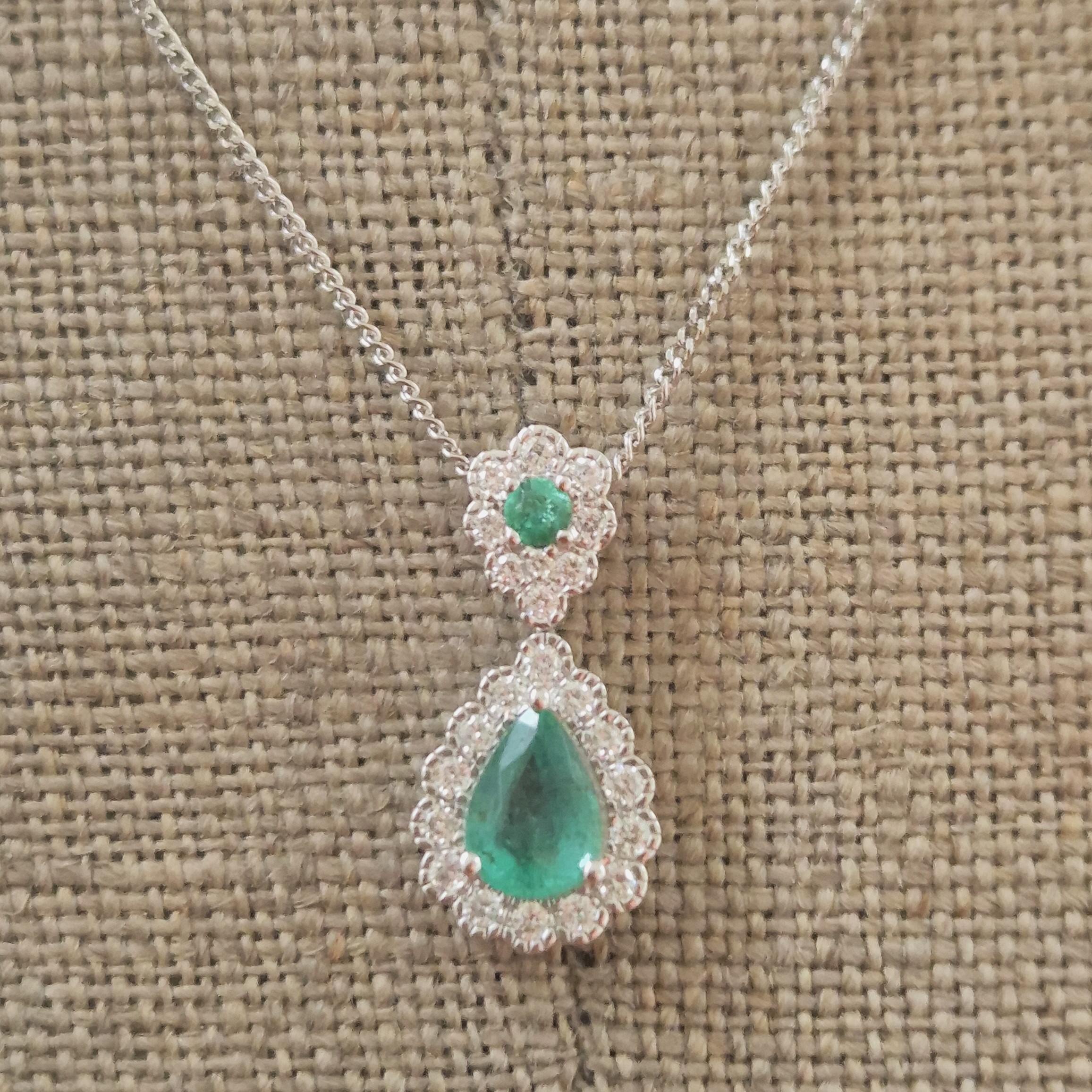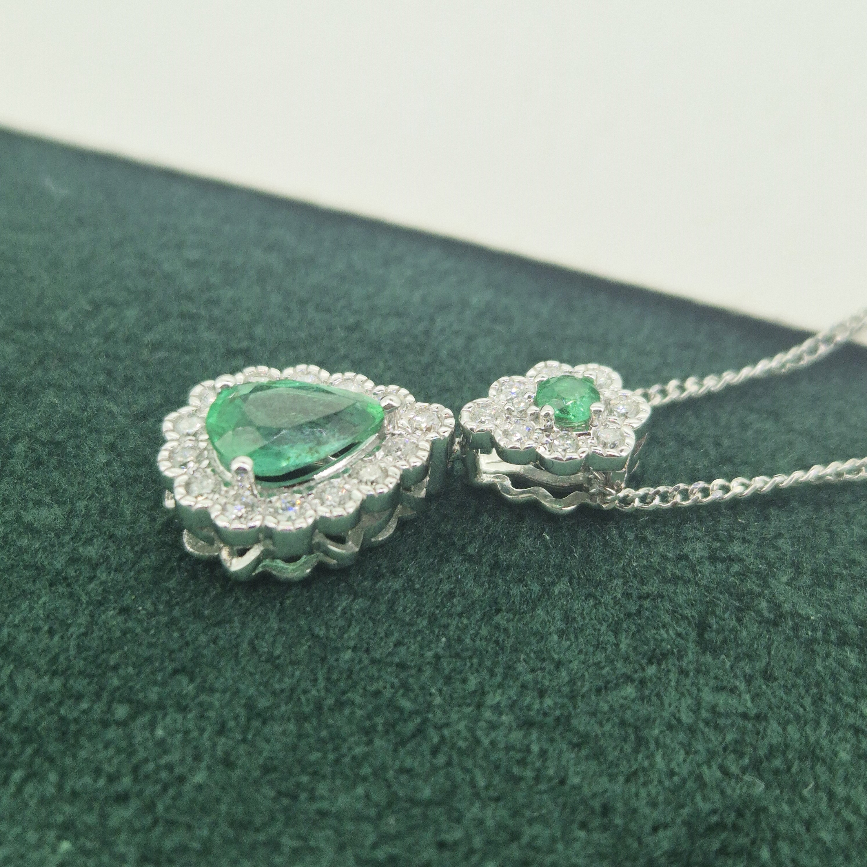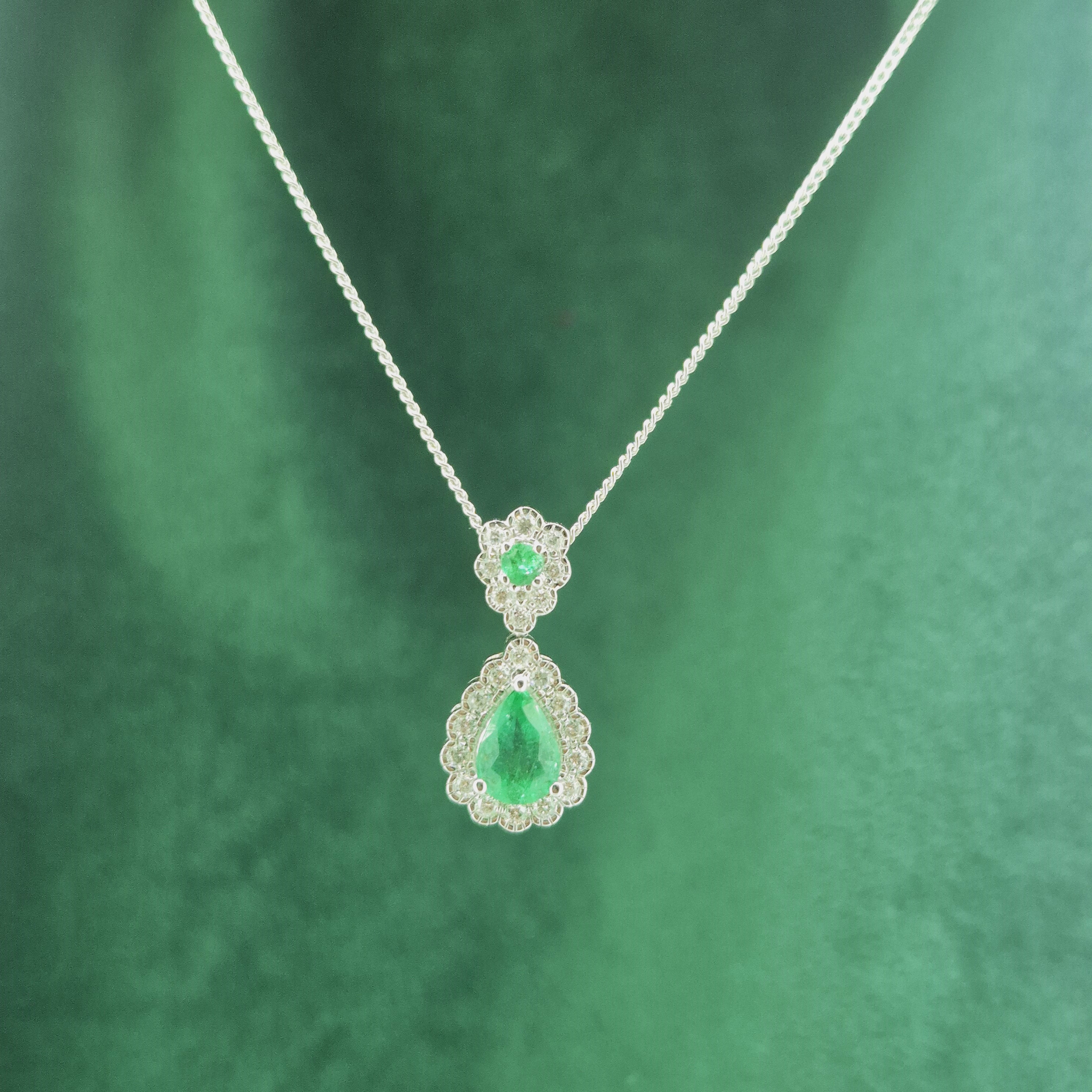 The pendant features a Pear Shape Emerald that measures 7mm by 5mm, that weighs 0.60cts. This Emerald is surrounded by Round Brilliant Diamonds that are further detailed by a milgrain edge. This drops from a a smaller Emerald ad Diamond Cluster that features a Round Emerald that is surrounded by Diamonds. The Diamond weight is 0.25cts.
