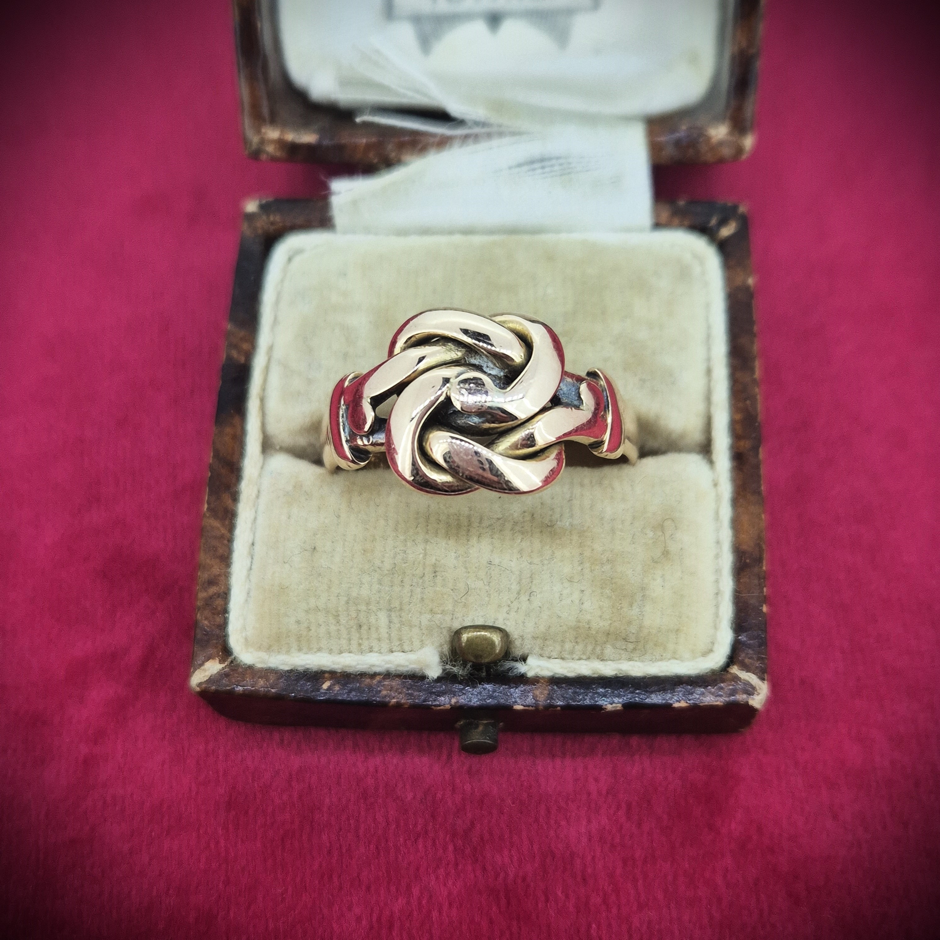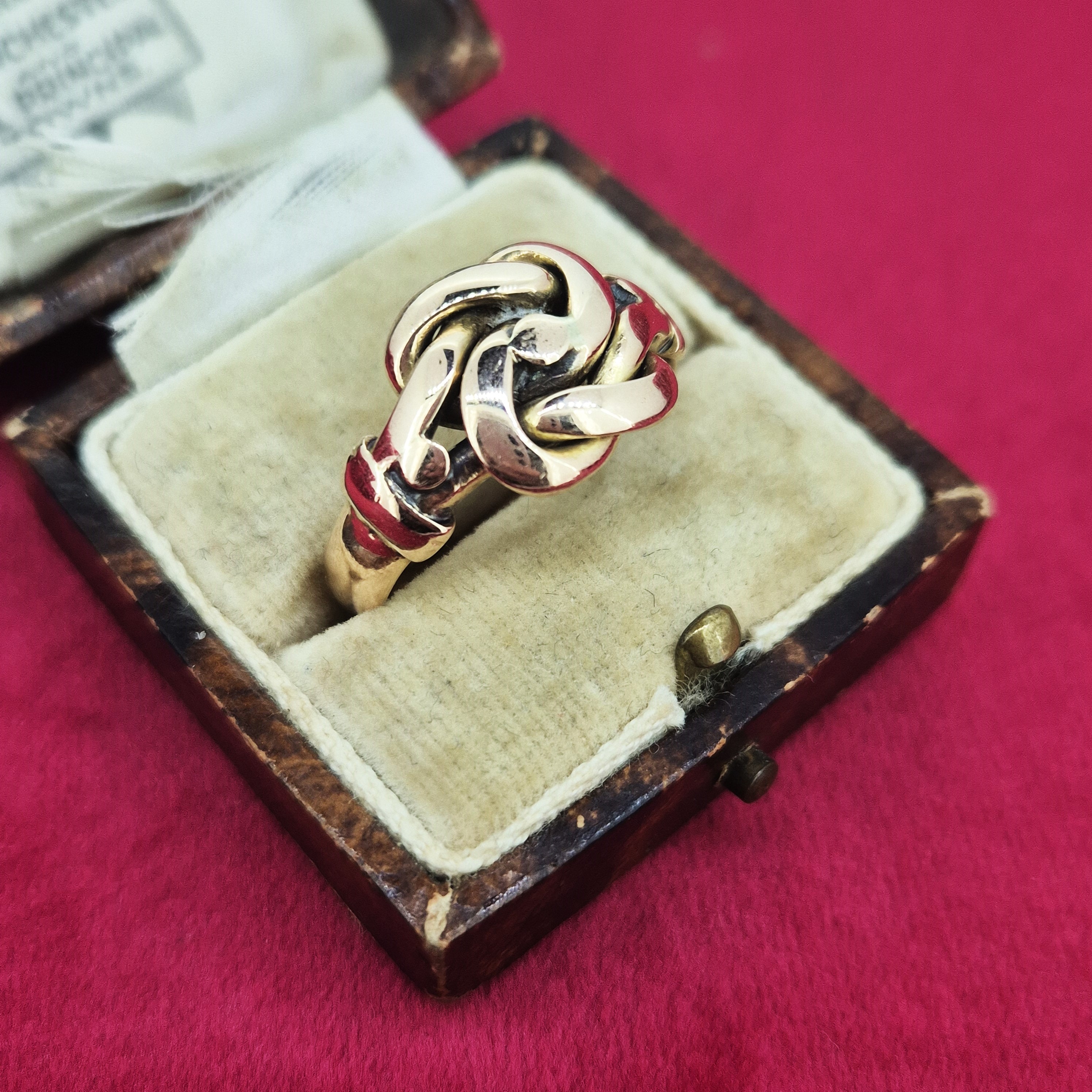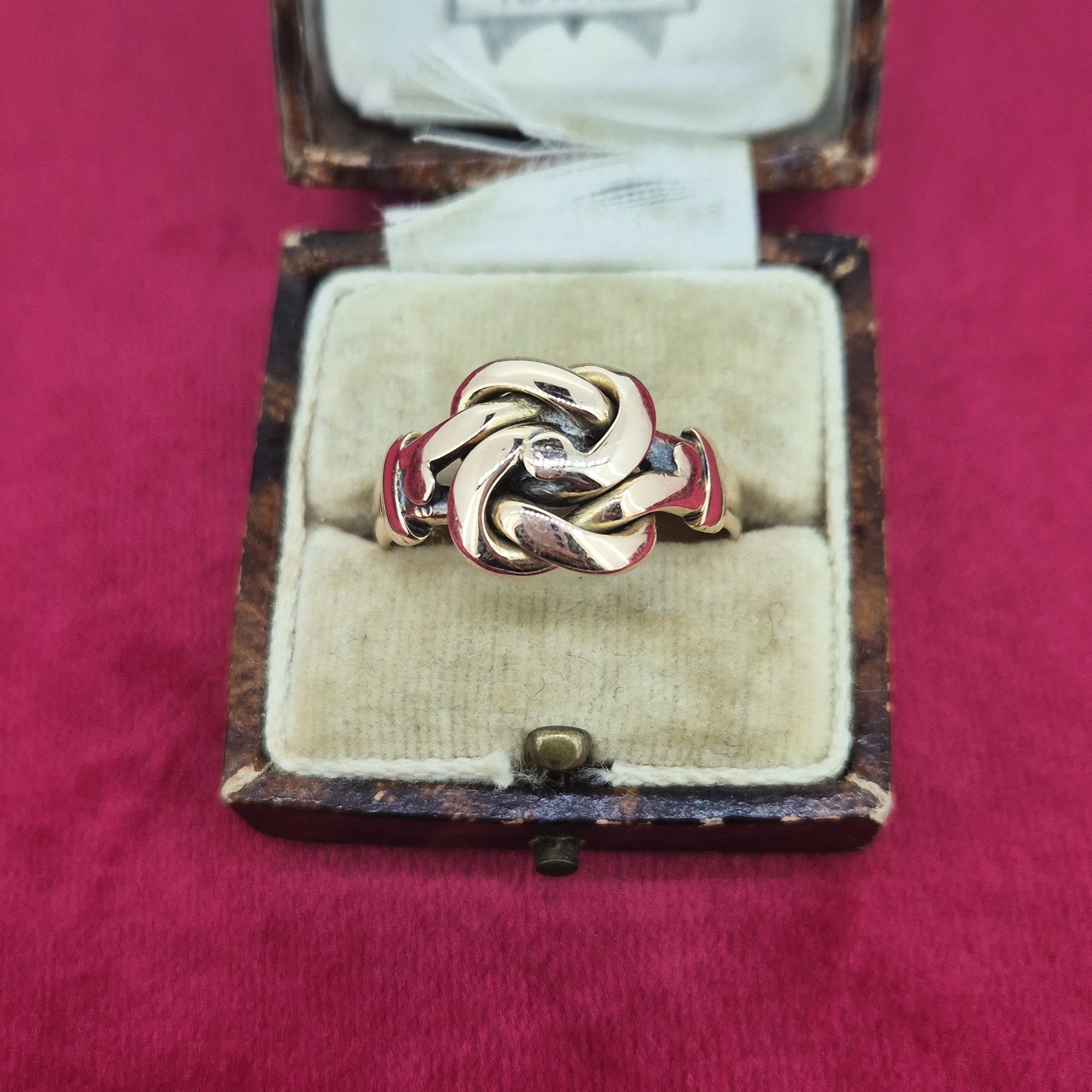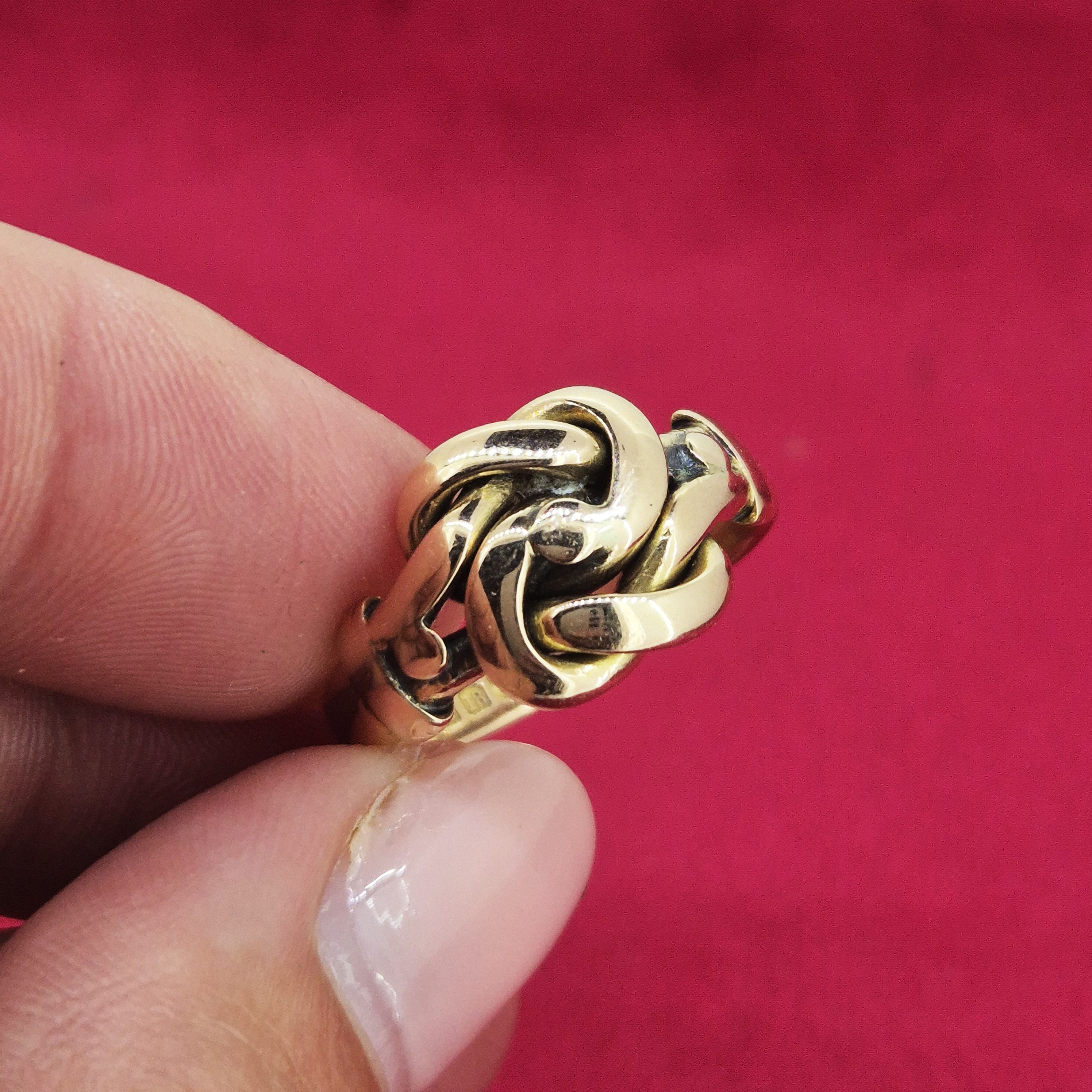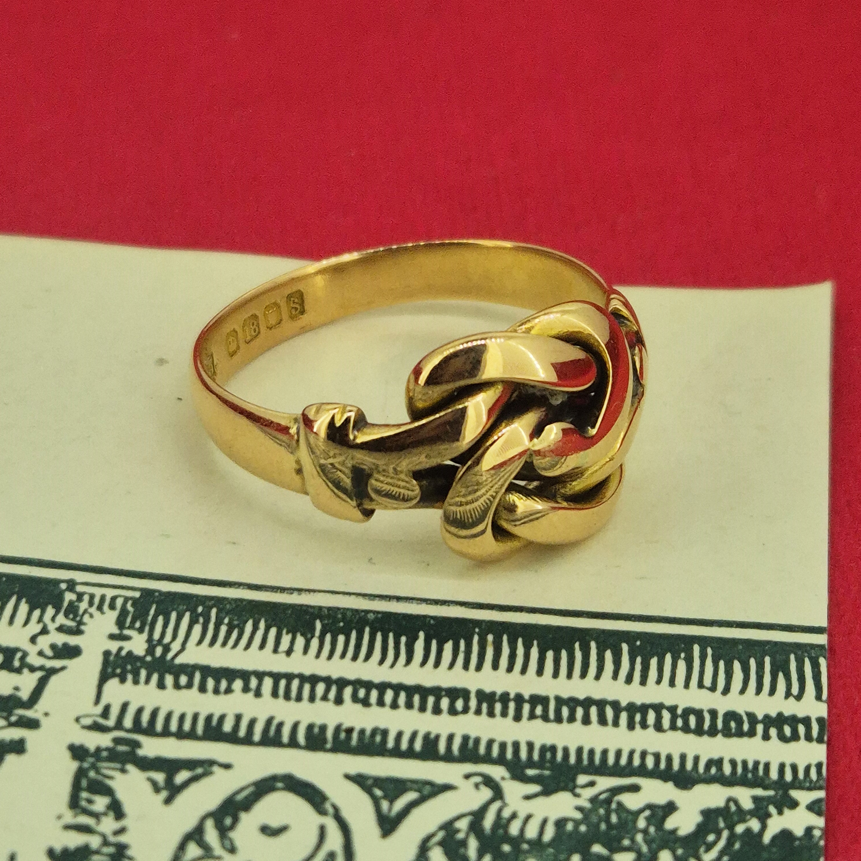 The ring has an intricate knot design and the style is suggestive of a lovers or Celtic knot of which are symbolic of love, unity and eternity.