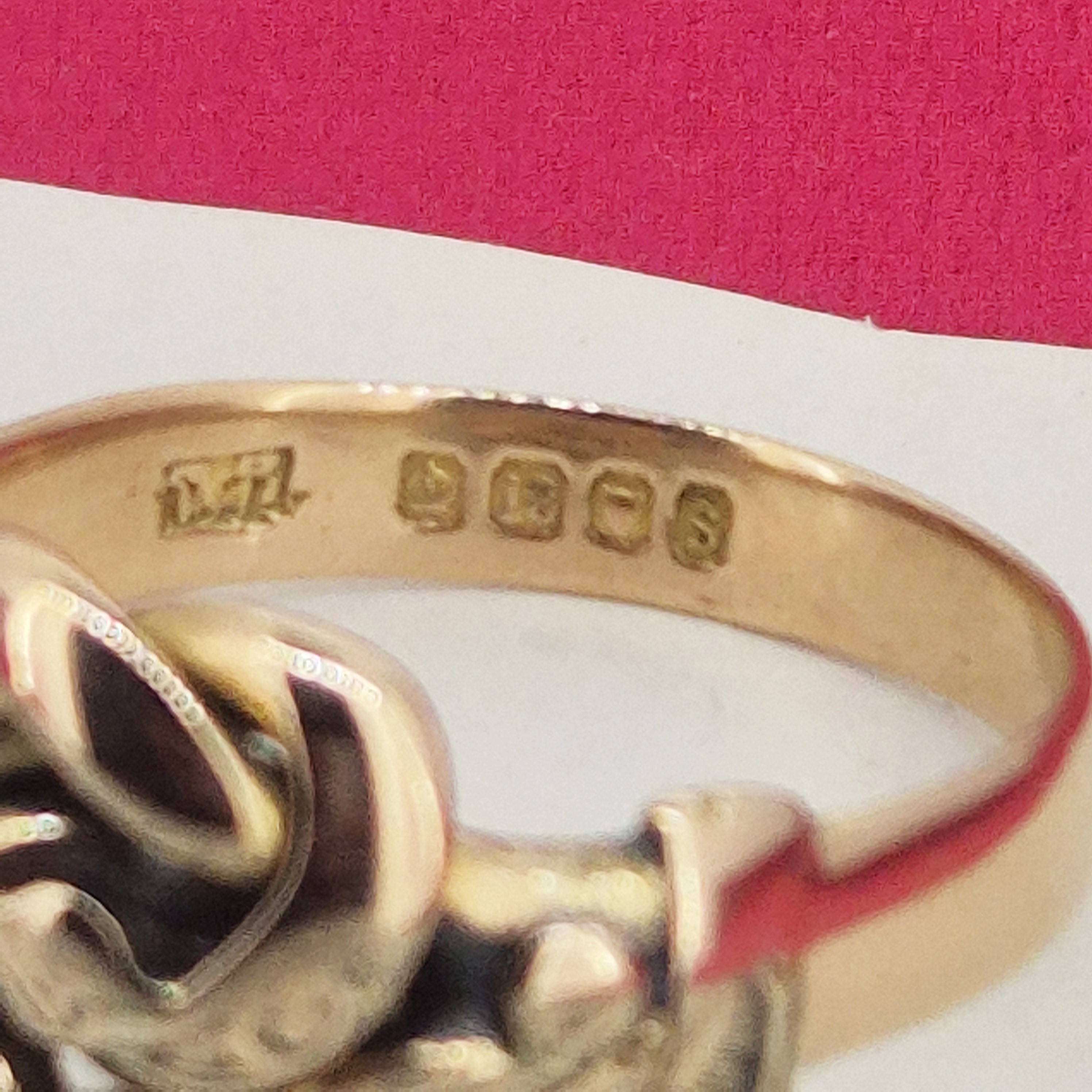 The ring has a beautifully intact hallmark, indicating that it was hallmarked in London during 1913. It weighs 7.9 grams, is currently a Size T and could be sized slightly. We would want to mind that hallmark though.