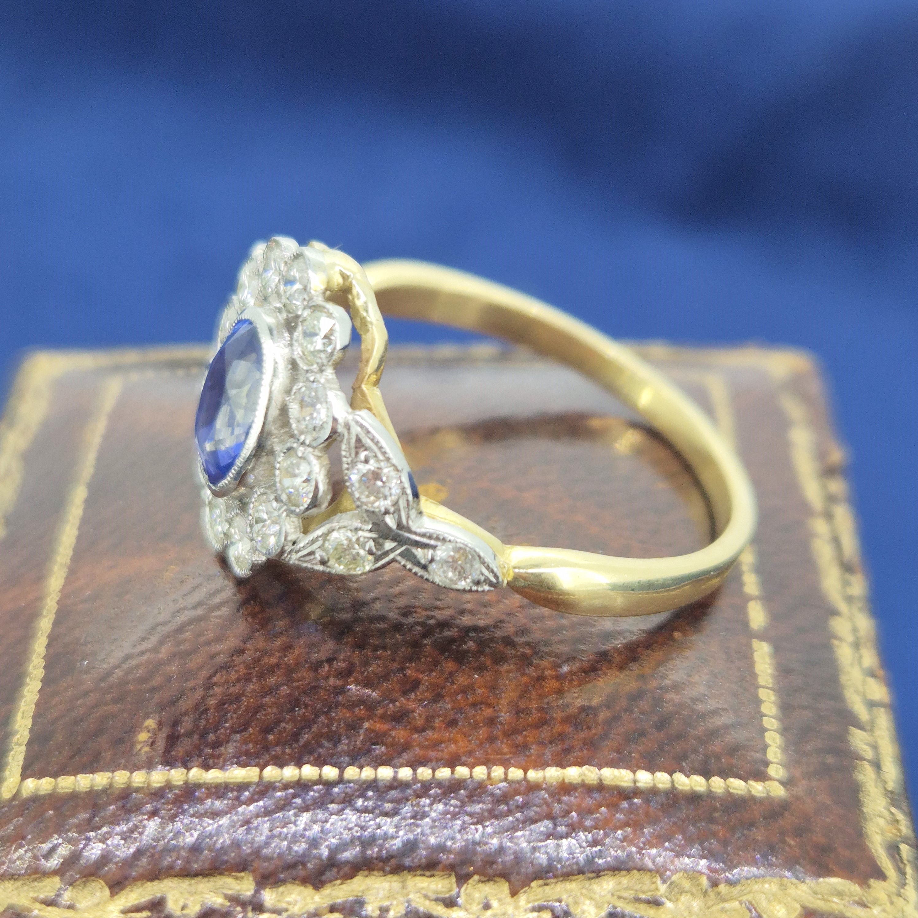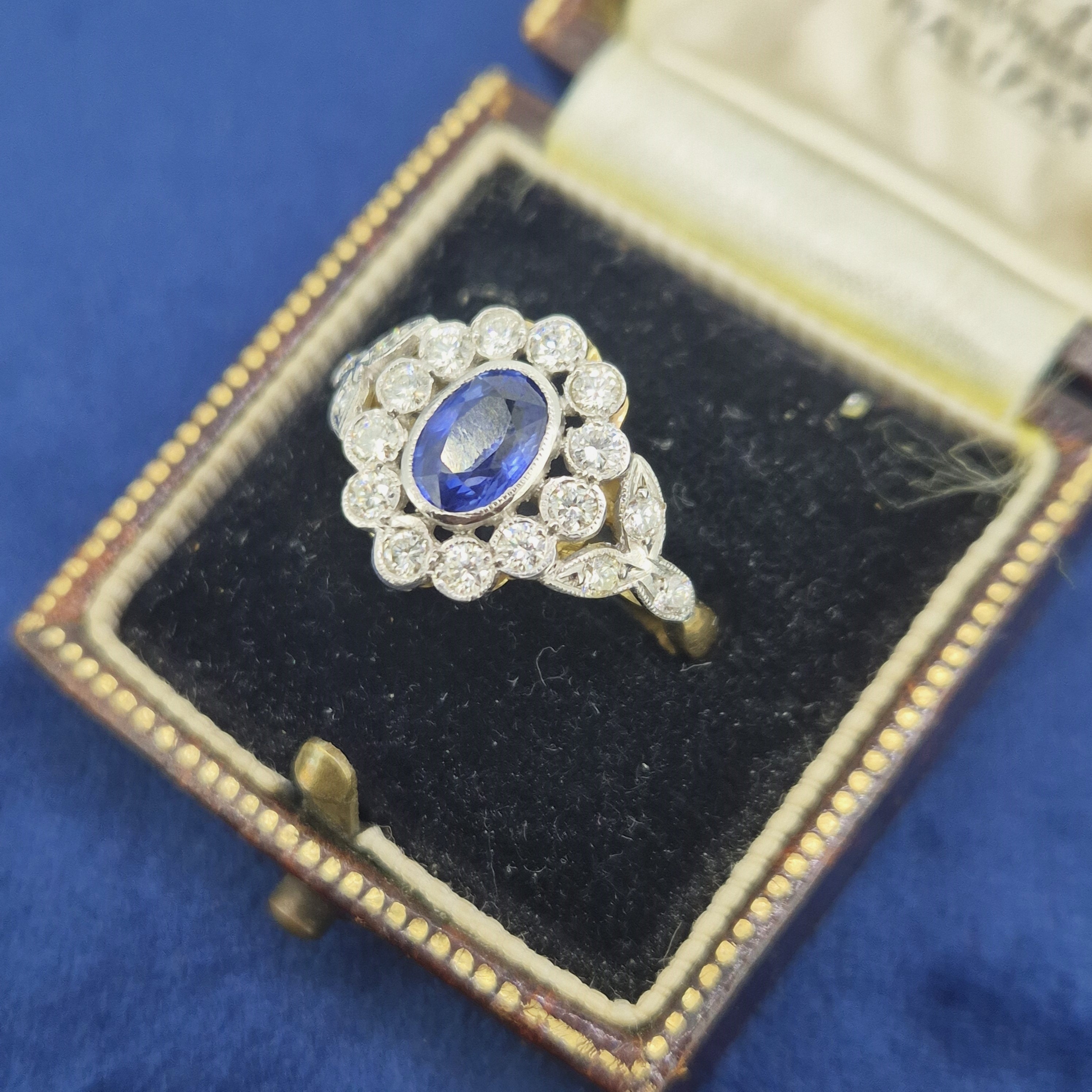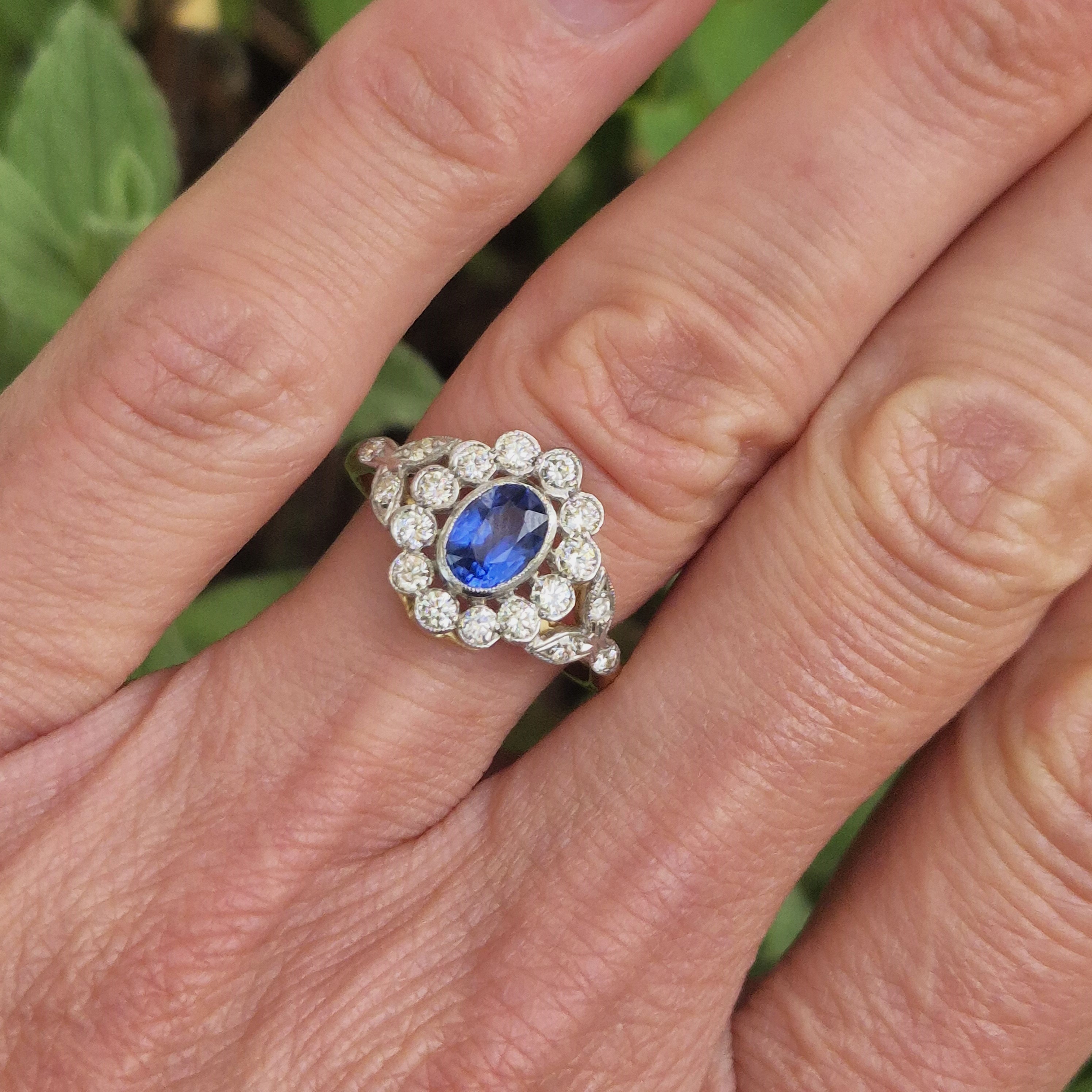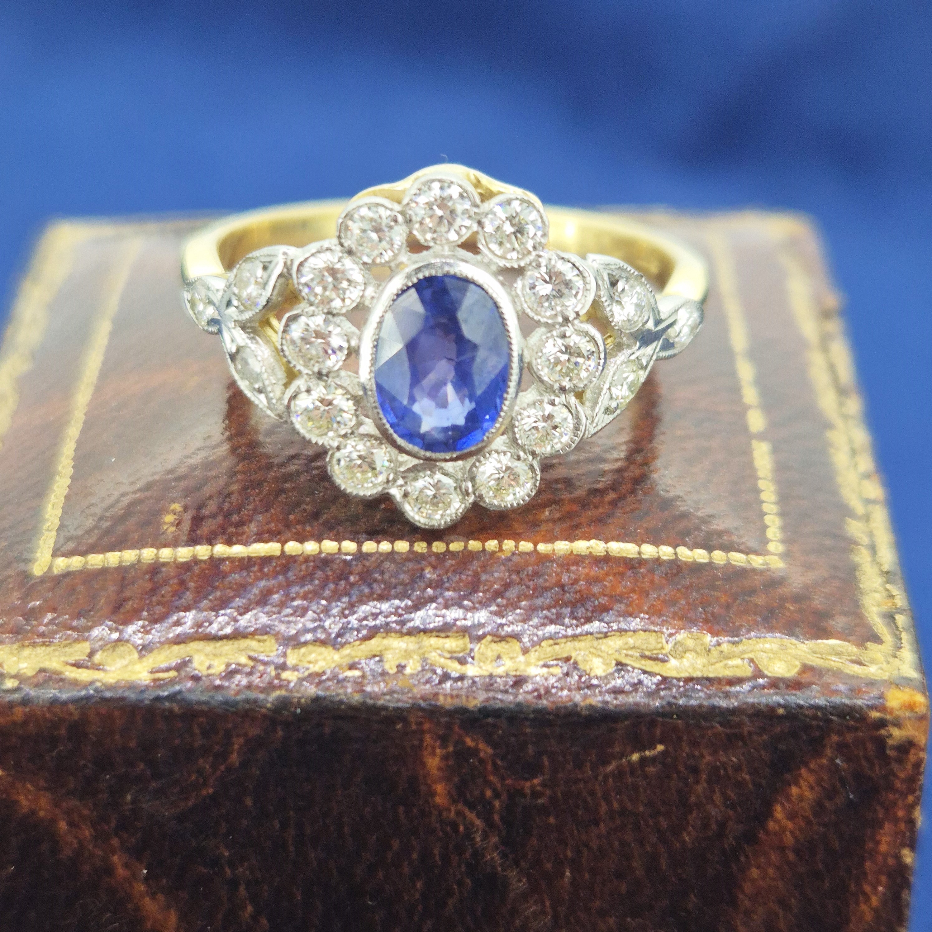 This ring features a striking Oval Sapphire that measures 7mm by 5mm, weighing 1.00cts in the centre. This Sapphire is surrounded by a halo of Round Brilliant Diamonds that are set in a scalloped, flower-like design that enhance the Sapphire's lovely blue colour.