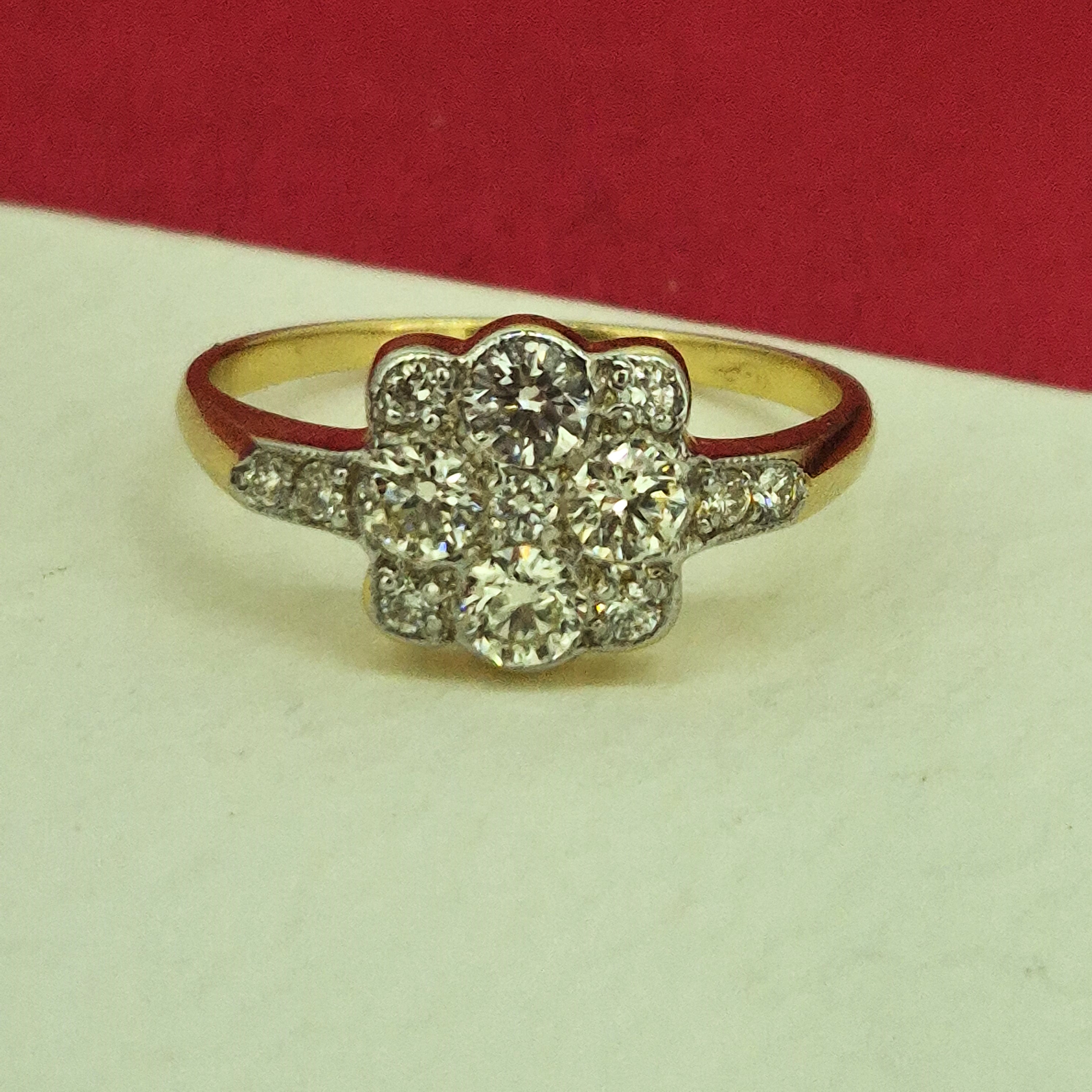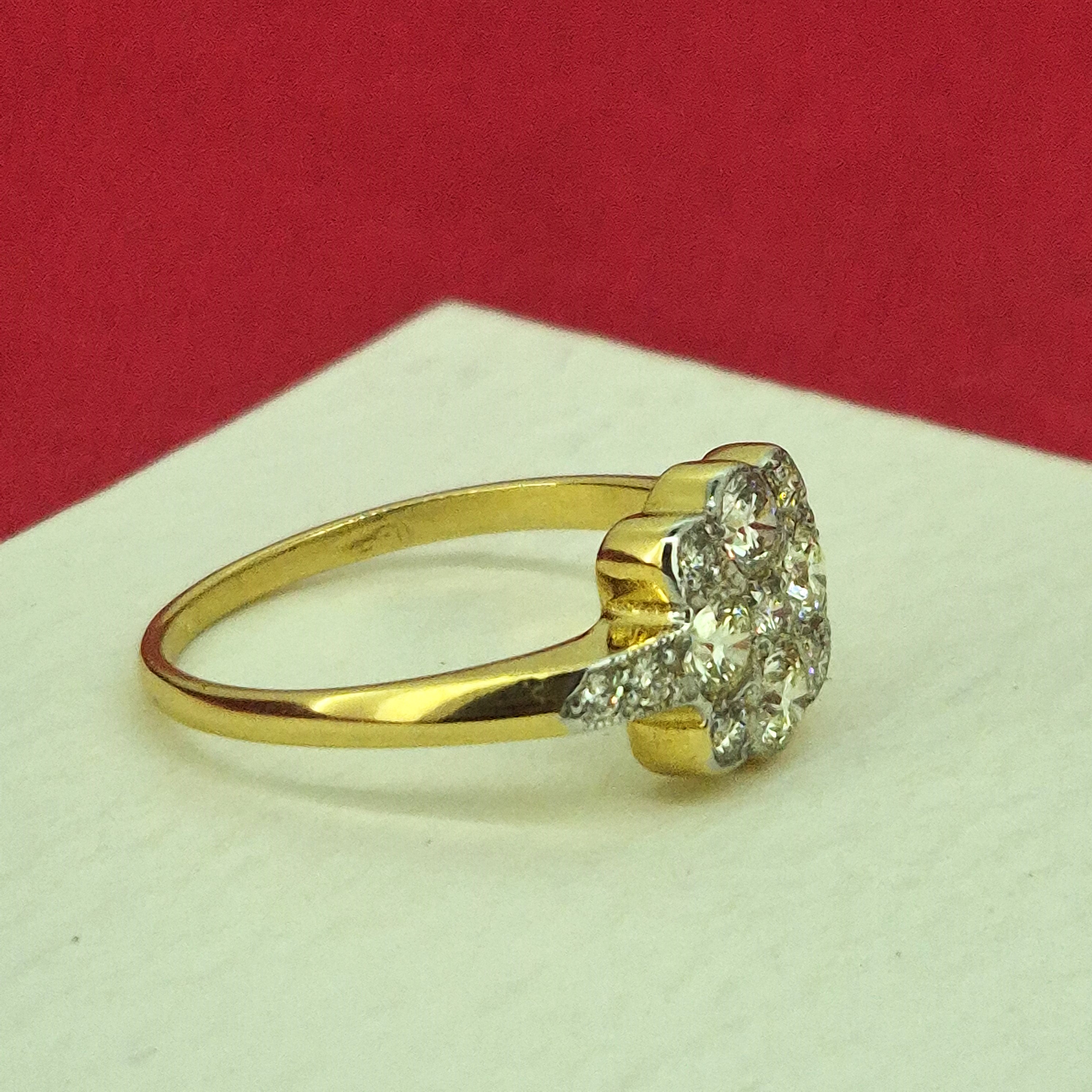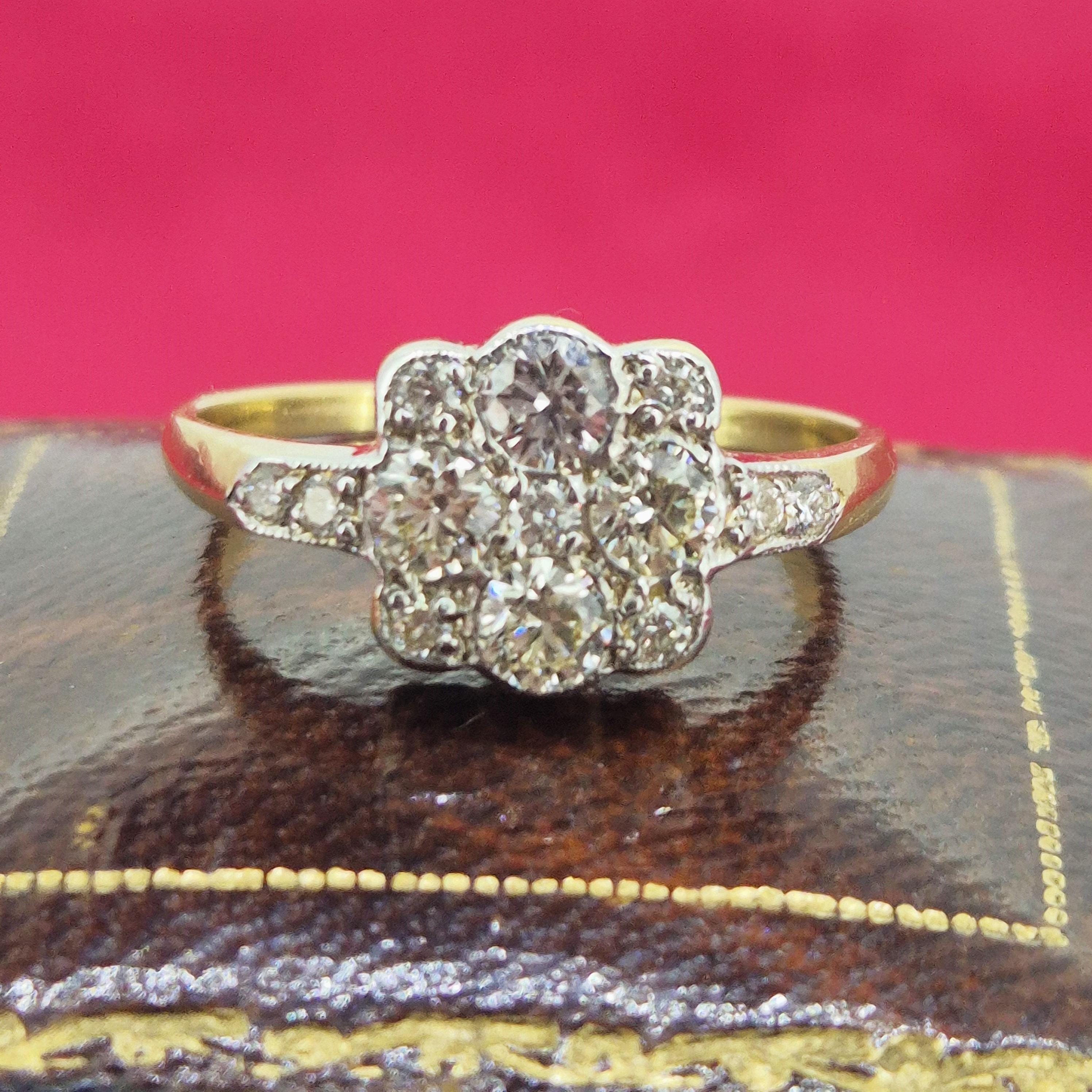 The ring features a cluster of small Round Brilliant Diamonds with four larger Diamonds set at N, E, S, W points of the ring. These Diamonds are further detailed by two Diamonds set into the shank at either side. The total Diamond weight is 0.75cts.