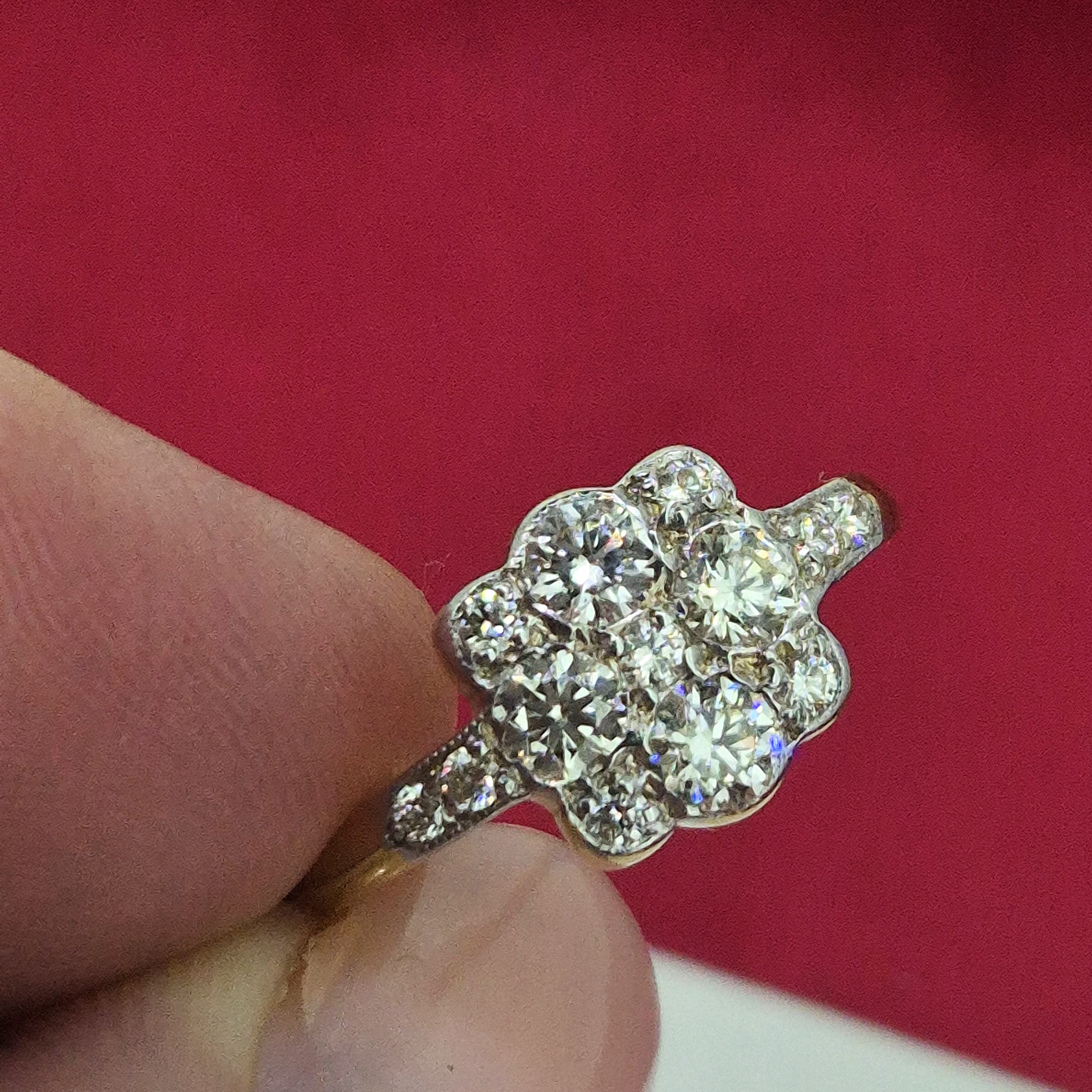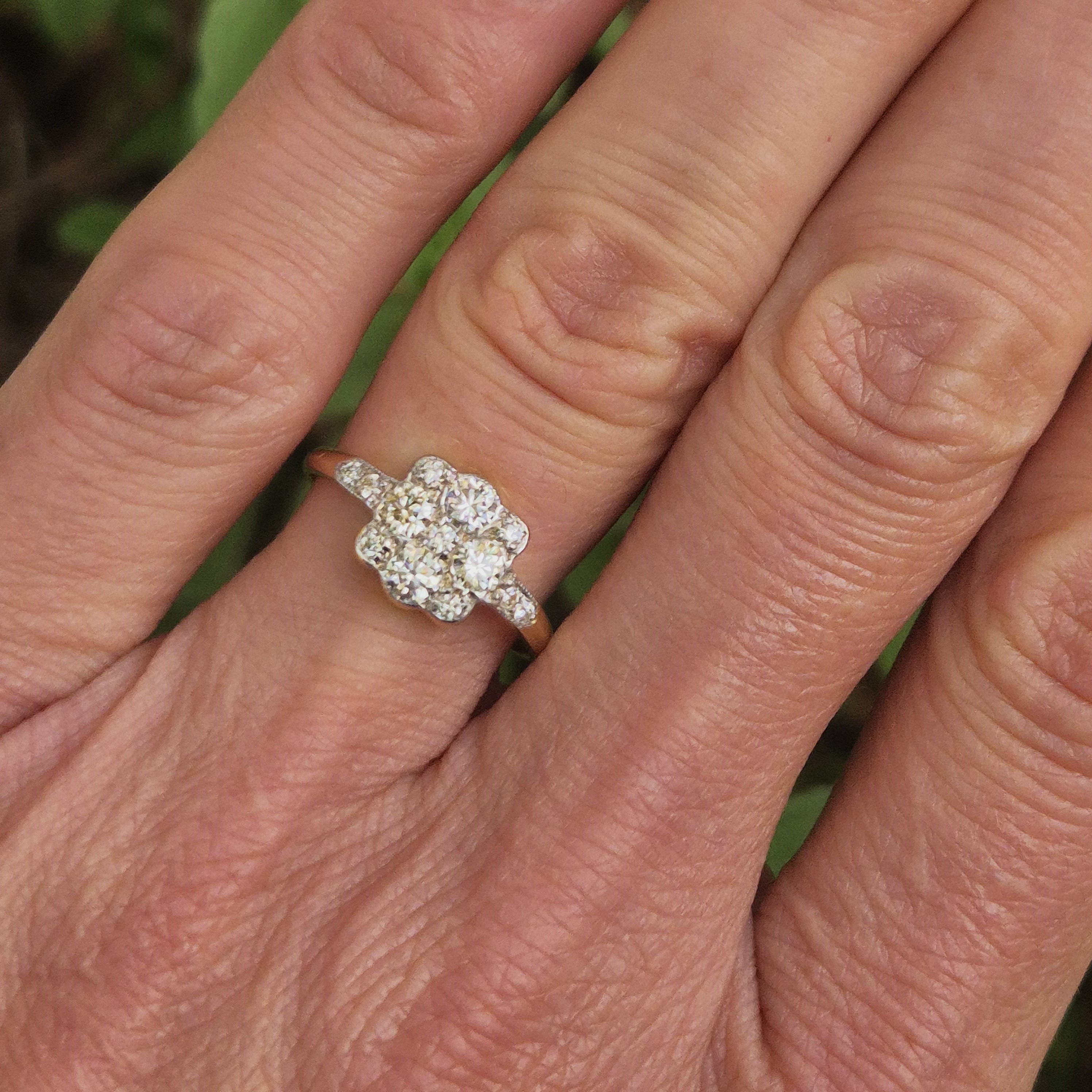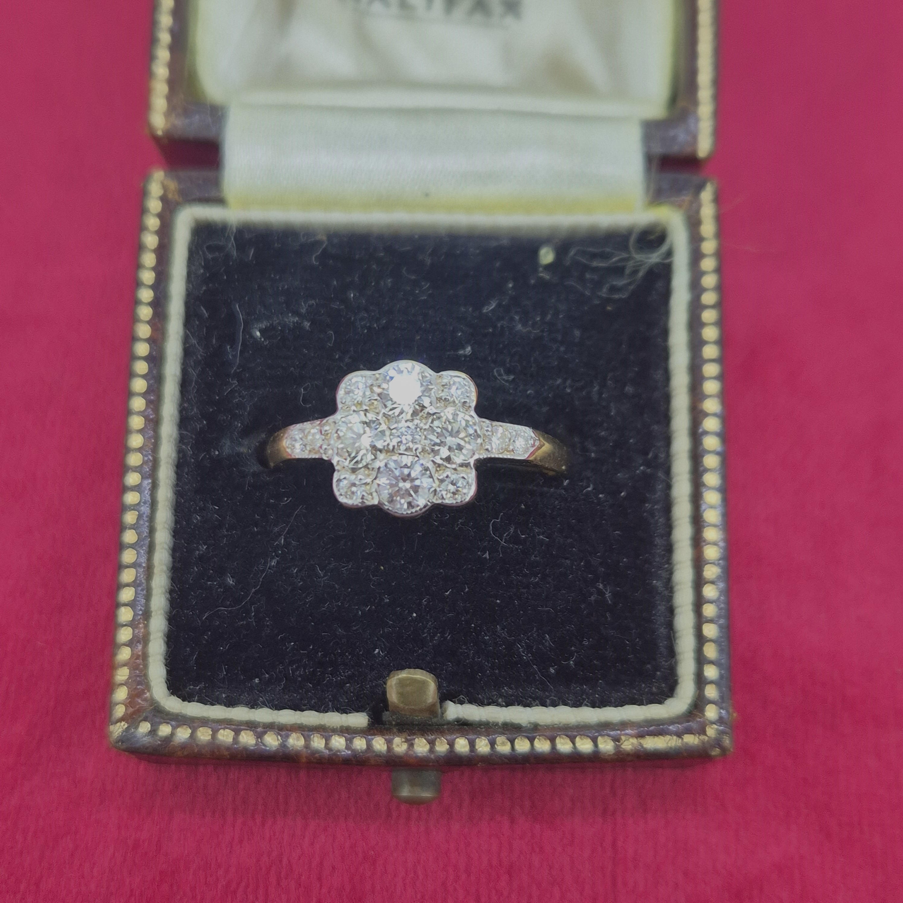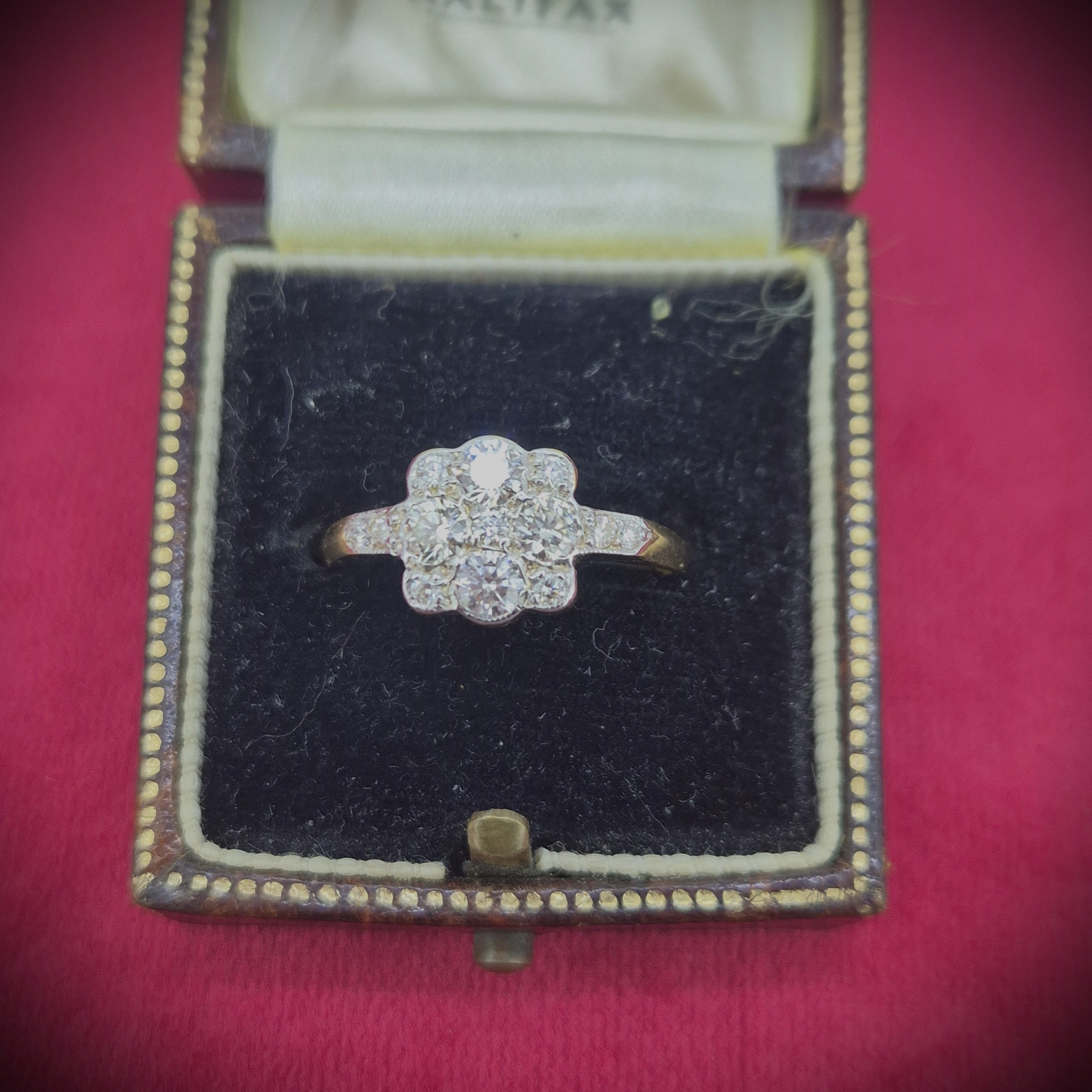 The ring features a cluster of small Round Brilliant Diamonds with four larger Diamonds set at N, E, S, W points of the ring. These Diamonds are further detailed by two Diamonds set into the shank at either side. The total Diamond weight is 0.75cts.