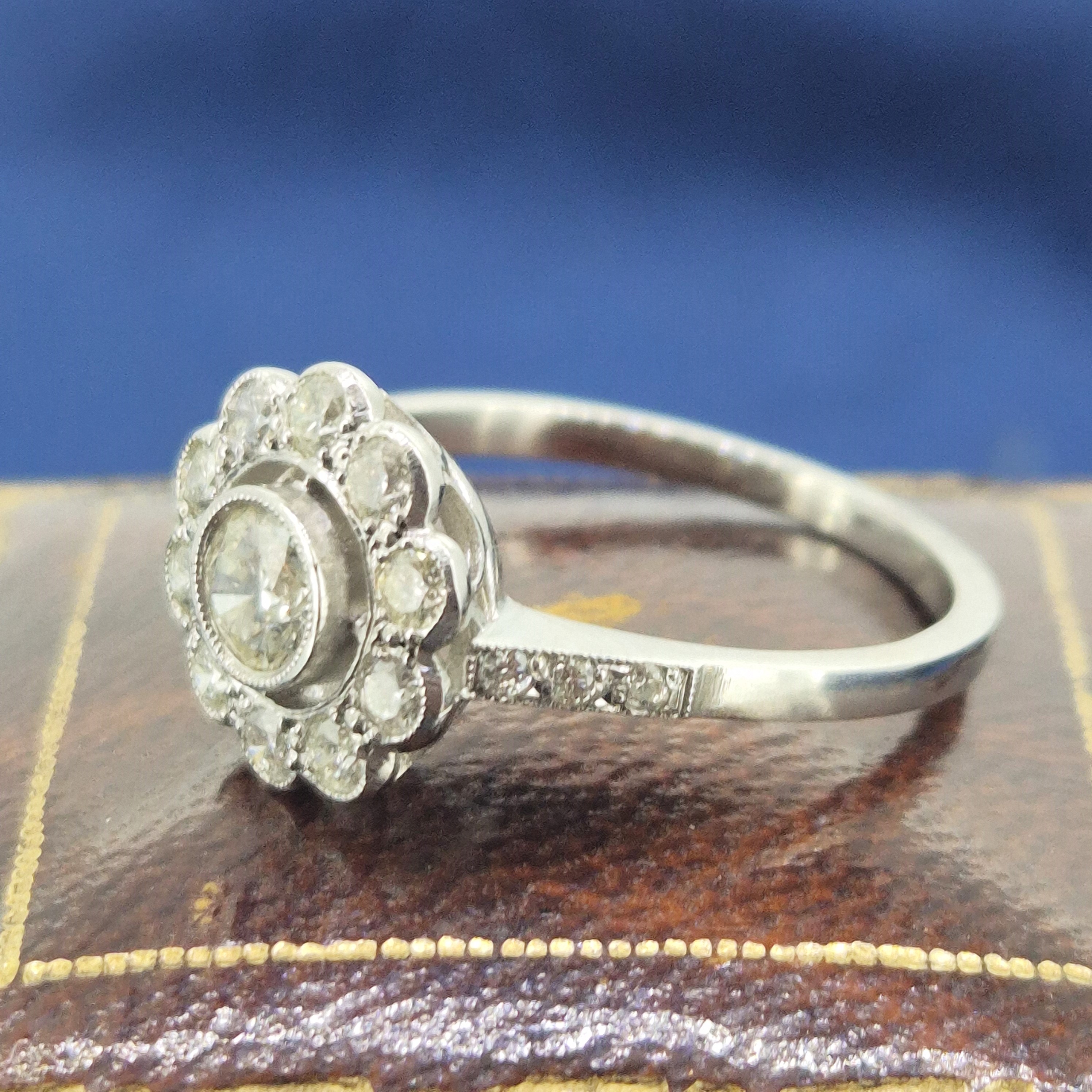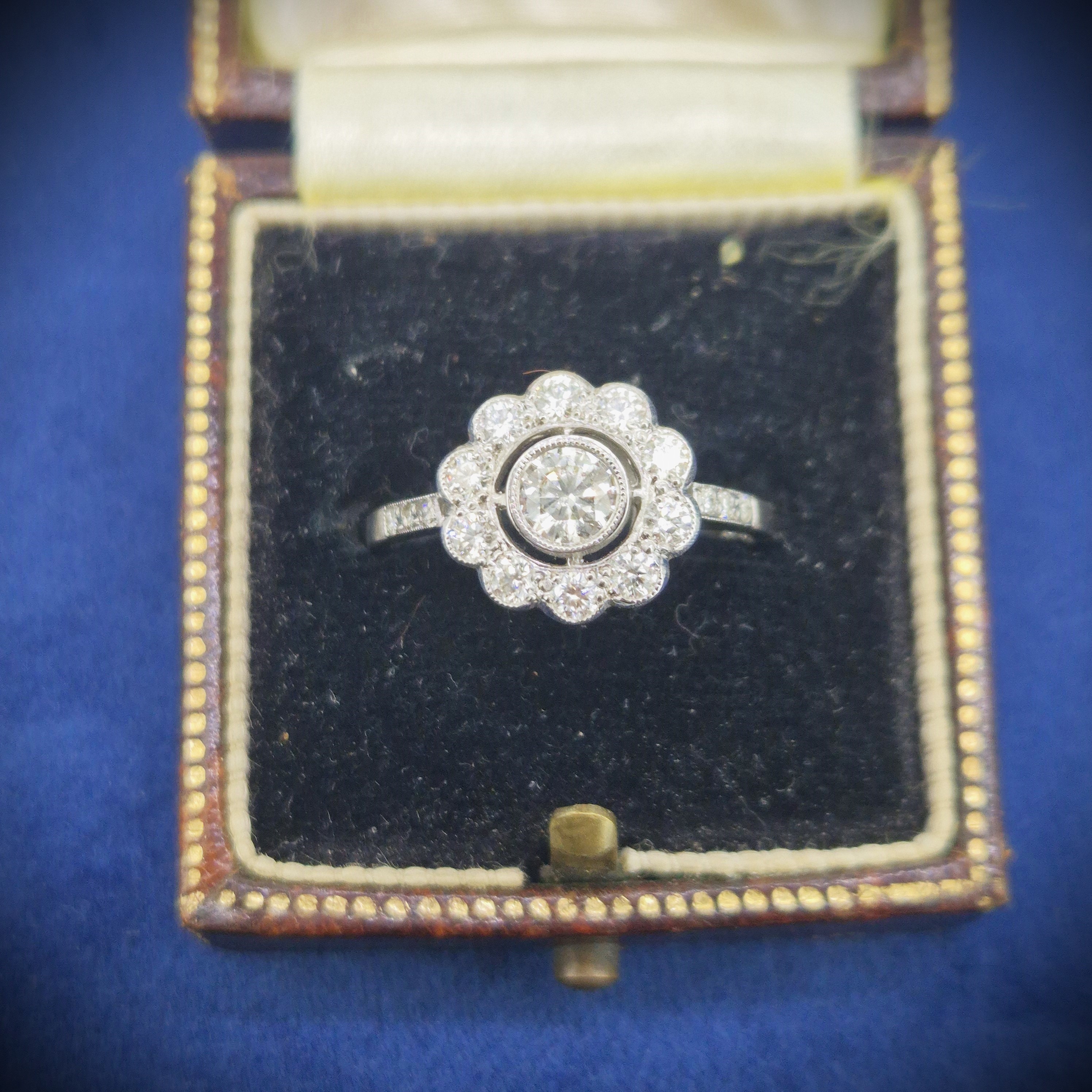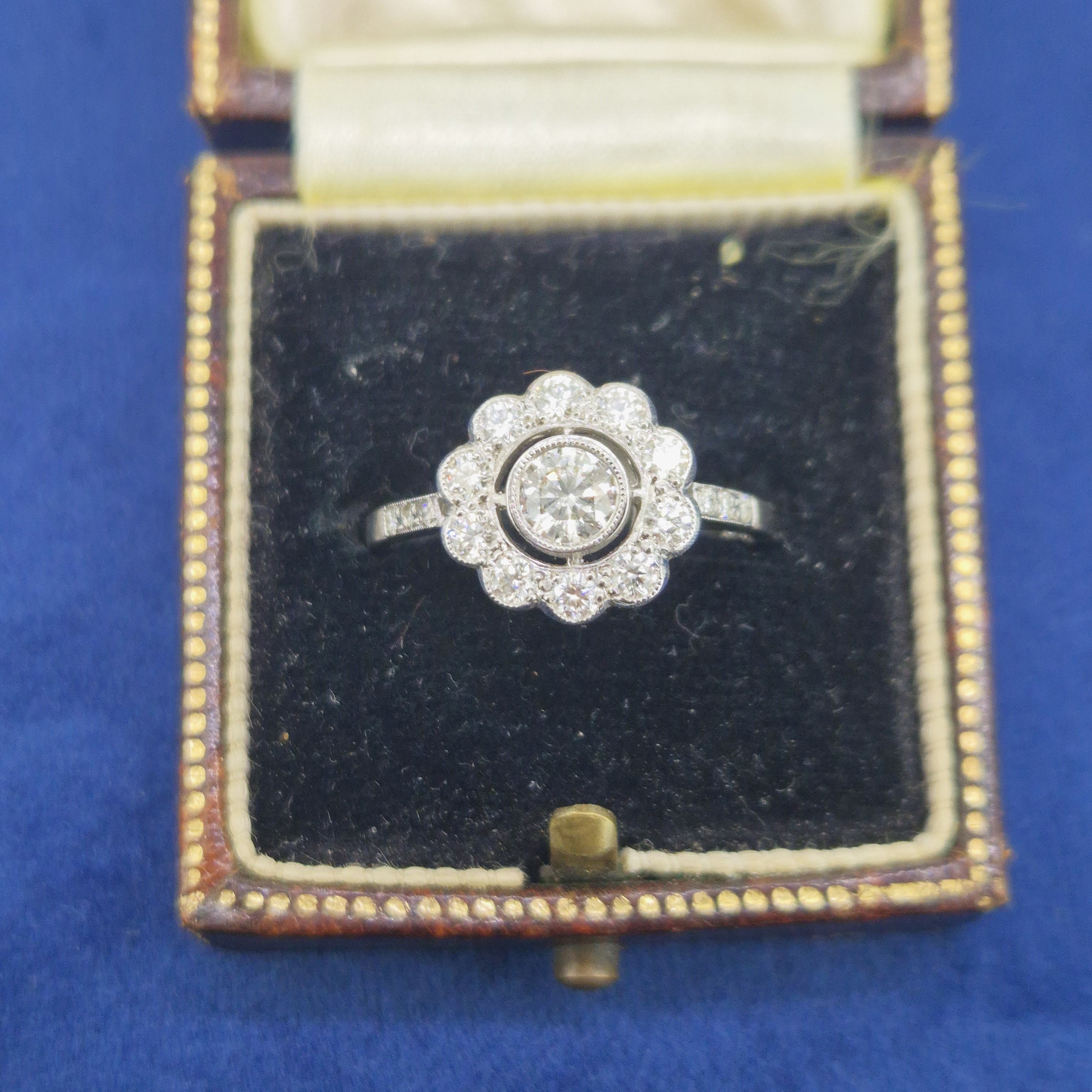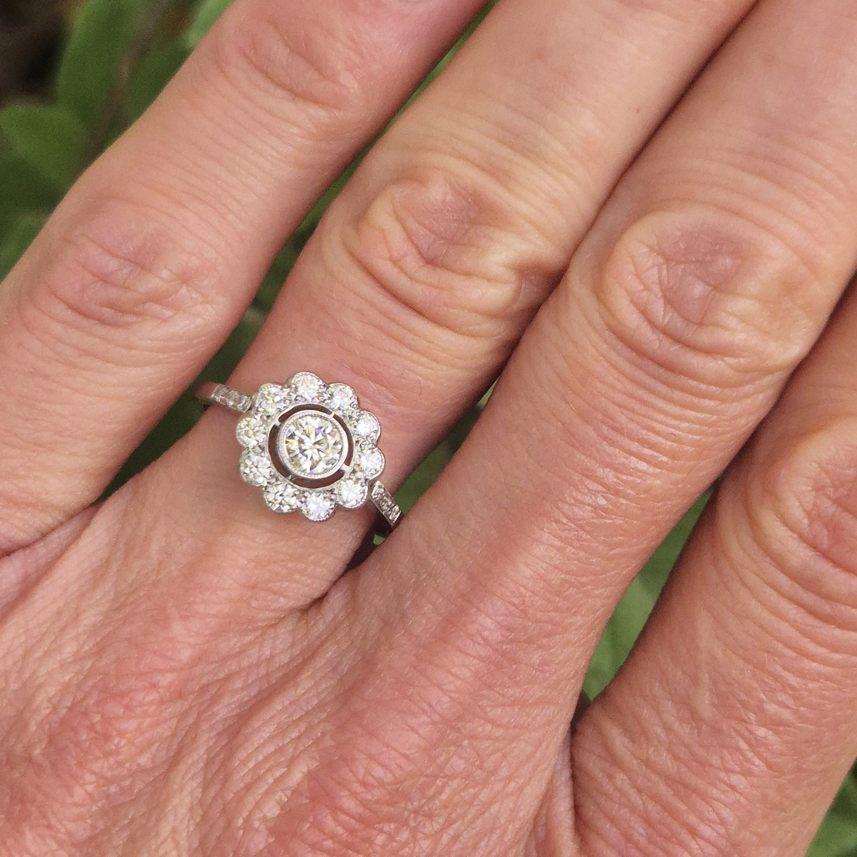 This ring is set with a central Round Brilliant Diamond that weighs 0.36cts and is set in a rub-over setting. It is surrounded by smaller Round Brilliant Diamonds that are arranged in a flower-like halo design. Each petal of the flower is formed by an individual diamond and the shoulders are also set with three smaller diamonds. The total diamond weight is estimated at 0.70ct.