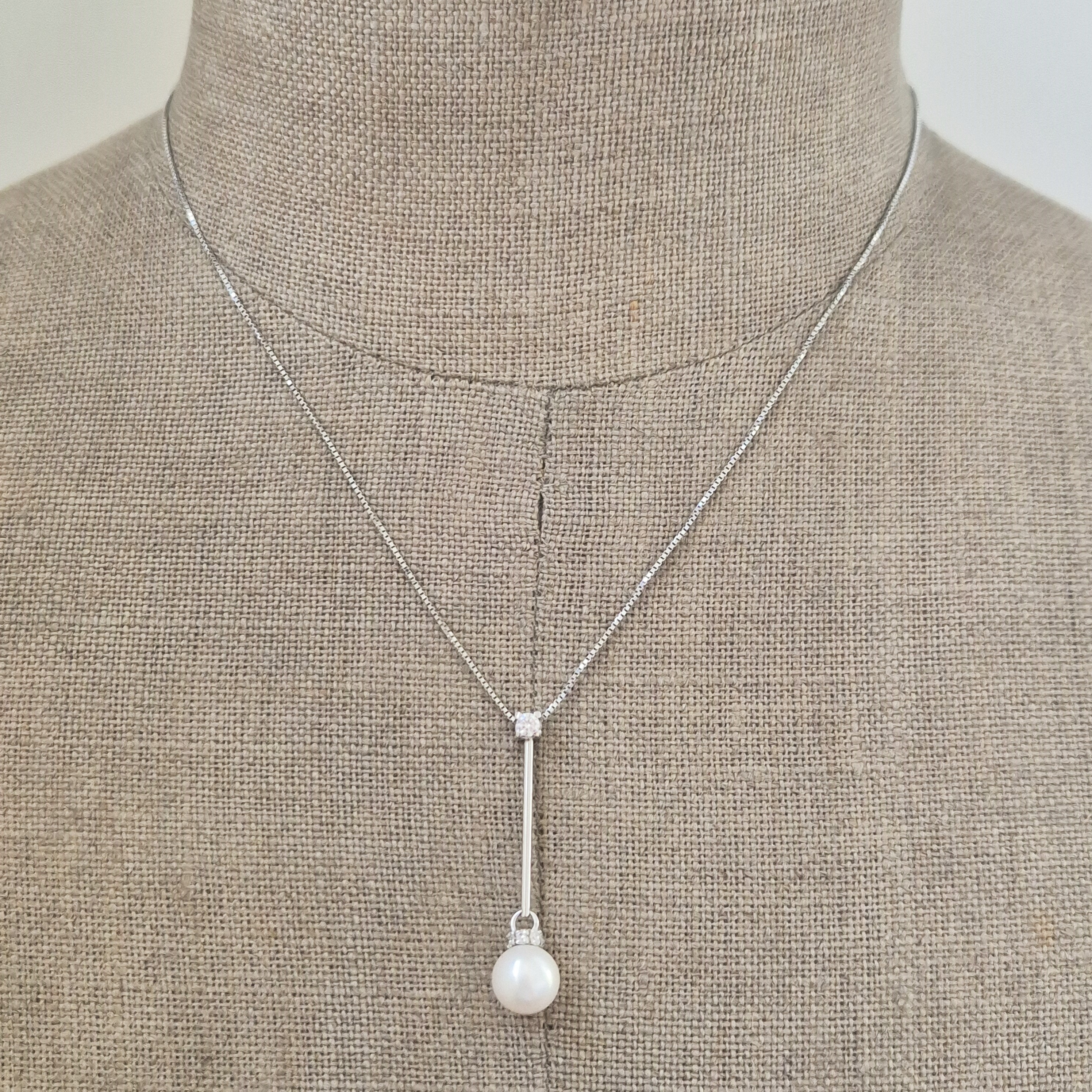 This pendant features a Round Brilliant Diamond that is set at the top end of the pendant and weighs 0.10cts. This setting is then connected to a thin 18ct white gold bar that a White Pearl hangs from. The pearl measures 8.5mm, has a lovely lustre and is further detailed my small diamonds above. The estimated diamond weight is 0.15cts in total.