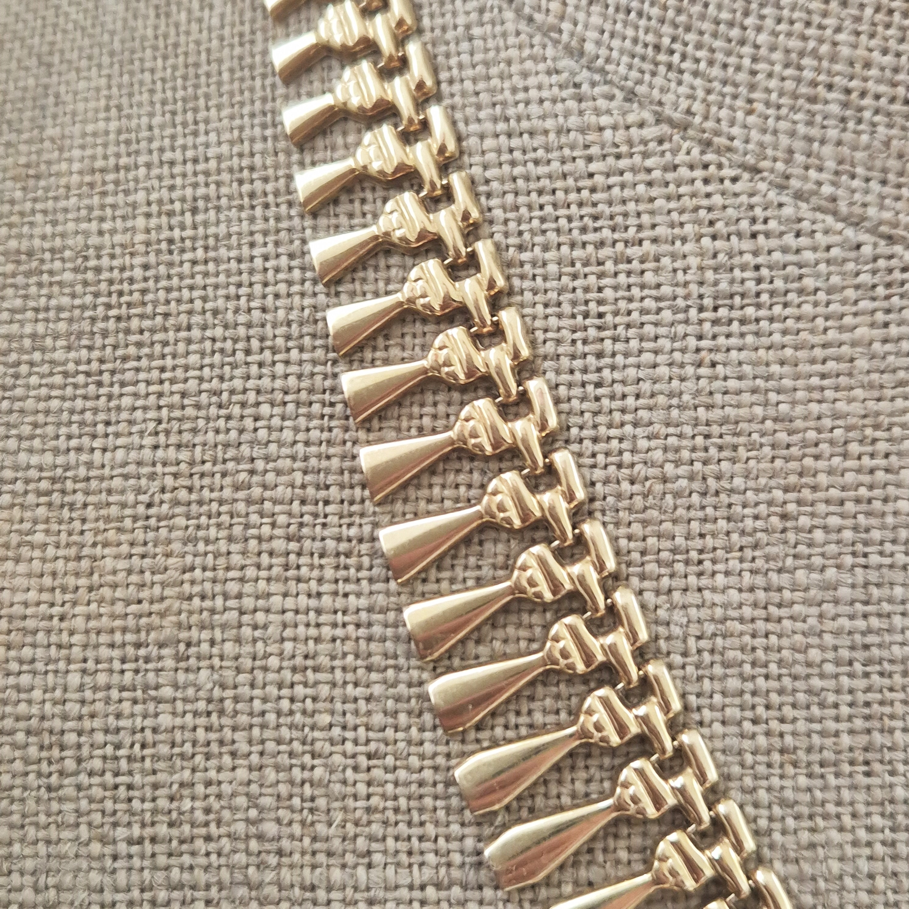 The necklace features a series of interlocking rectangular links that are connected to tapering links that are evenly spaced along the necklace. The links measure 18mm at their maximum length.