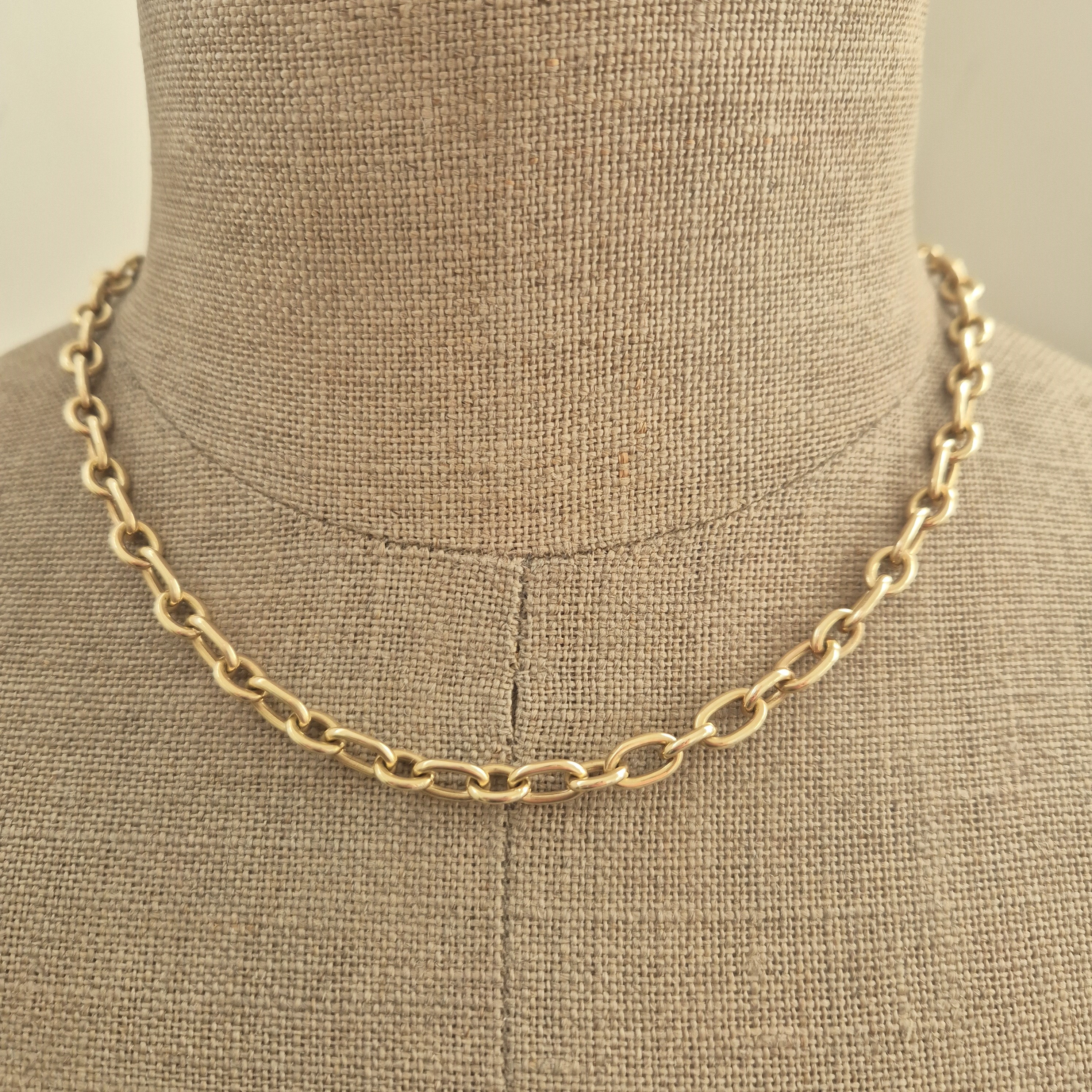 This albert features interlocking Belcher links that alternate between an elongated link and the more standard oval links. They measure 5.5mm in width.