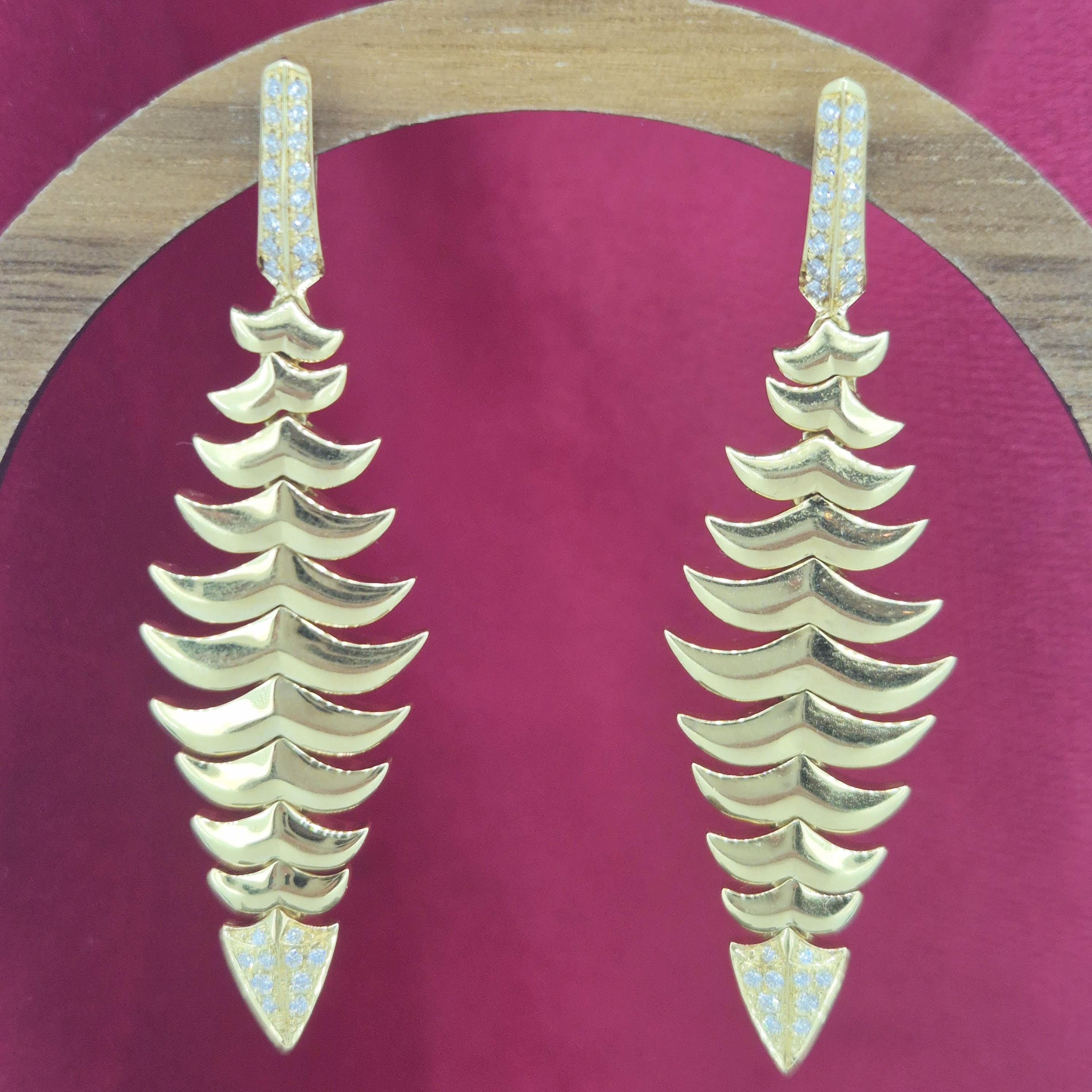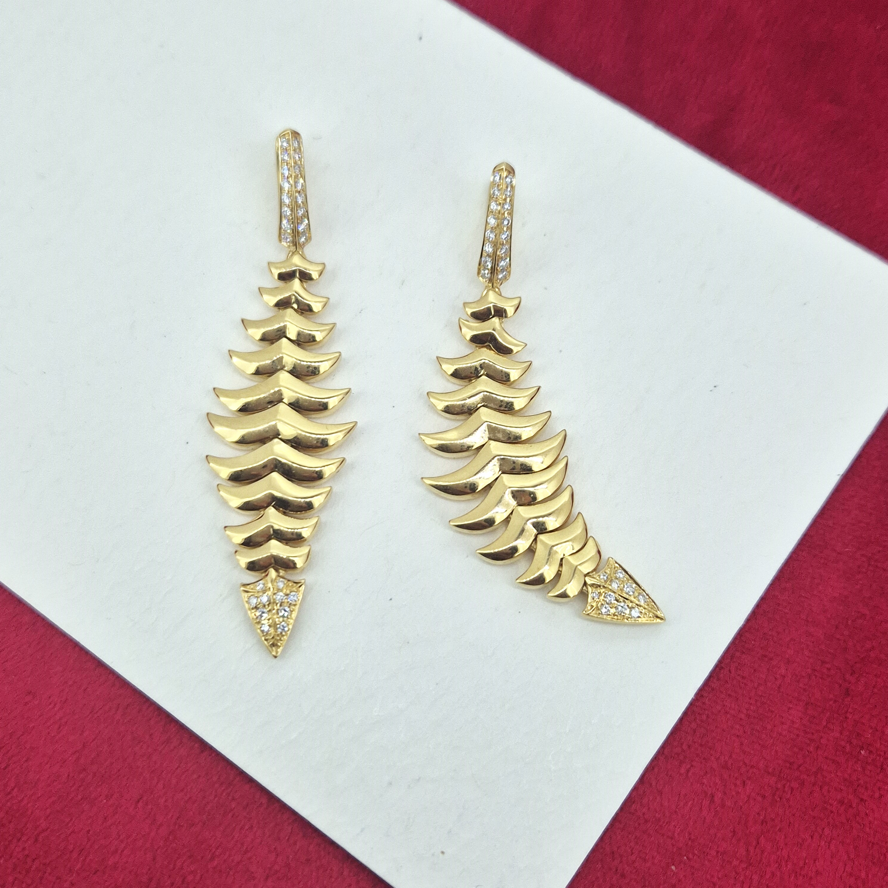 These earrings are strikingly designed featuring a distinctive articulated design that allows them to move fluidly. Each earring is made using gold segments that are shaped almost like scales which taper towards pointed tips that are set with Round Brilliant Diamonds.