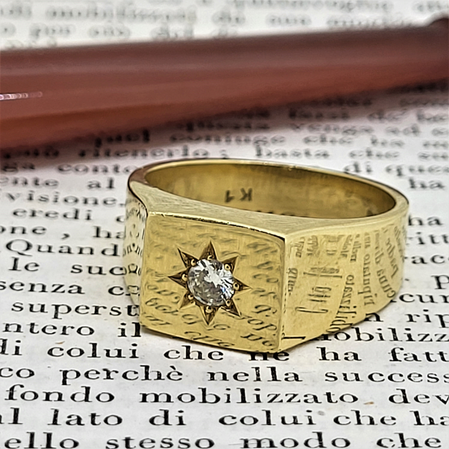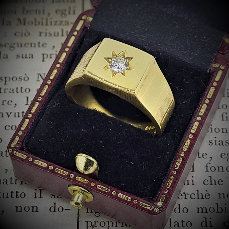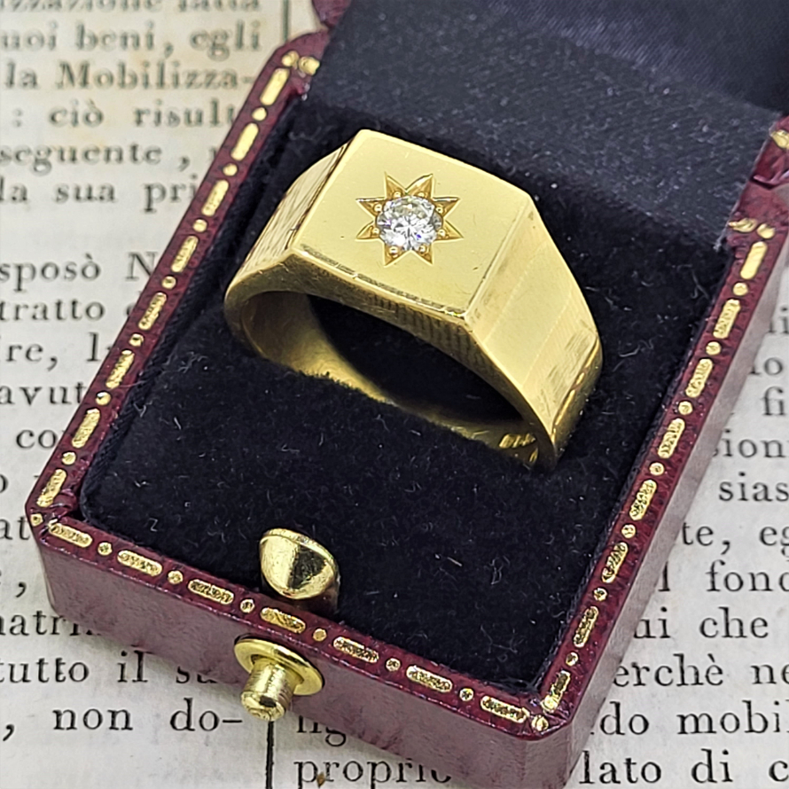 A traditional yet striking 18ct Gold Gents Diamond Signet Style Ring. Set with a 0.15ct round brilliant cut diamond the ring weighs an impressive 12.9grams.