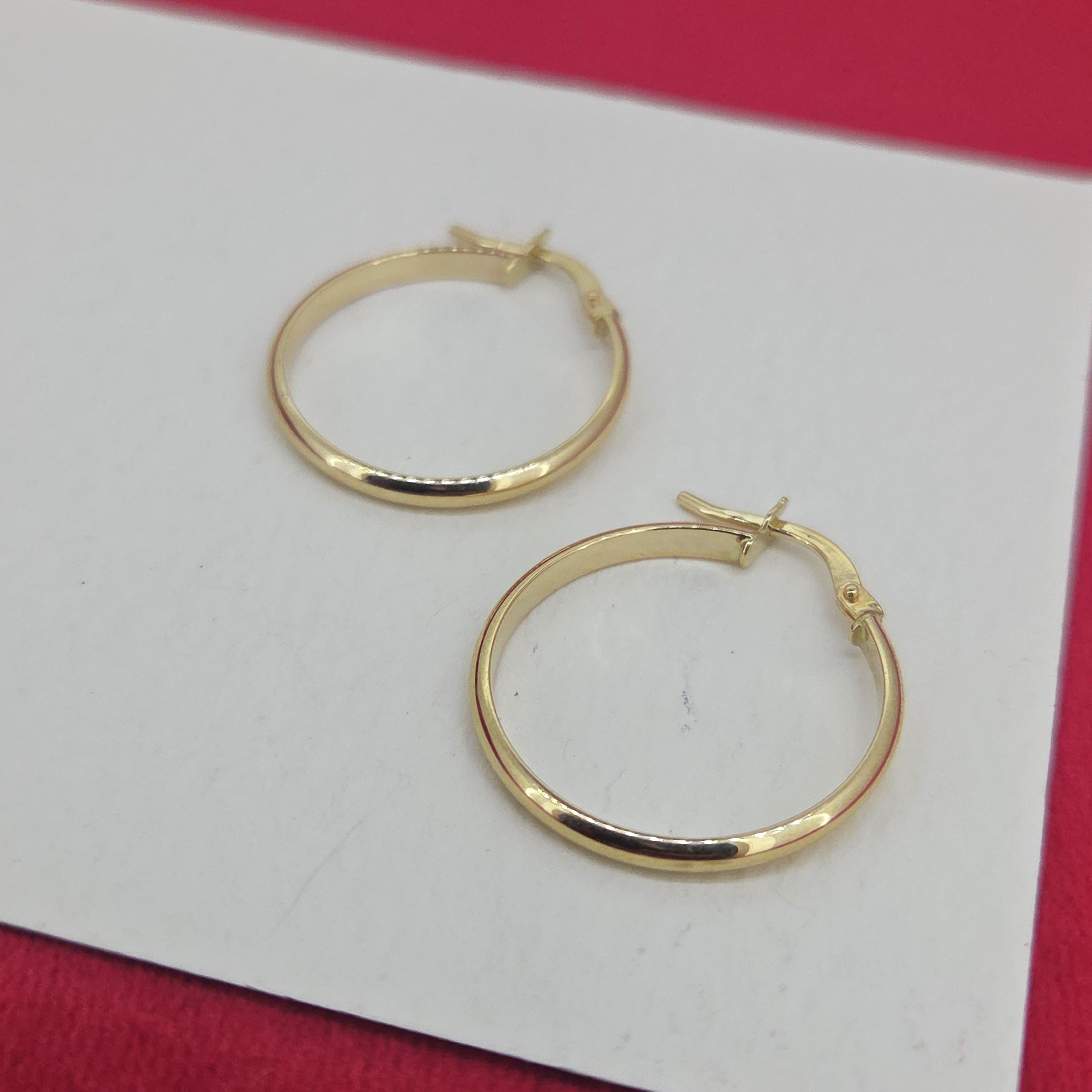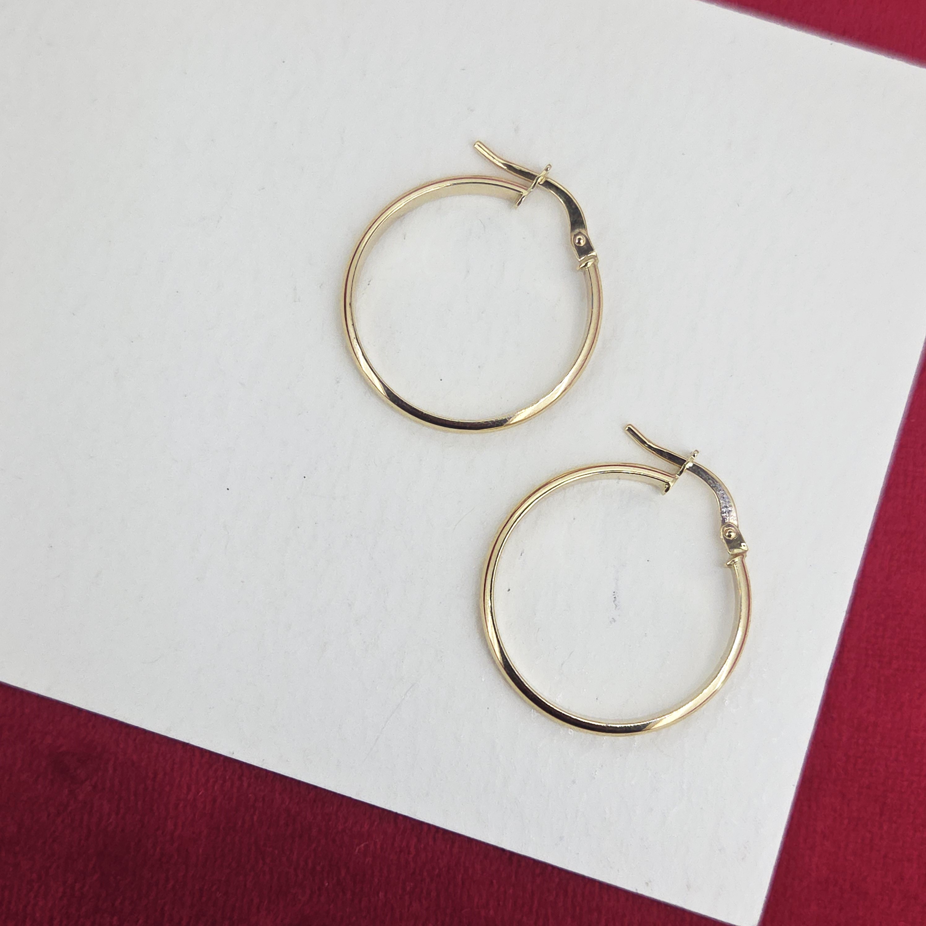 The earrings measure 22mm in diameter and 2mm in width. They are stamped 375 and are secured using hinged fittings.