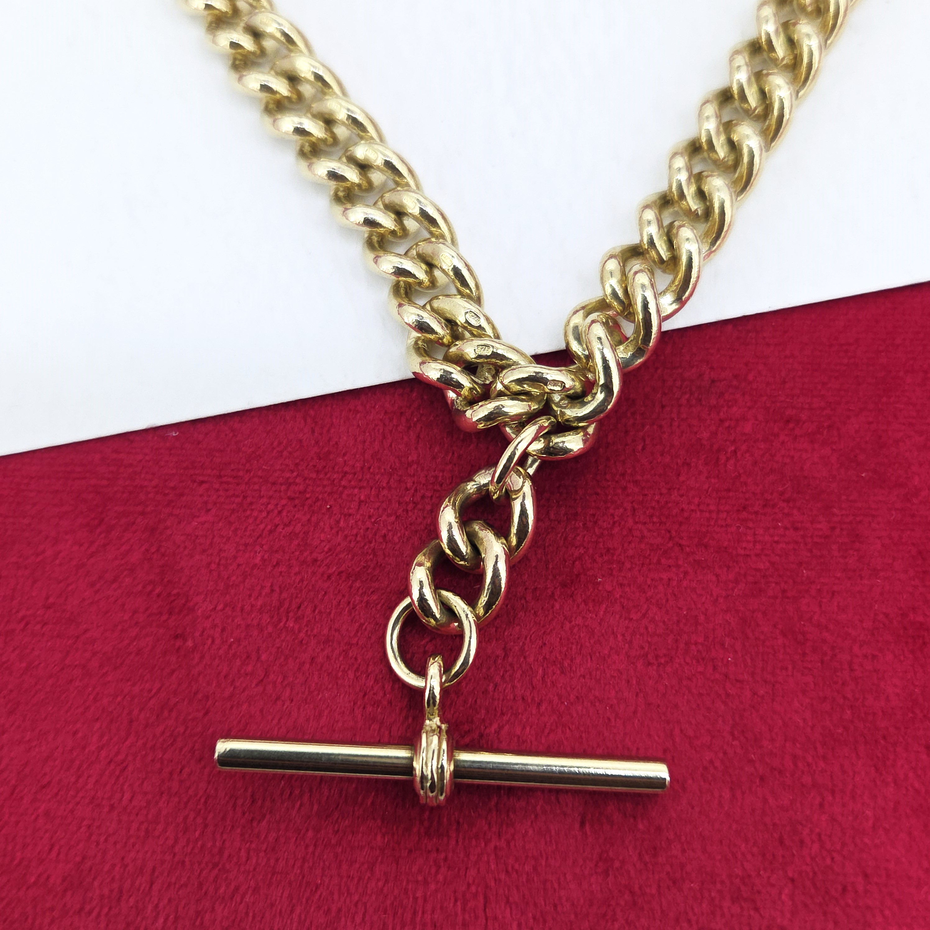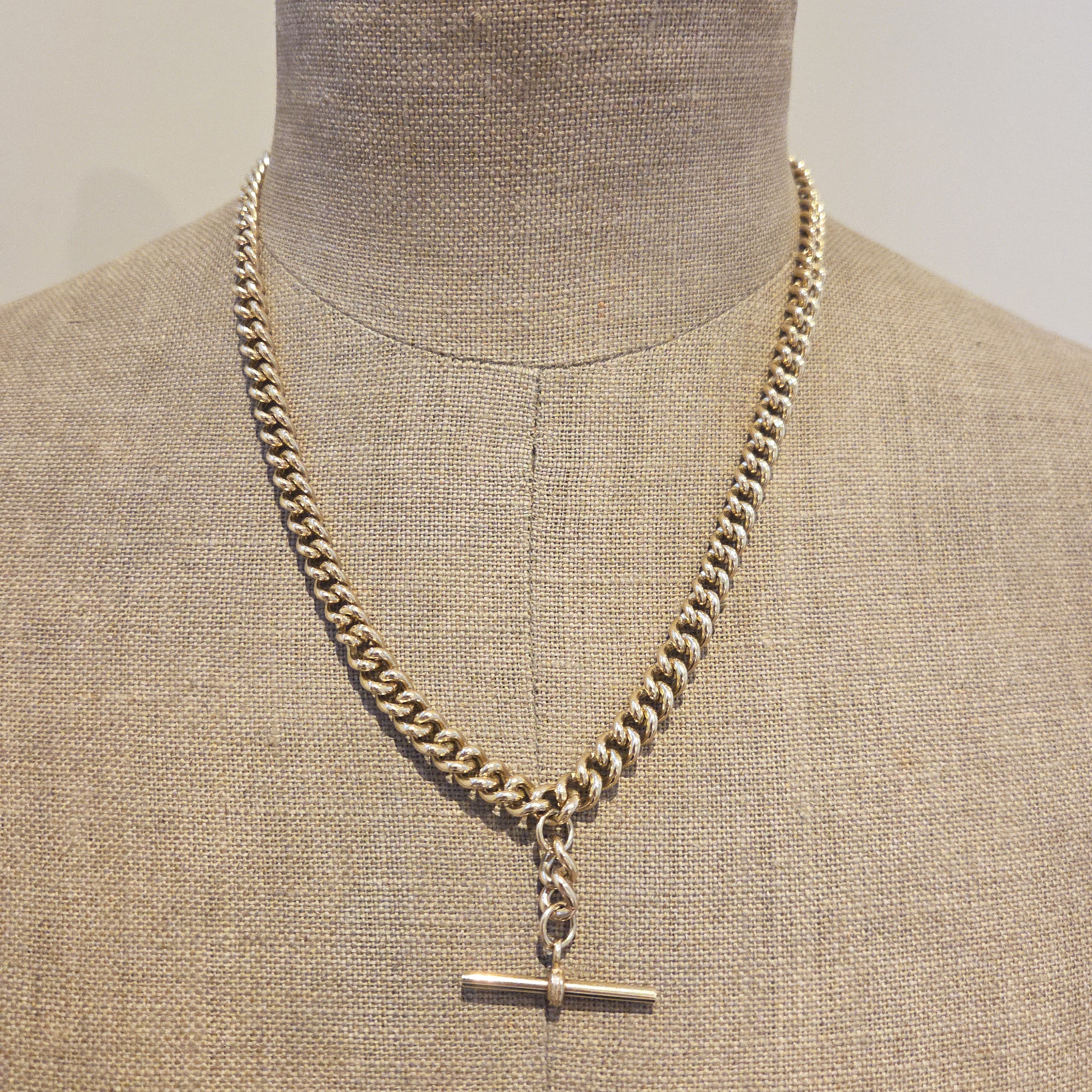 The Chain features individually stamped graduated Traditional Curb links measuring from 8mm to 5mm in width. It is also fitted with a T-Bar that measures 32mm that hangs an extra inch from the centre the chain.