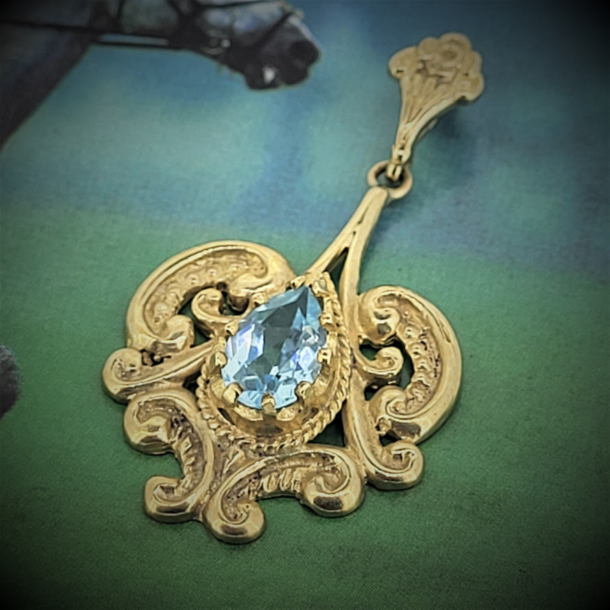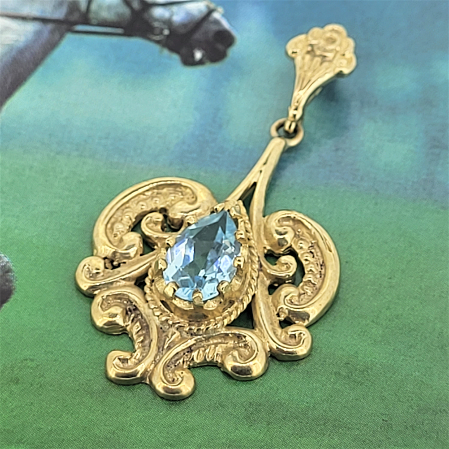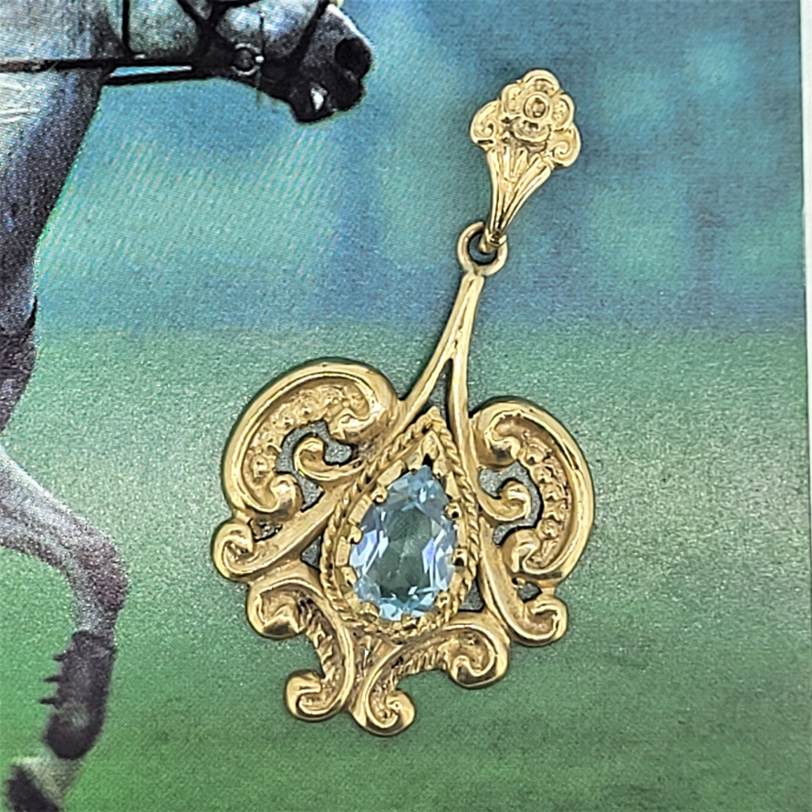 A lovely Reproduction Blue Topaz Pendant set in 9ct Yellow Gold with a filigree frame and a fleur de lis bail. The Blue Topaz is pear shaped and measures 6mm by 9mm so approximately 2ct. The pendant measures 30mm by 22mm (not including the bail).