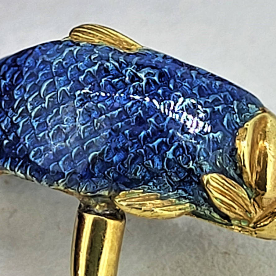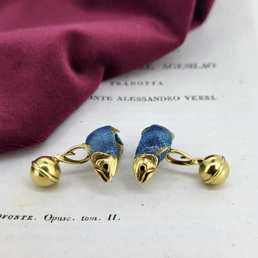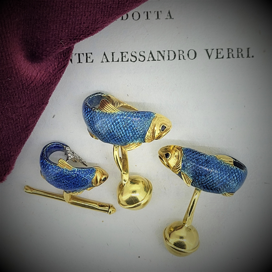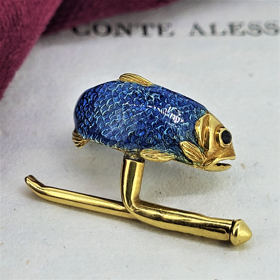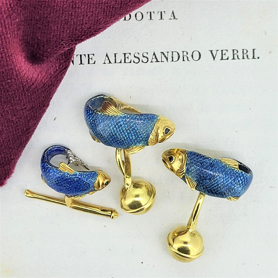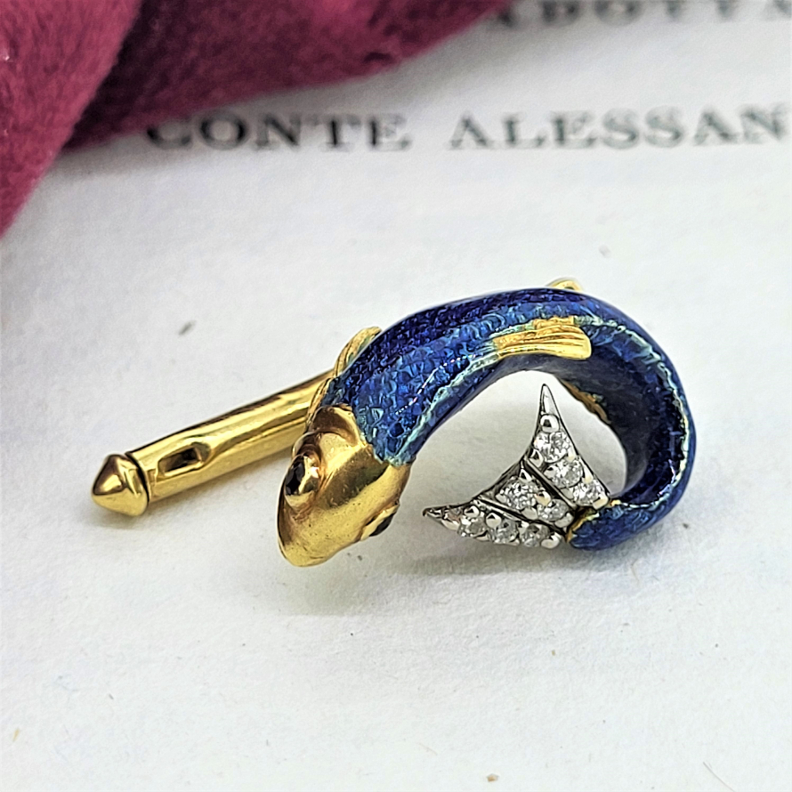 Produced in 1989 by Tiffany in Germany these Pike Cufflinks and pin feature sapphire eyes and enamelled scales! In excellent quality made from 18ct Yellow Gold the cufflinks have substantial ball fittings and the pin has a fancy diamond encrusted tail.