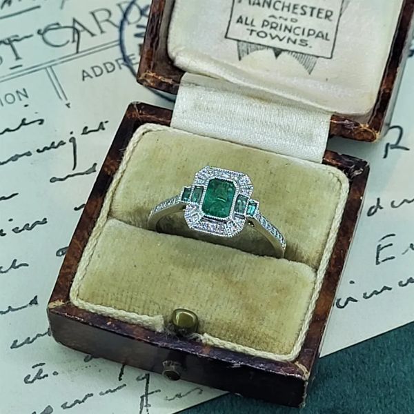 The Emeralds are arranged in a classic Art Deco design and have a combined weight of 0.65 carats. The central Emerald measures approximately 4mm x 6mm, flanked above and below by Round Brilliant Cut Diamonds, which continue gracefully down the shoulders of the shank. The diamonds add sparkle and structure, enhancing the geometric form of the design.