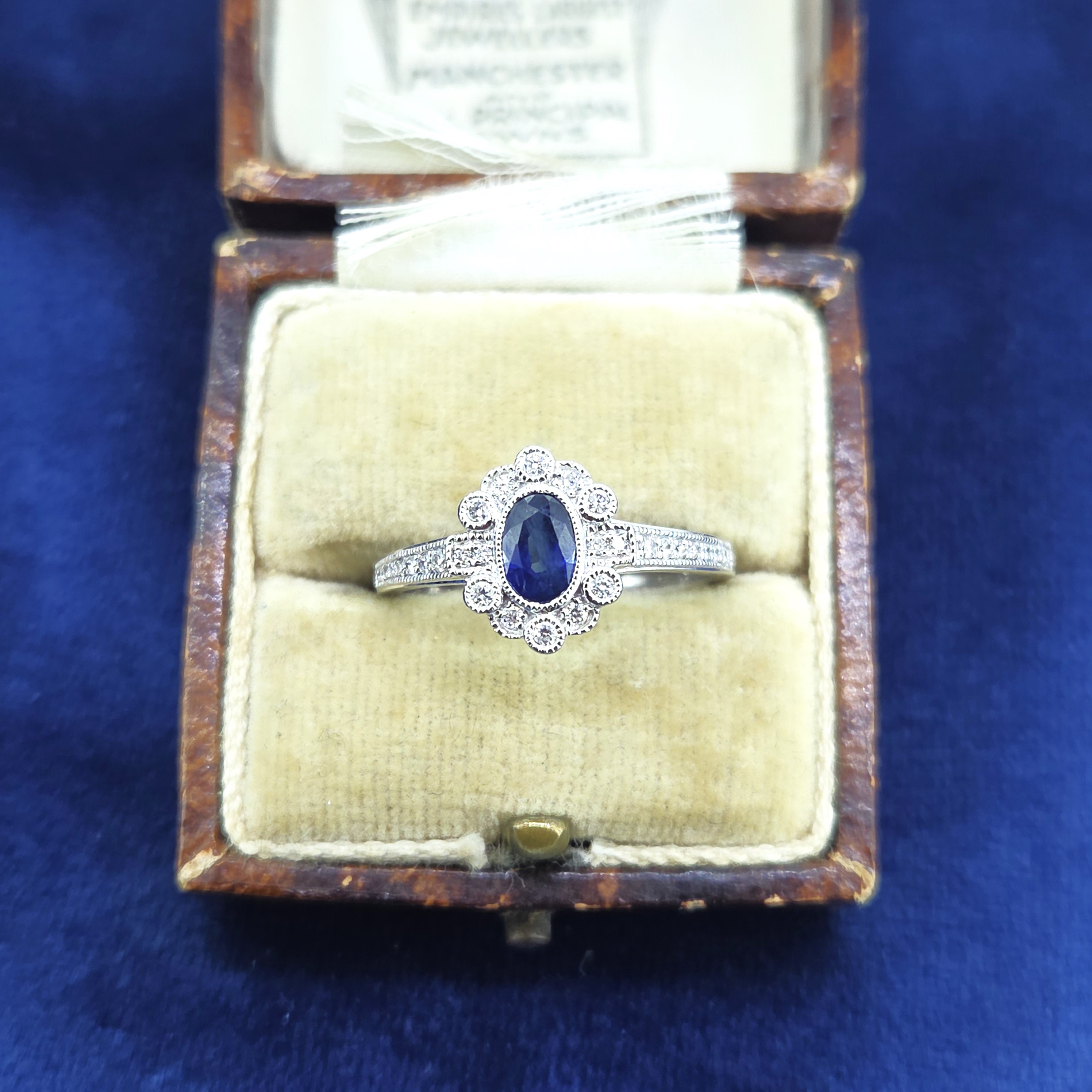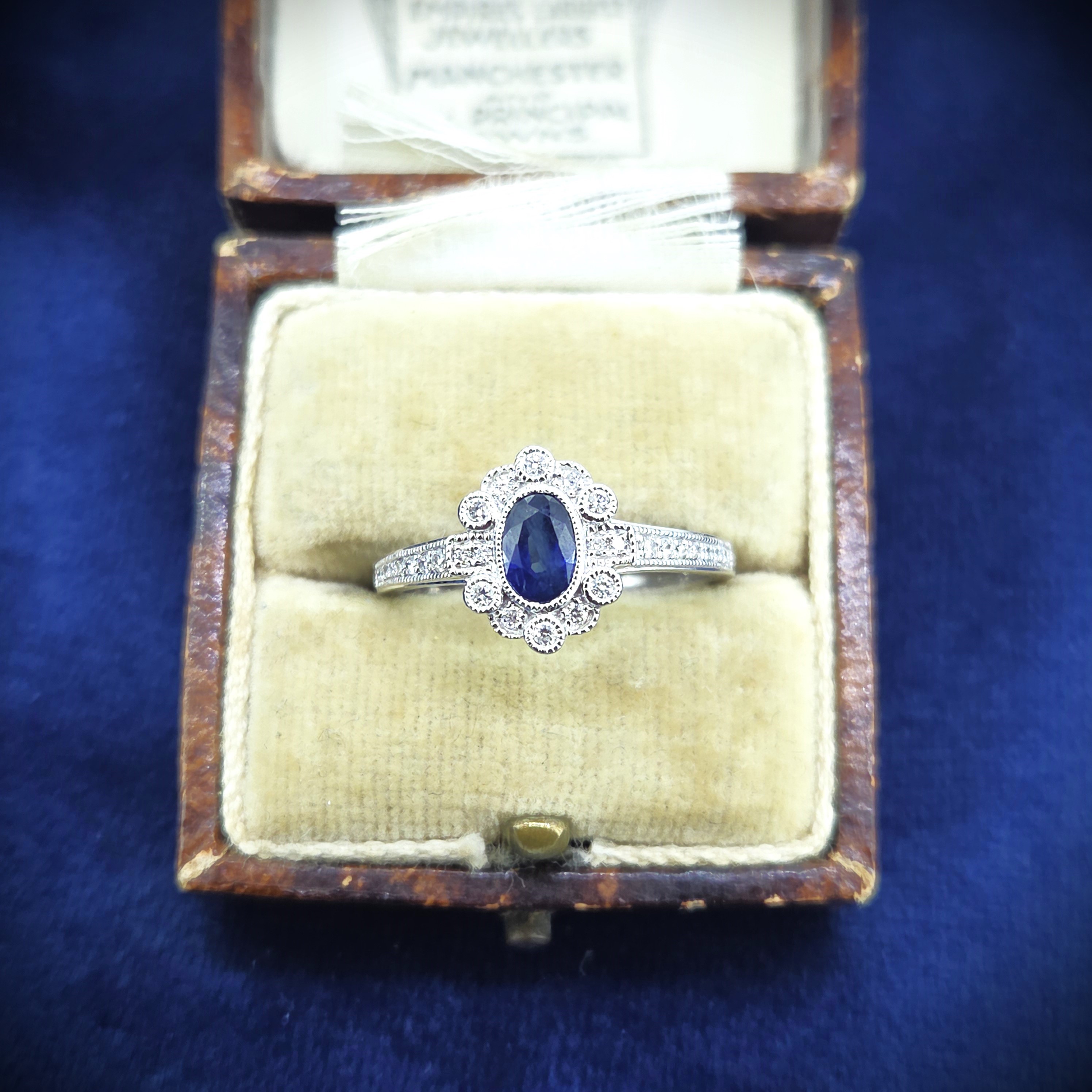 A truly delightful Sapphire and Diamond Cluster Ring, beautifully crafted in 18ct White Gold and rich in elegant detail.