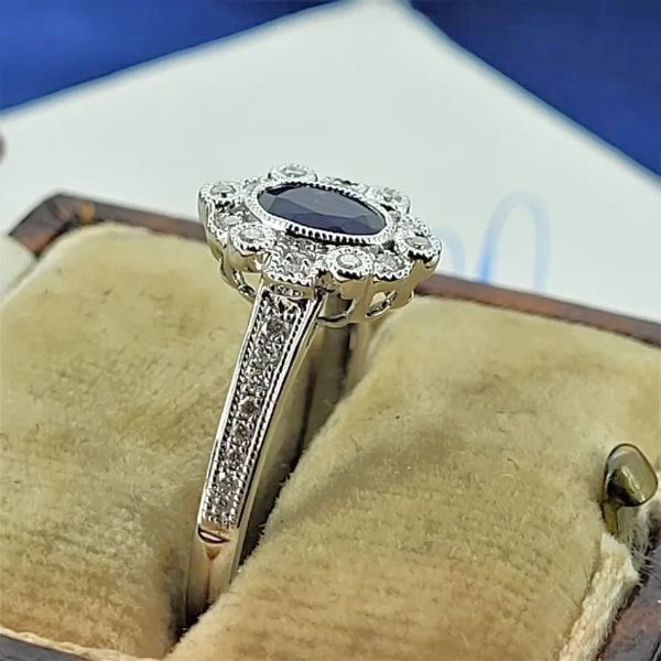 At the centre sits a vibrant Sapphire measuring approximately 4mm x 6mm, with a weight of 0.70 carats. It is surrounded by Round Brilliant Cut Diamonds, arranged in a distinctive design of alternate heights, creating depth, sparkle, and visual interest. This thoughtful setting enhances the brilliance of the diamonds while framing the sapphire perfectly.