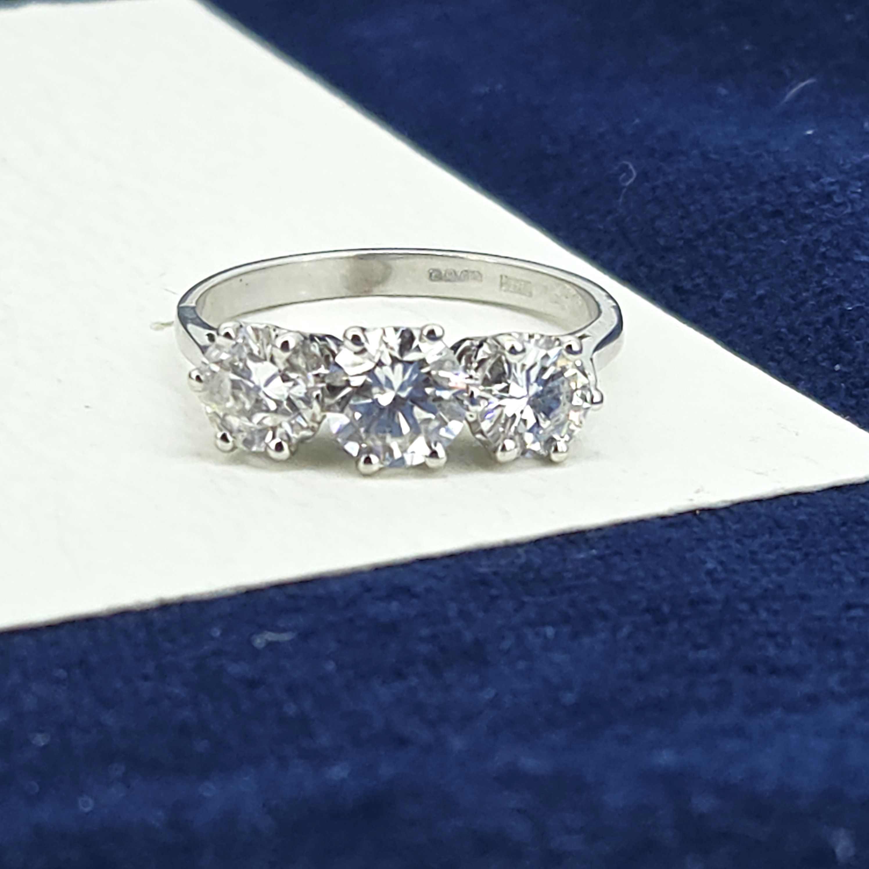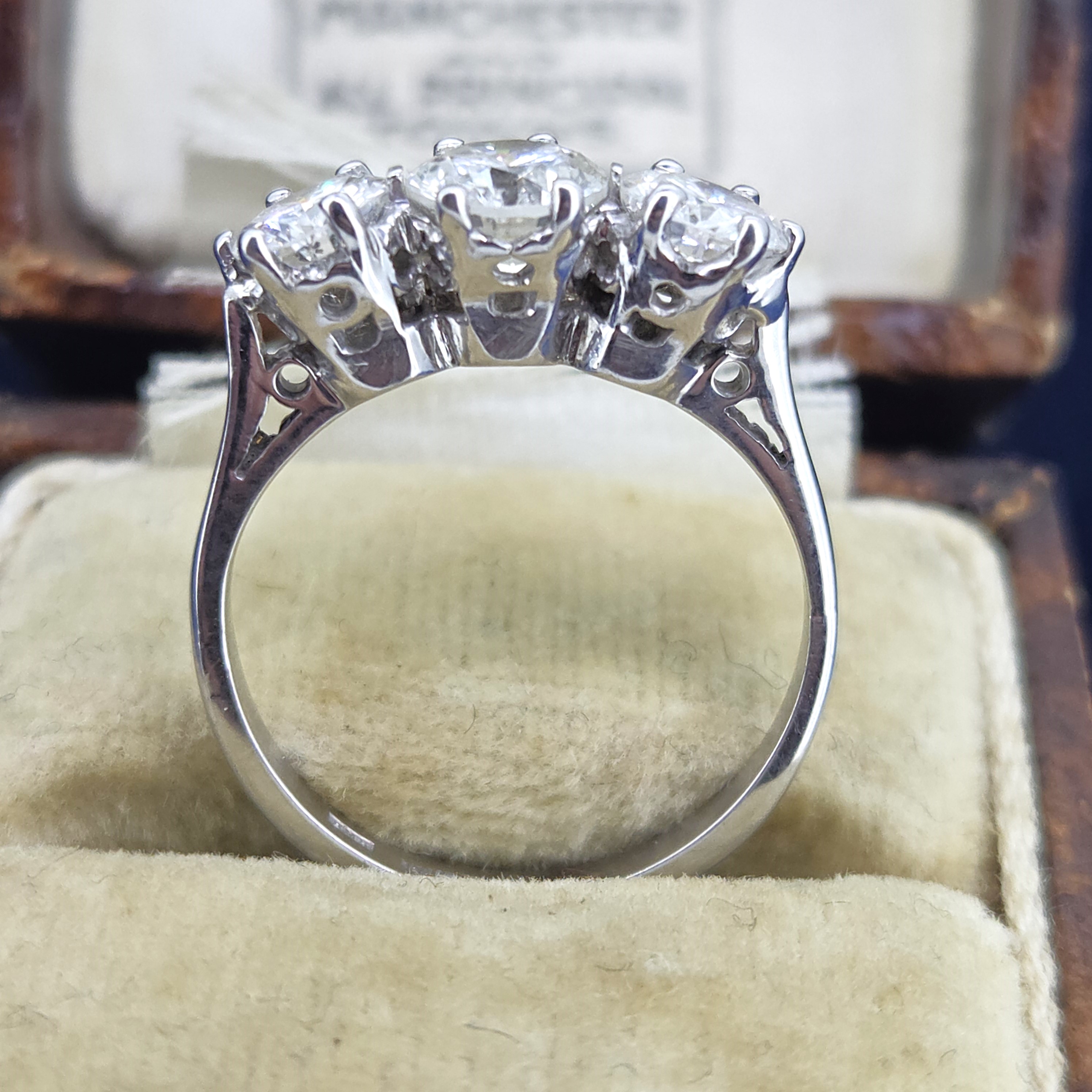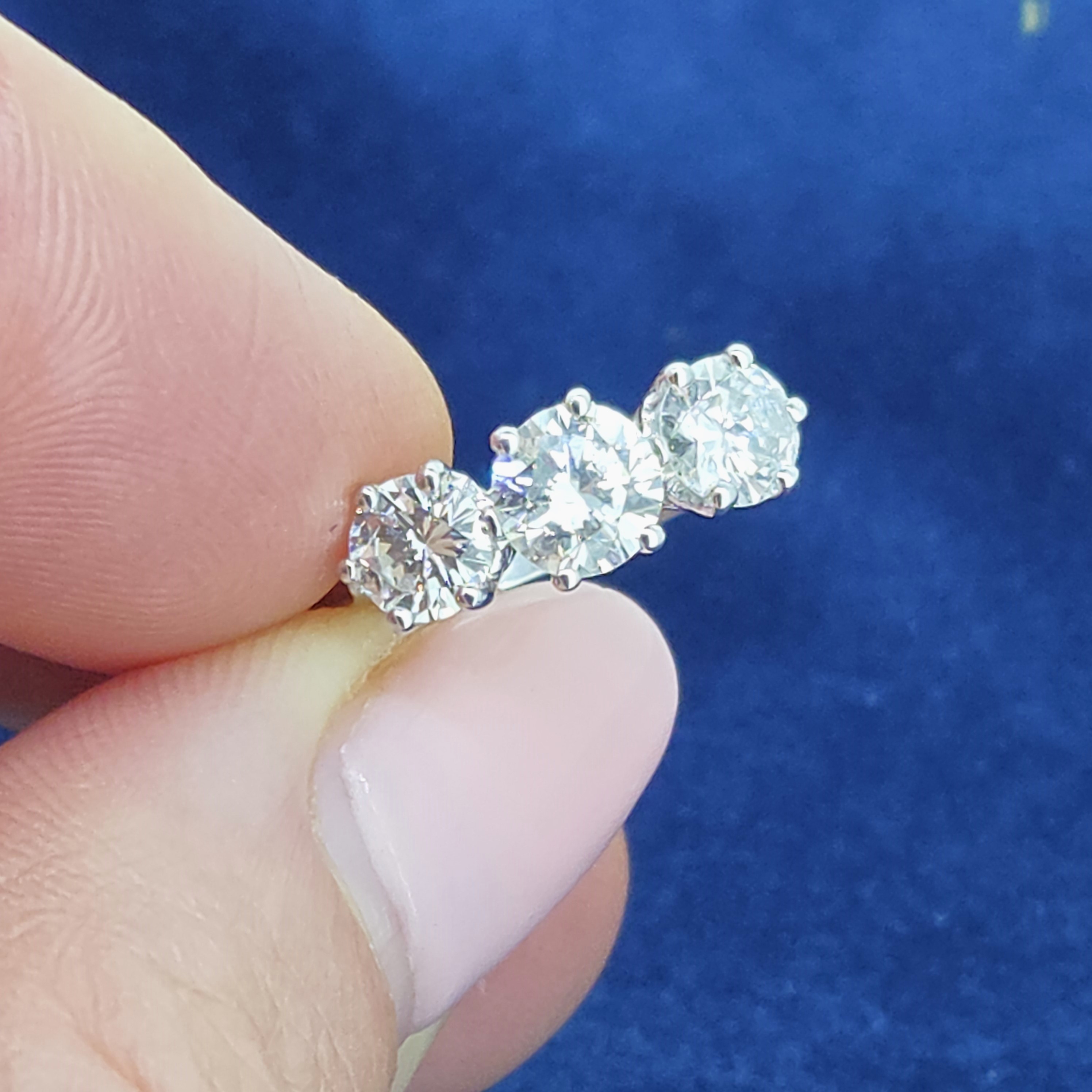 The diamonds are set above a solid 2mm shank, giving the ring excellent strength and wearability while maintaining a refined profile. It weighs 3.2 grams, allowing the ring to feel beautifully balanced on the hand. The graduated three-stone arrangement creates a striking yet harmonious presence across the finger.