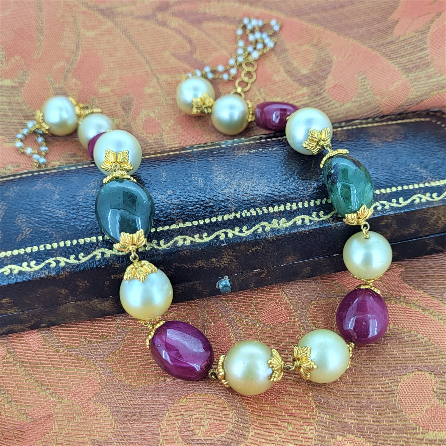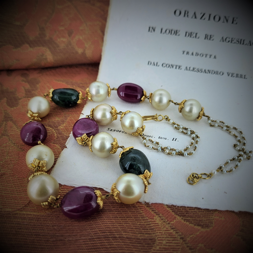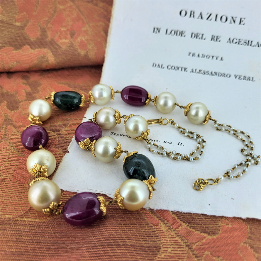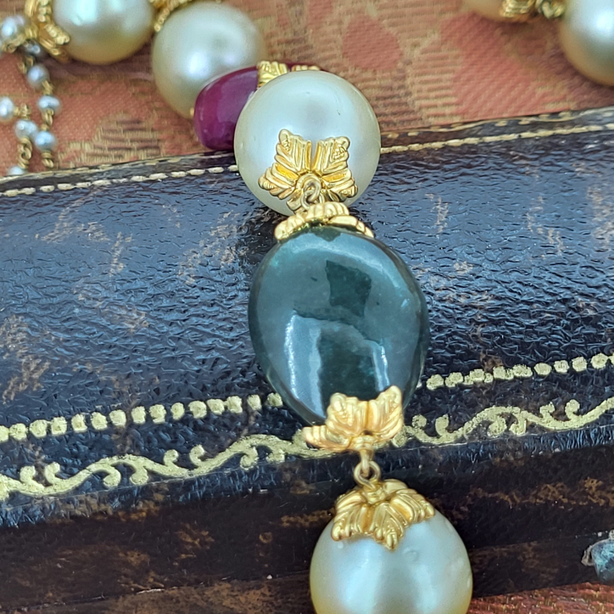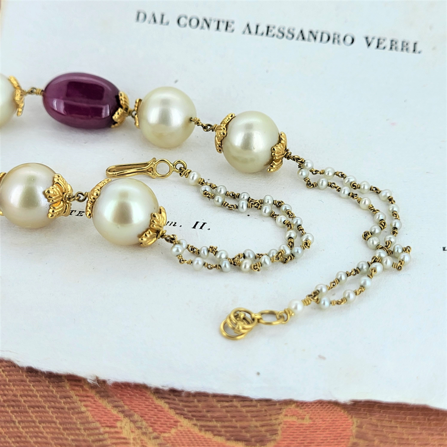 A fabulously unique and distinctive bead style necklace containing natural pearls, nephrite and spinel. All intricately linked with 18ct yellow gold. The bead detail measures 12inches and is extended to 19inches with an a delicate gold and seed pearl chain. This is a rare find and an unusual design. We love it!