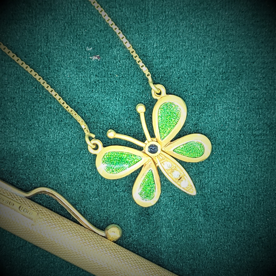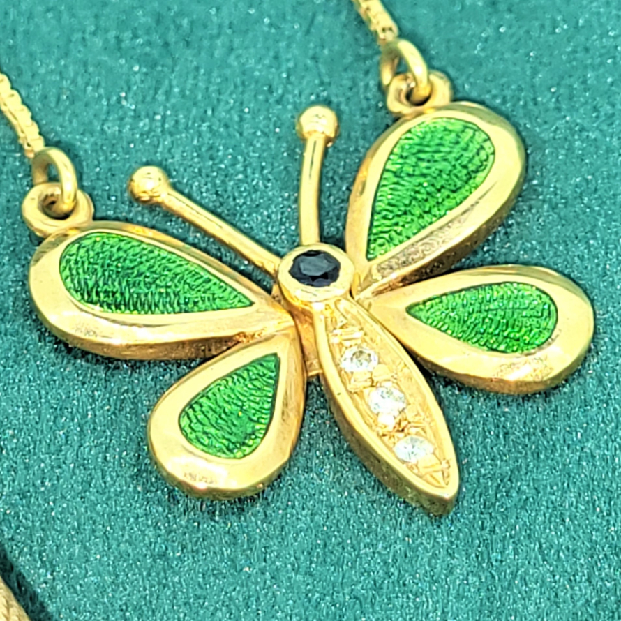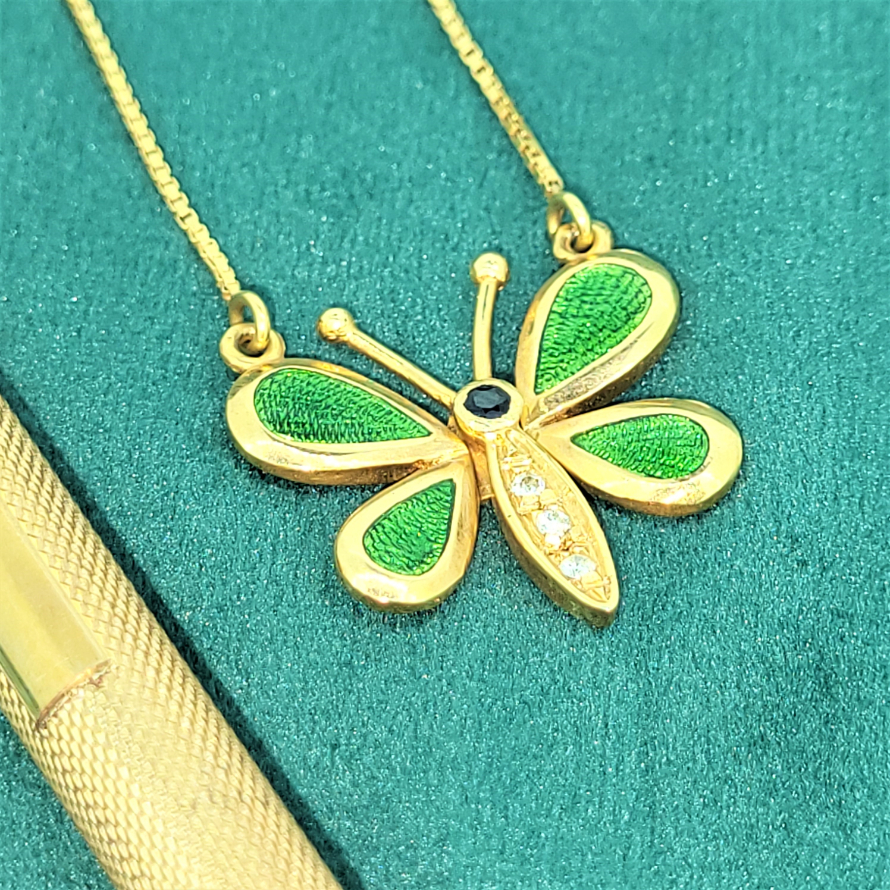An absolutely stunning butterfly necklace suspended on an 18ct Yellow Gold Box Chain.