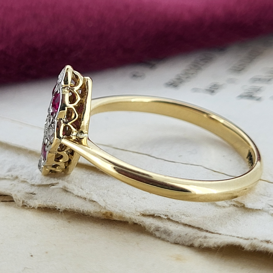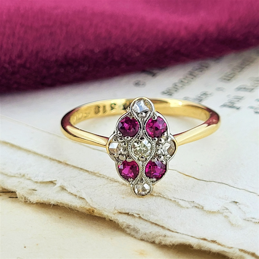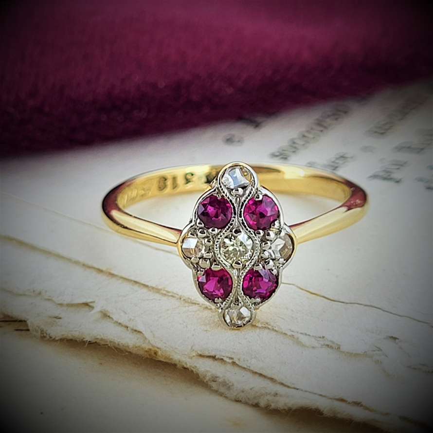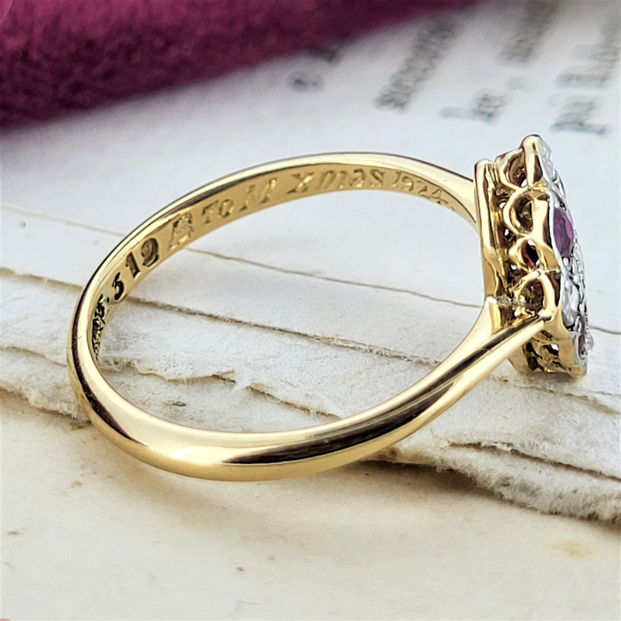 Oh how we love this ring and what we know about its story. Engraved with 'B to M xmas 1924' what a fabulous gift this would have been then and is now. Rubies and diamonds are graduated and alternated in a kite shaped setting on a traditional 2mm yellow gold shank. Currently Size L 1/2 and can potentially be sized a small amount. A fabulously ethical choice.