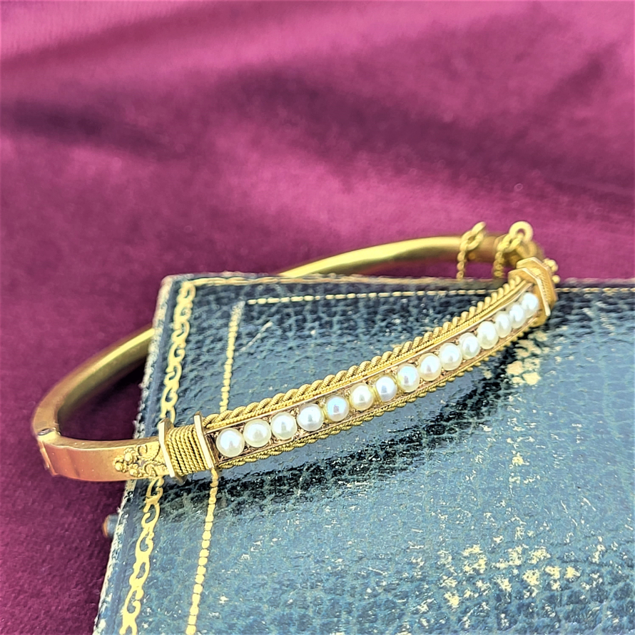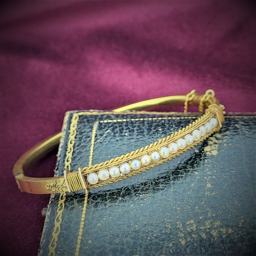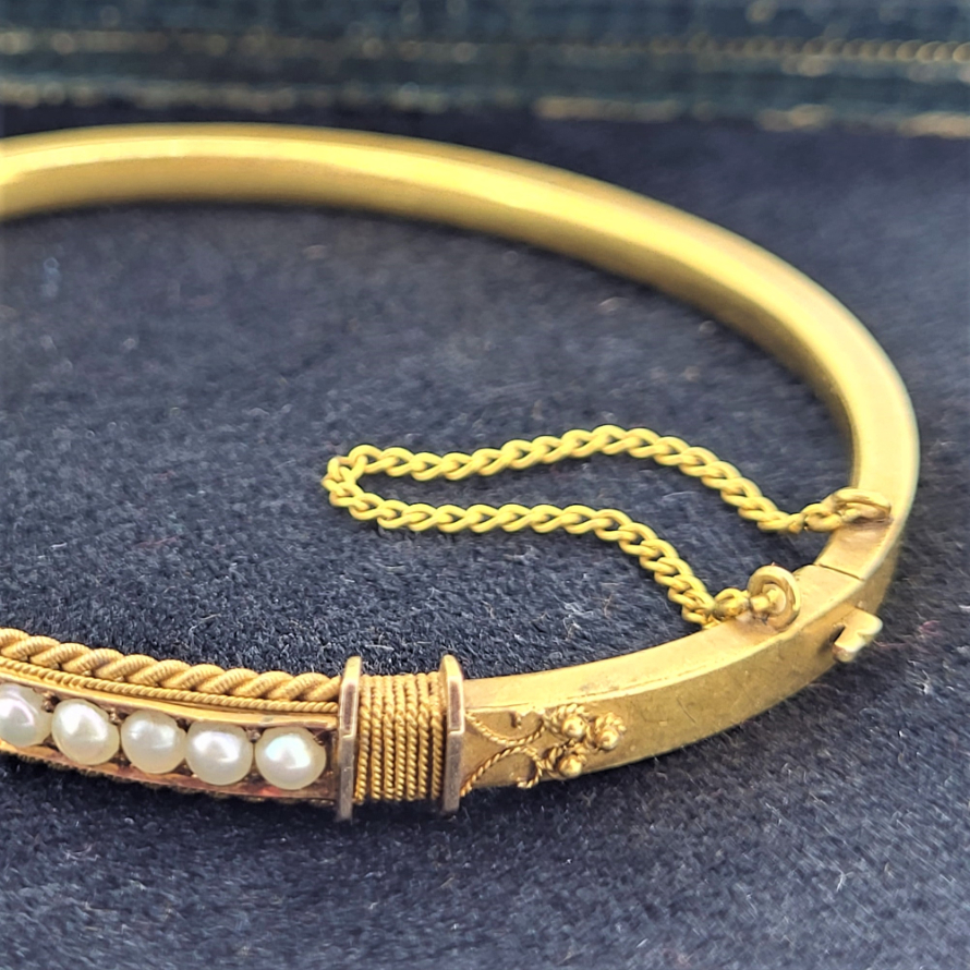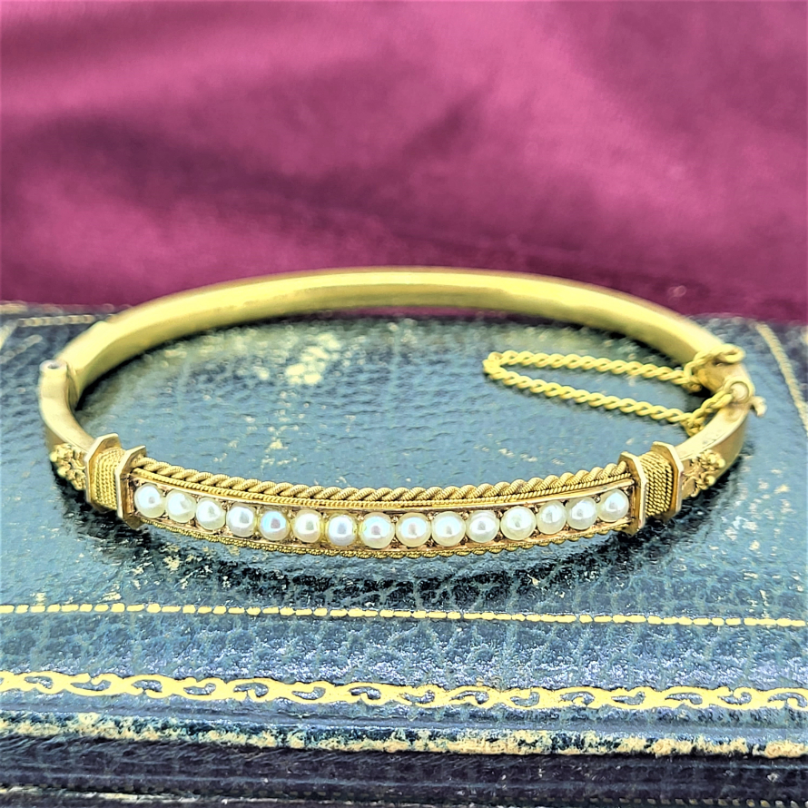 A fine example of a Victorian bangle with a row of seed pearls measuring 2mm in diameter. The bangle is 15ct yellow gold with a hinge fold and a tongue clasp secured with a 15ct safety chain. The bangle weighs 8.2 grams and will fit a wrist with a 6cm diameter.