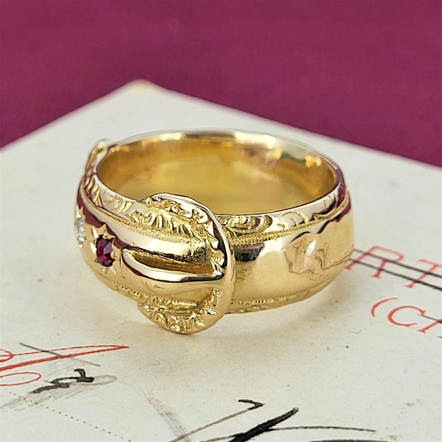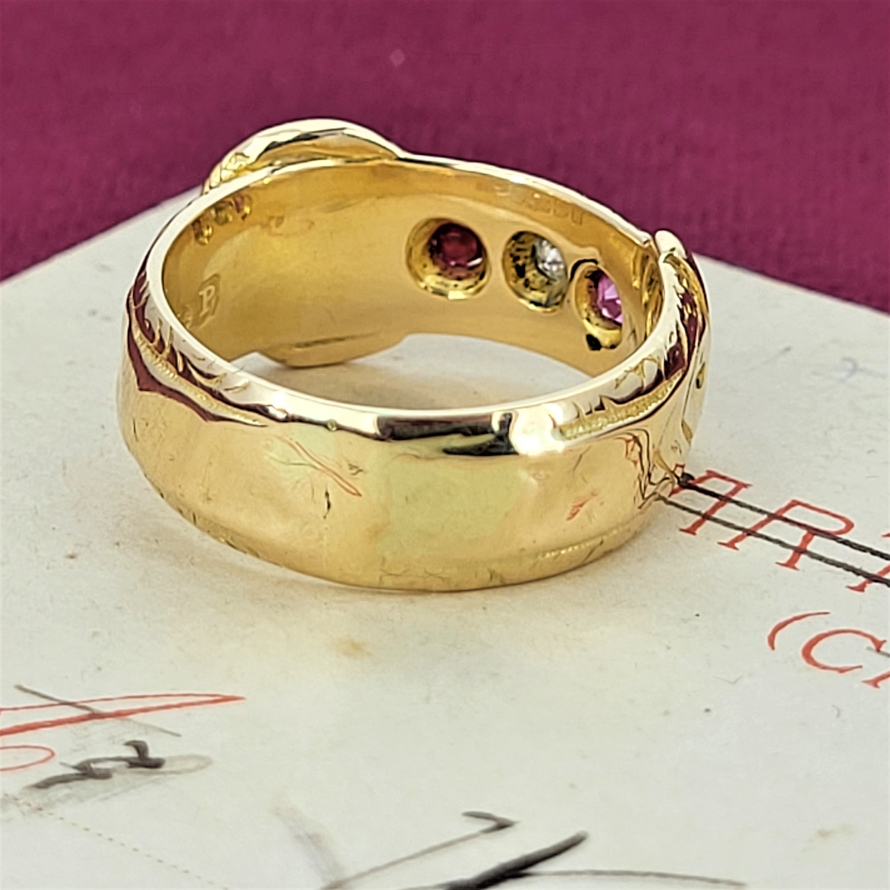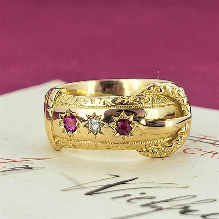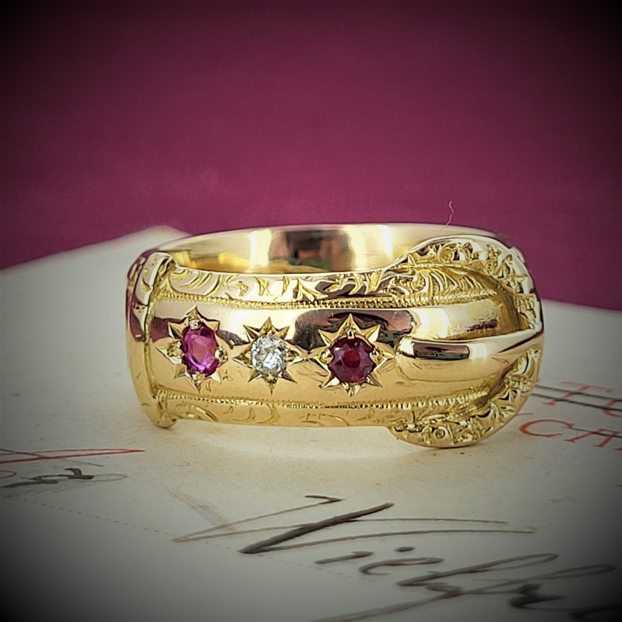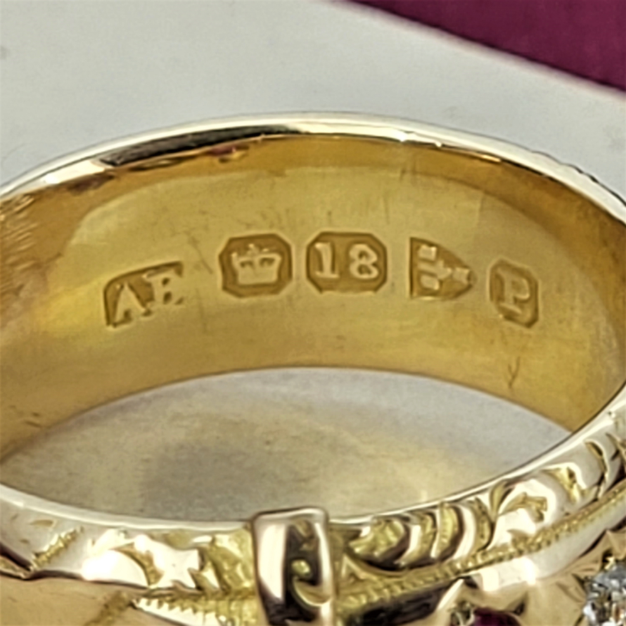 Date 1898! Wow! Just Wow! How we adore this buckle ring in 18ct yellow gold originally hallmarked in Chester in 1898. In sublime conditon and set with hand cut rubies and diamonds this really is a beauty! The belt on the buckle was purposely beaten for effect in its original design and it has been preserved wonderfully. The ring is currently size N and I'm afraid that we wouldn't dare size it. The hallmark is still wonderfully in tact... long may it stay that way!