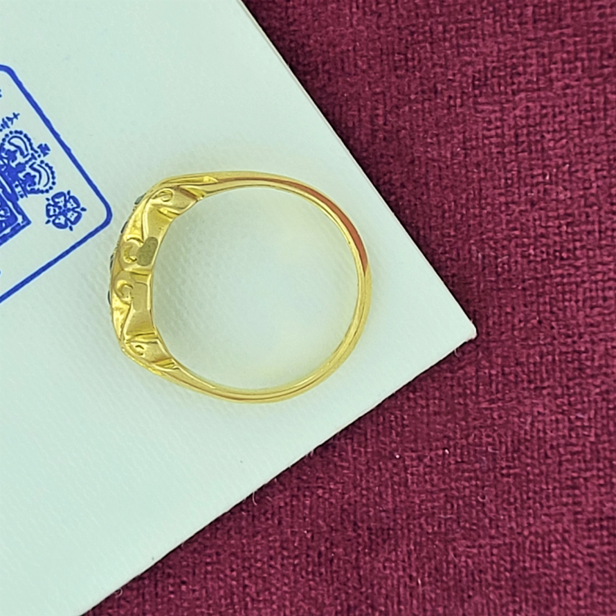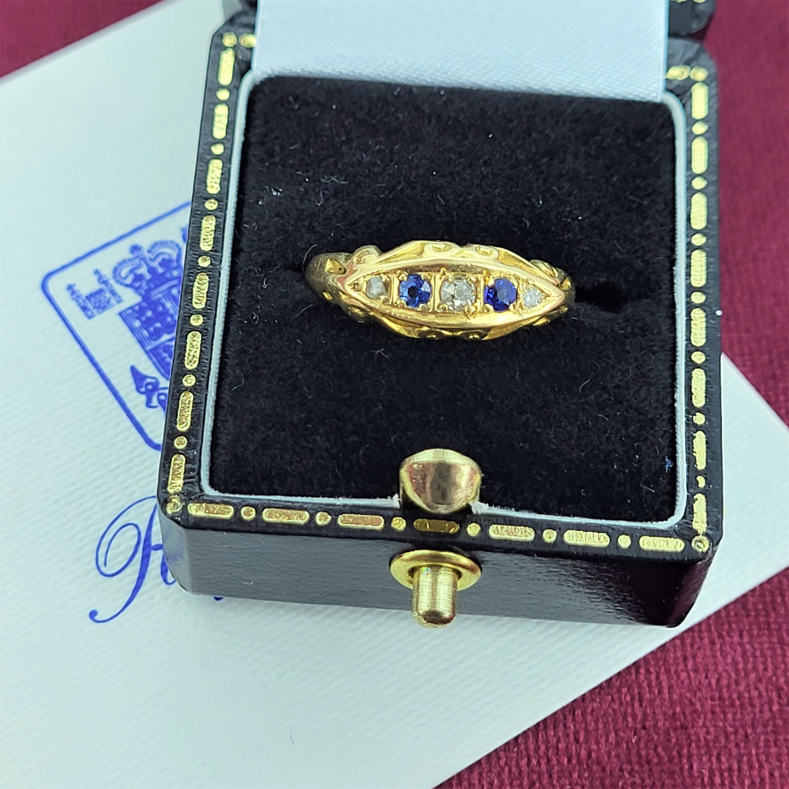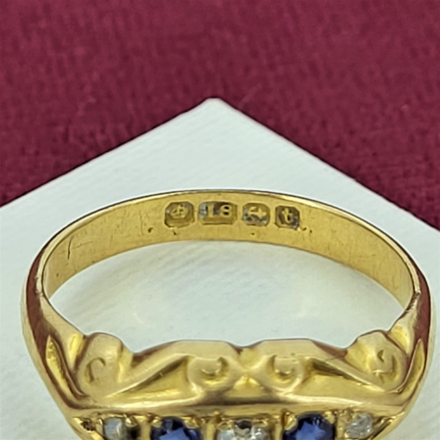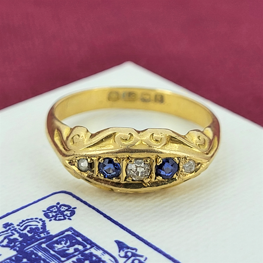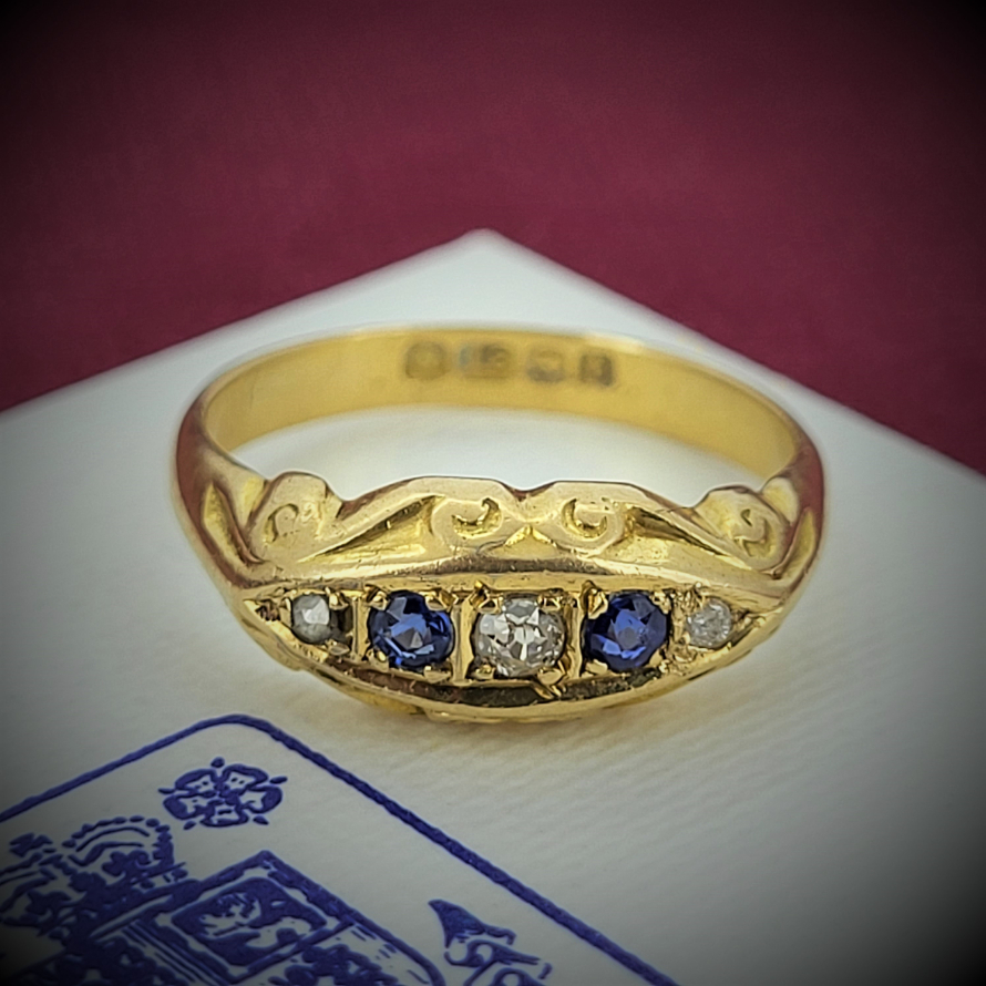 A very cute sapphire and diamond ring traditional of the early twentieth century. The ring is chunky and well preserved. Currently a size K 1/2 and because of the beautifully intact hallmark we're afraid that this ring cannot be sized.