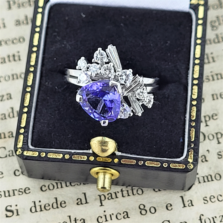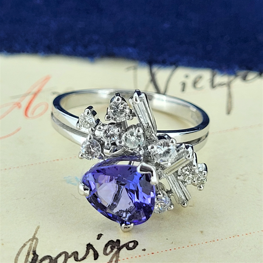 A striking tanzanite and diamond mixed cut cocktail ring! A combination of baguette and round brilliant cut diamonds are individually claw set and randomly suspended besides a soft triangular tanzanite.