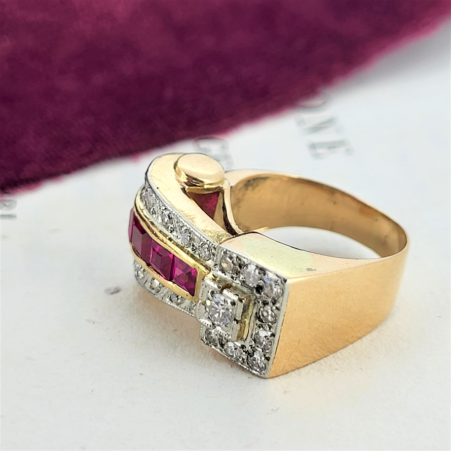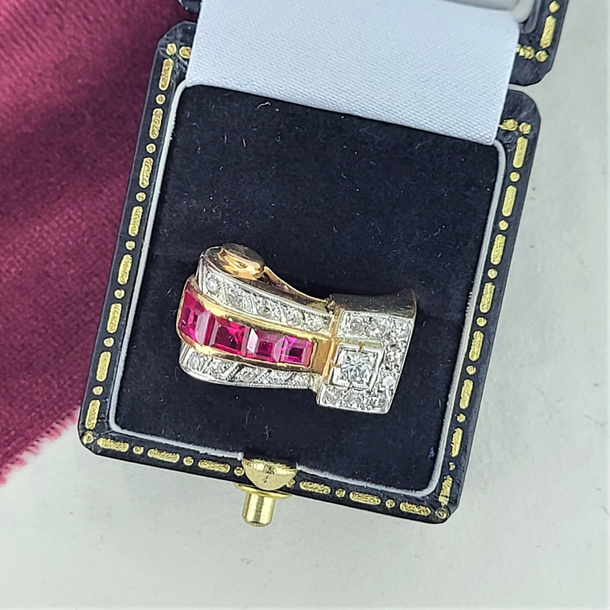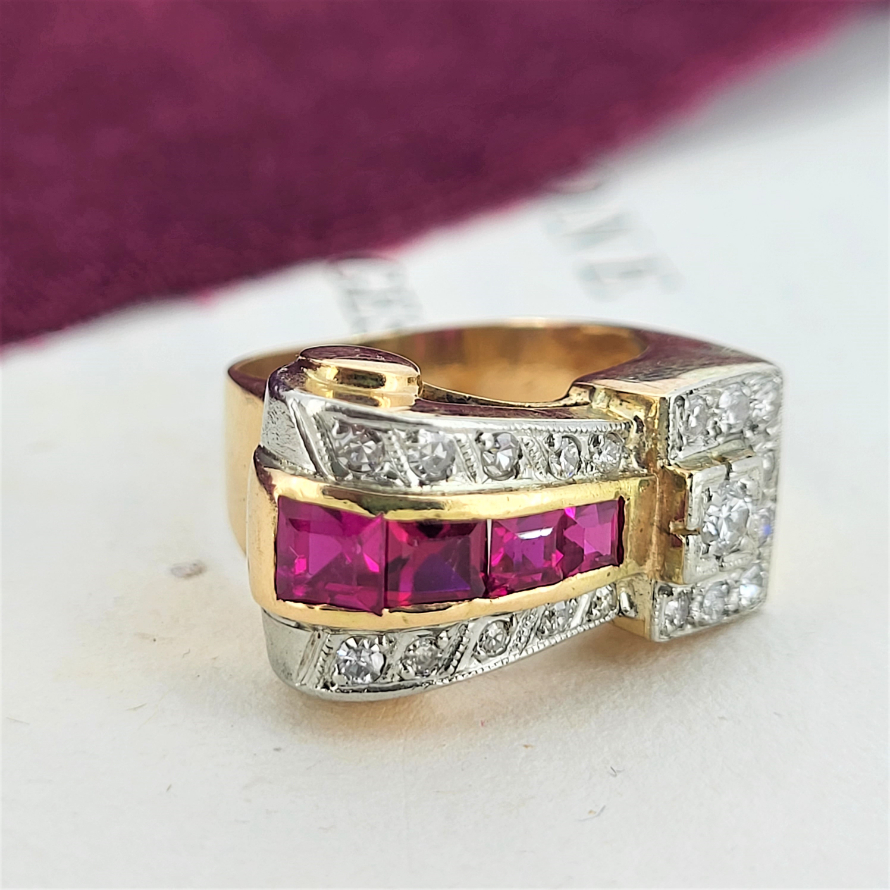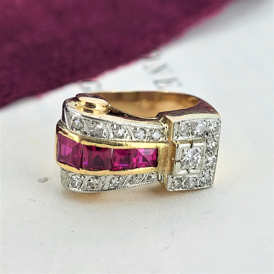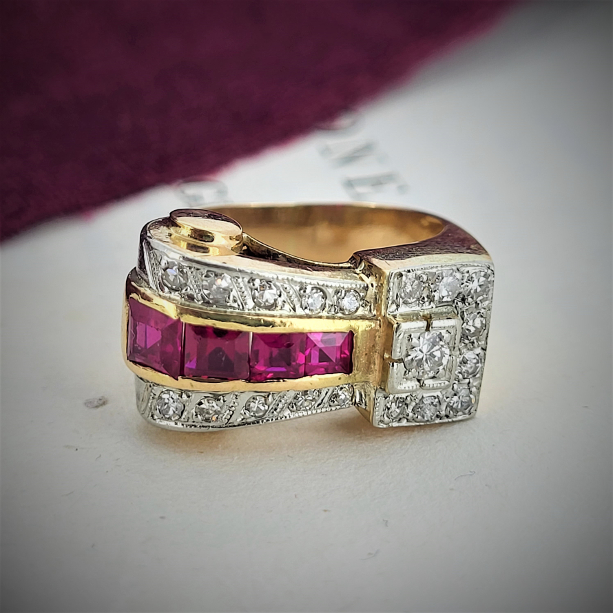 A really striking and rare design. This buckle ring is crafted from 18ct gold with central graduated square cut rubies of exceptional colour and clarity surrounded by round brilliant cut diamonds. More akin to the buckle on a shoe than a belt there is something rather old school aristocrat about this ring. Most suited to the pinky or ring finger. The ring weighs 7.7 grams and is currently size H 1/2. It can be sized a small amount.