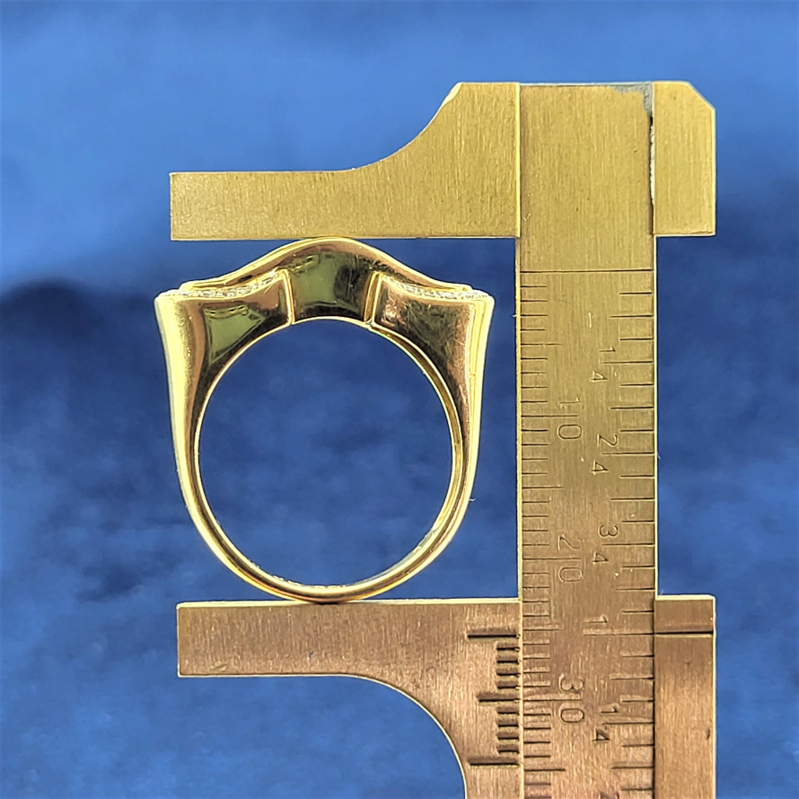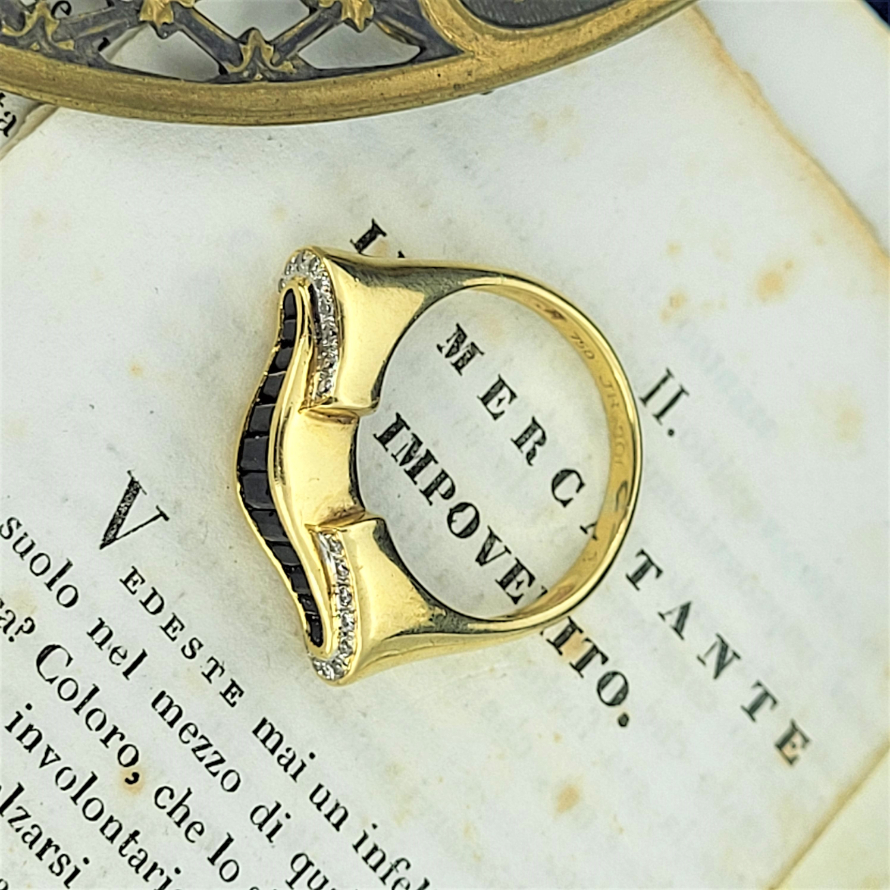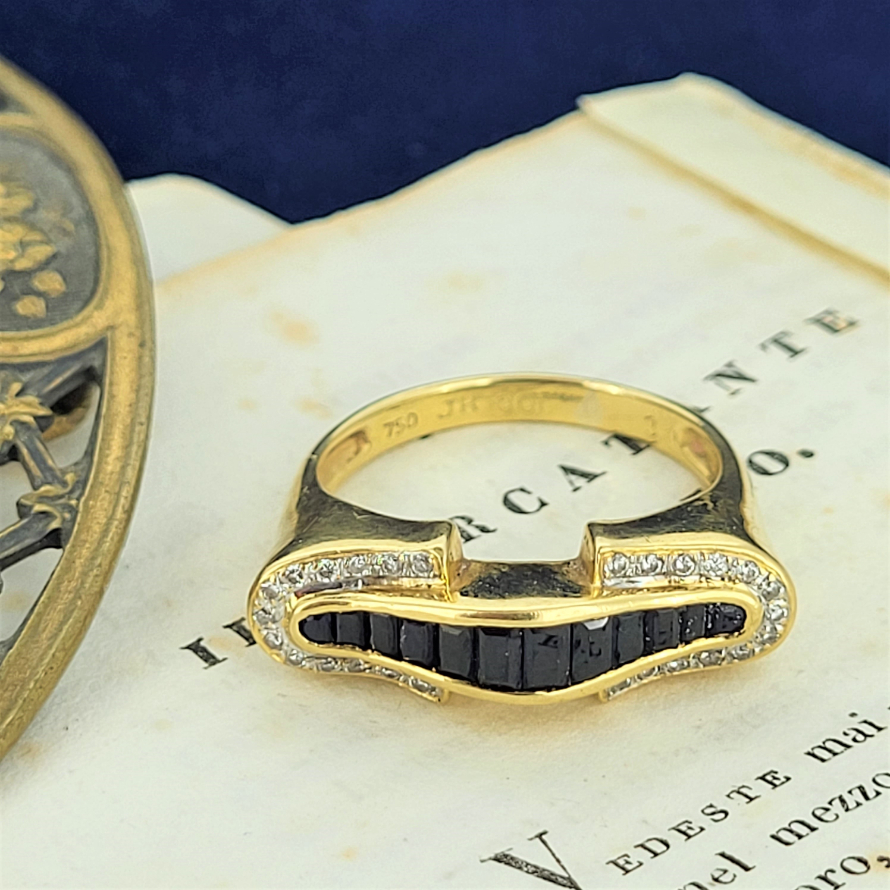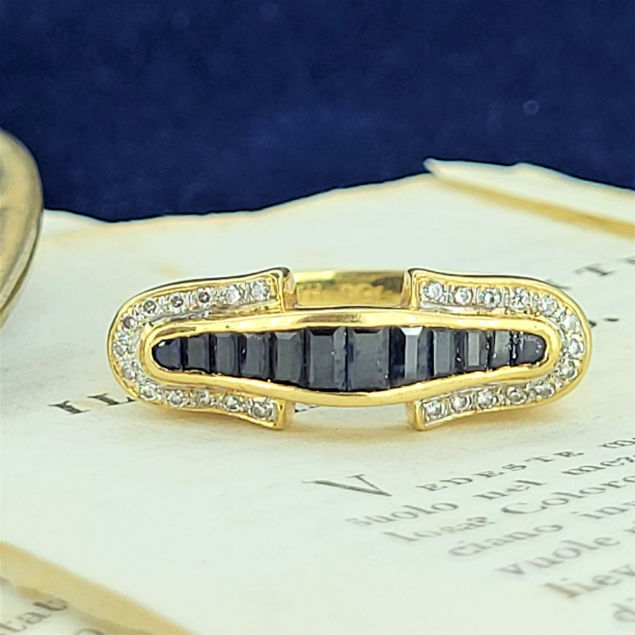 A bold and striking sapphire and diamond dress ring crafted in 18ct. The ring has graduated emerald cut saphires wrapped nicely at either side with round brilliant cut diamonds totalling 0.10ct. The ring weighs 5.7 grams, is currently size P 1/2 and can be sized.