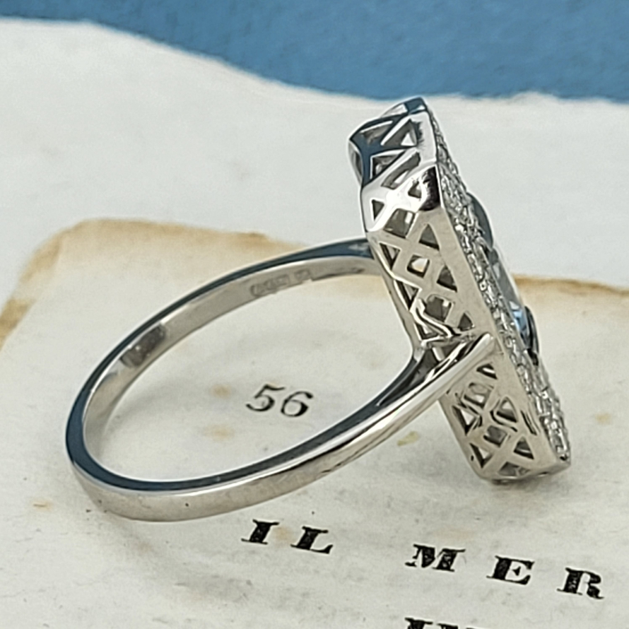 The ring itself measures 28mm by 9mm and is a striking fit on the finger. With an estimated 0.35ct of Diamonds and a rectangular cut Aquamarine weighing in excess of 0.60ct all individually set in Platinum this really is a lovely piece.