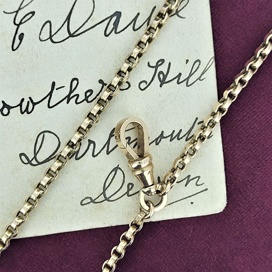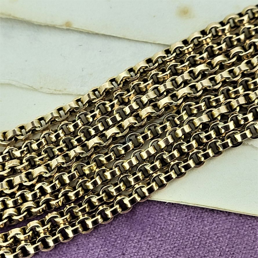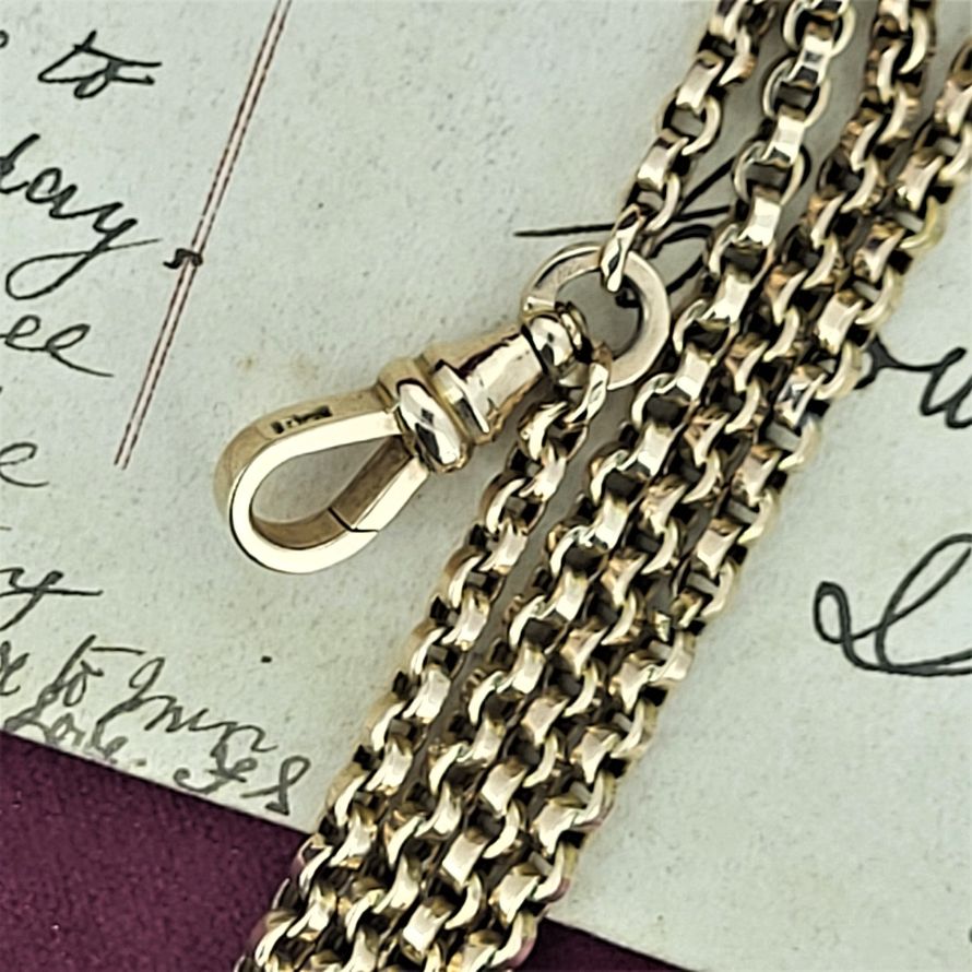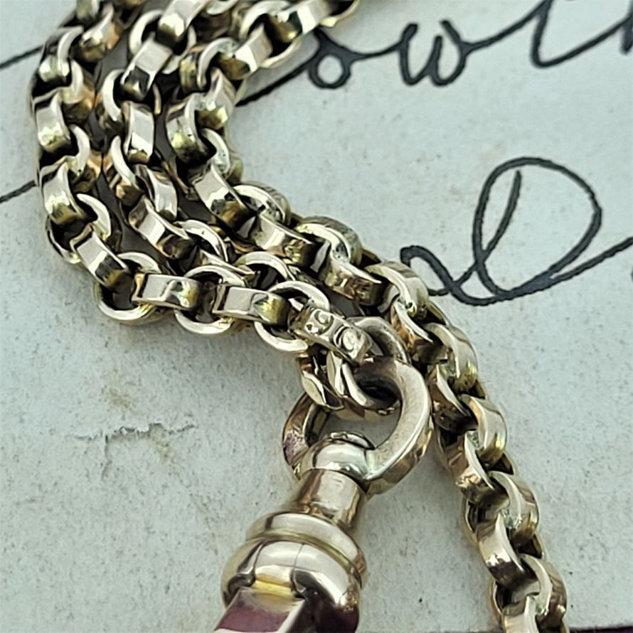A simple and current Victorian Lariat Necklace. Extending to 60 inches in a beautifully smooth belcher link that can be wrapped two or three times (or four at a push) or used to secure some much loved accessories this is a fabulous piece. The necklace has a traditional swivel attached the clasp extending its functionality and ready to go to add your fobs, charms, keys, glasses (or anything that will fit). If ever there was a versatile necklace this is it. The Antique Guard is much loved and this is a fantastic version! The 64 inch necklace is made in a belcher link with a closed loop and a swivel catch. The necklace weighs 38.6 grams and can be worn in a variety of styles. Great versatility! The nacklace is stamped 9c both on its swivel and belcher link (as pictured).