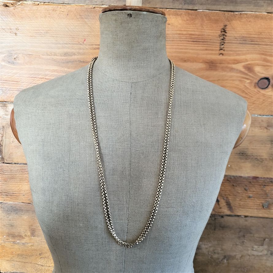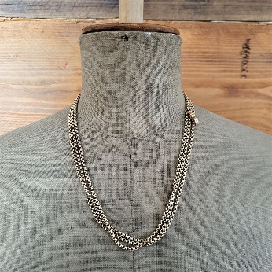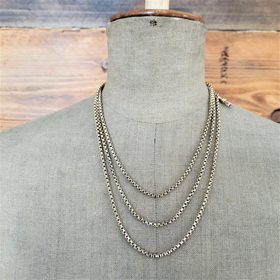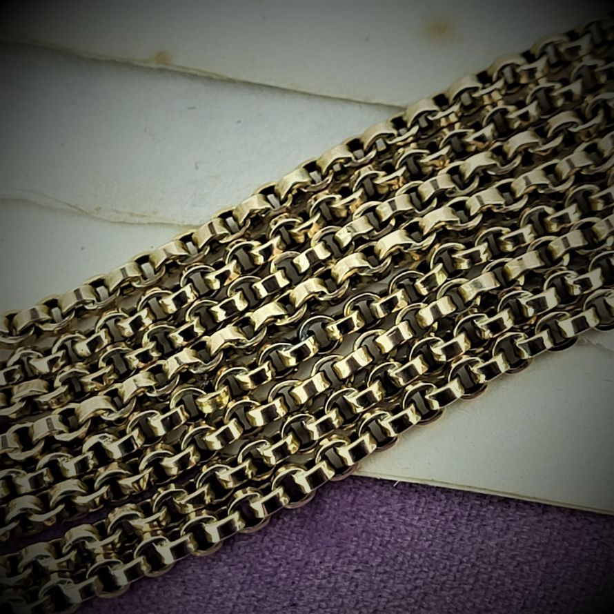 A simple and current Victorian Lariat Necklace. Extending to 60 inches in a beautifully smooth belcher link that can be wrapped two or three times (or four at a push) or used to secure some much loved accessories this is a fabulous piece. The necklace has a traditional swivel attached the clasp extending its functionality and ready to go to add your fobs, charms, keys, glasses (or anything that will fit). If ever there was a versatile necklace this is it. The Antique Guard is much loved and this is a fantastic version! The 64 inch necklace is made in a belcher link with a closed loop and a swivel catch. The necklace weighs 38.6 grams and can be worn in a variety of styles. Great versatility! The nacklace is stamped 9c both on its swivel and belcher link (as pictured).