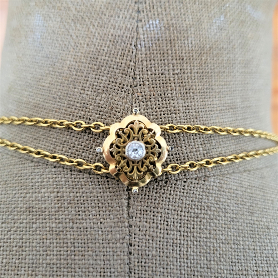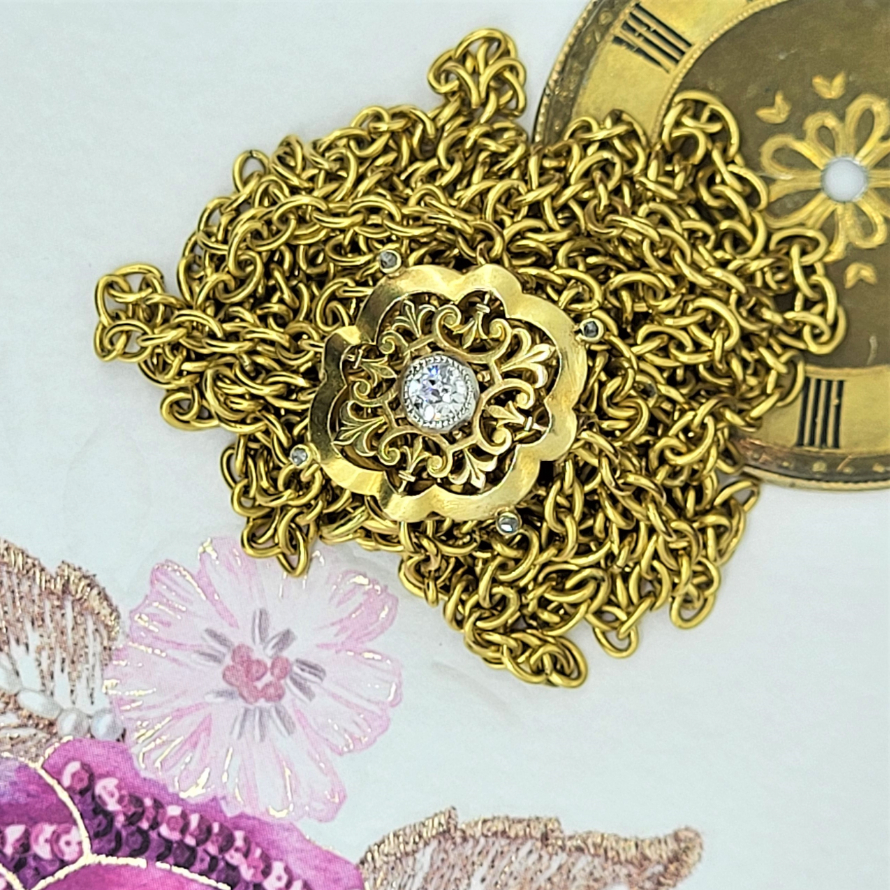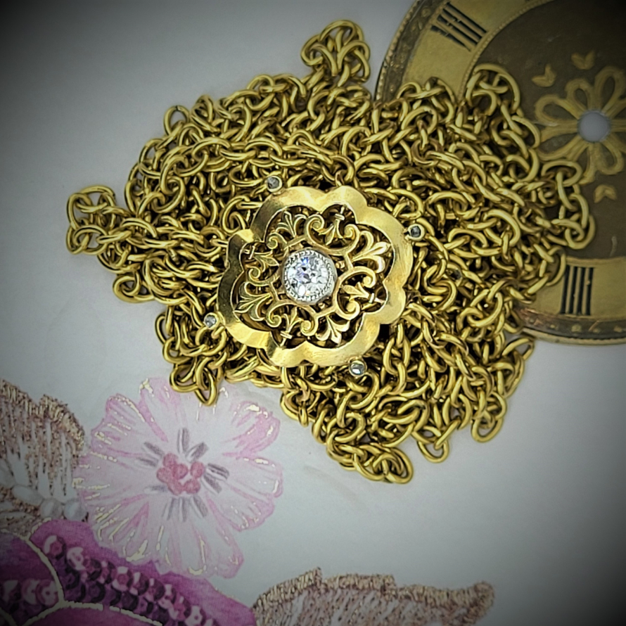 The Necklace measures 66 inches in length with a beautiful adjustable 18ct Gold and Diamond clasp. The detail on the clasp is exquisite and centre's around a central old European cut 0.20ct Diamond.