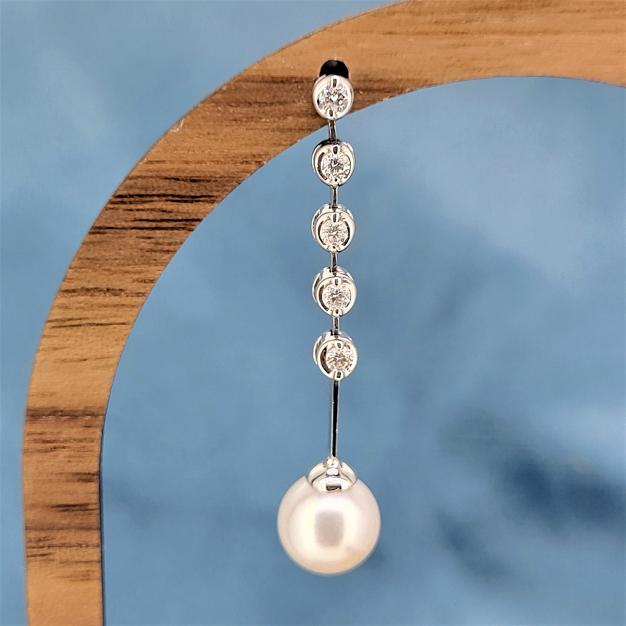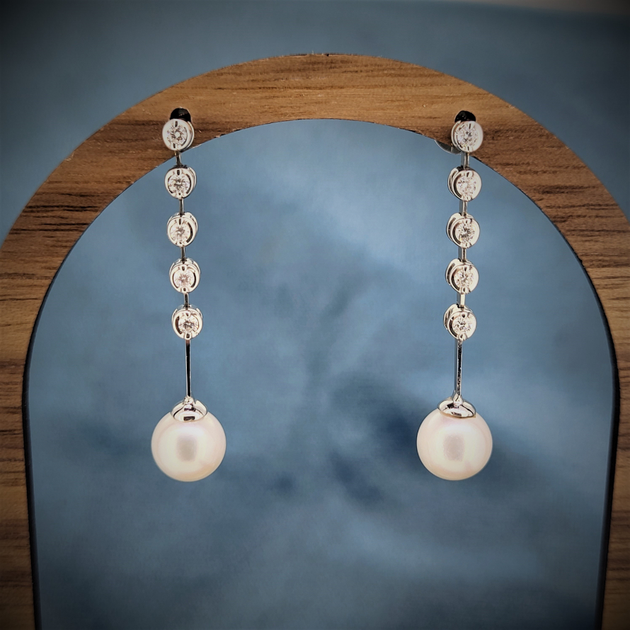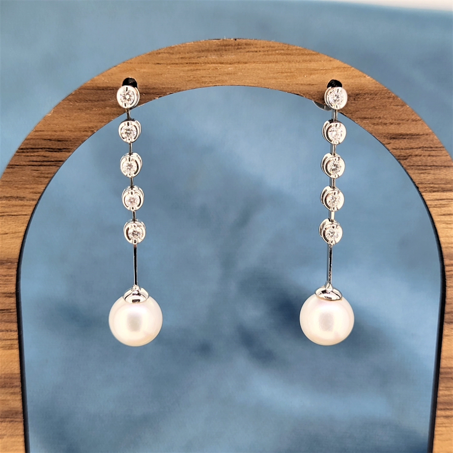 Set in 18ct white gold these pearl and diamond earrings are elegant, slimline and striking. Each hangs 35mm from the lobe and is set with 5 evenly spaced round brilliant cut diamonds leading to a 7mm cultured pearl. The diamond weight is estimated at 0.20ct total and the earrings weigh just under 2 grams each.