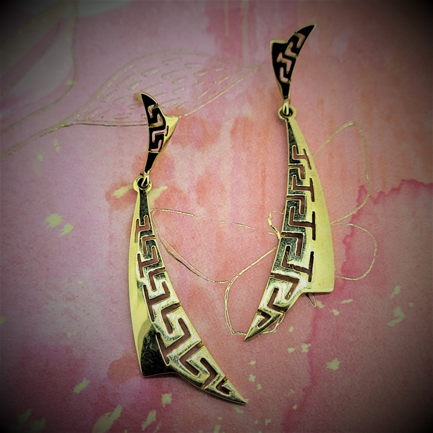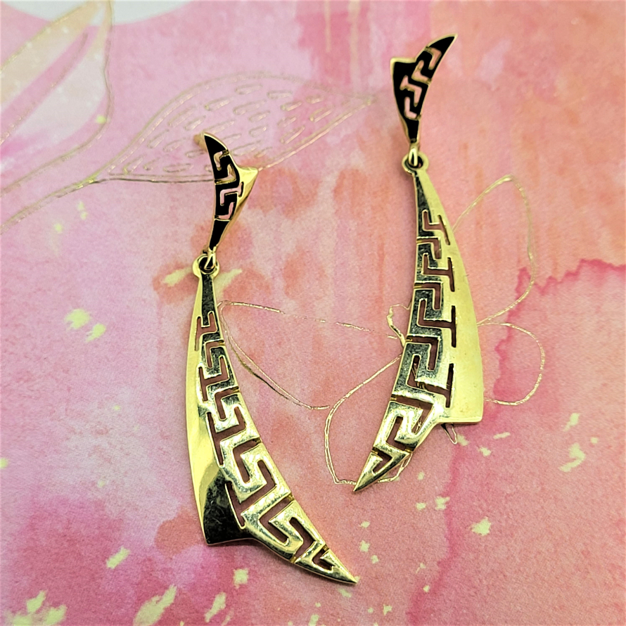 14ct Greek style drop earrings. Weighing 3.9grams in total and measuring 50mm from top to bottom these are a lovely pair of striking earrings that will jazz up any outfit.