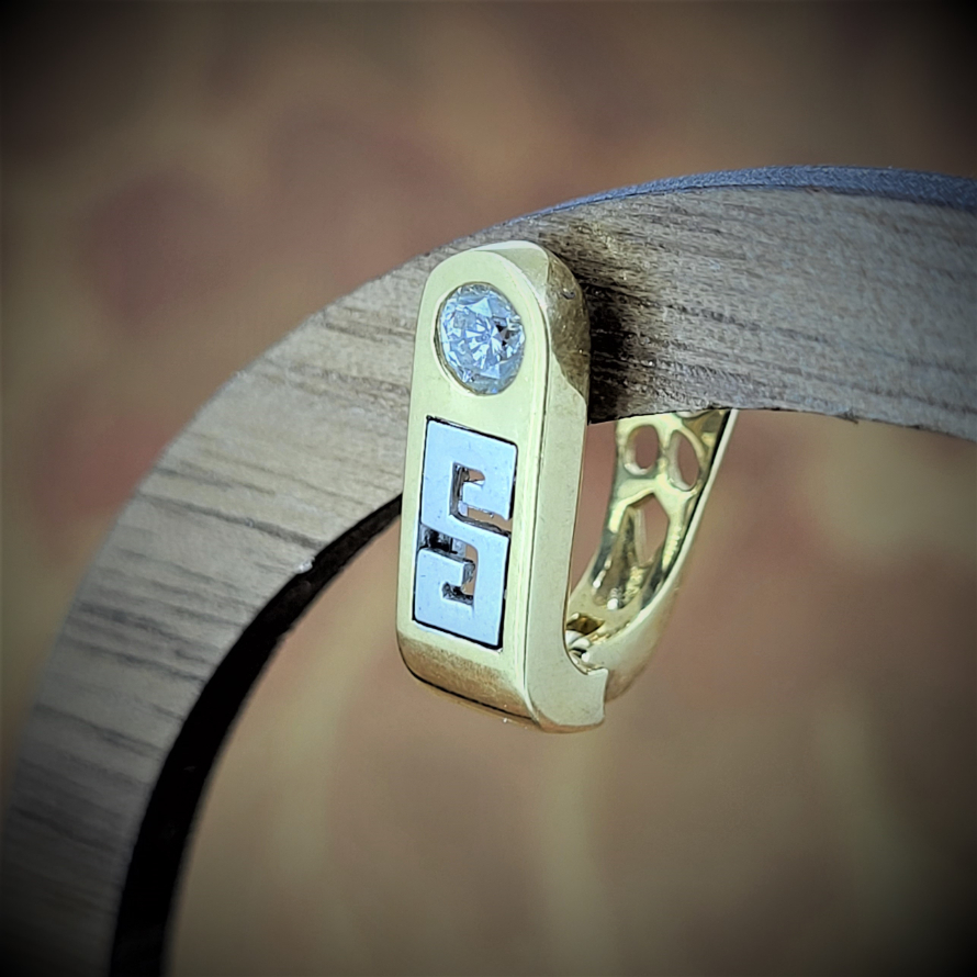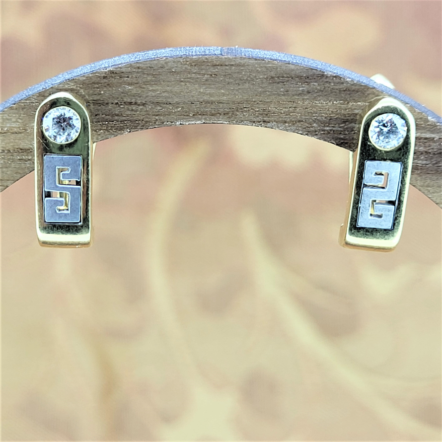 A Greek style clip earring that is simple, elegant and beautiful. The Greek key is inset in matt white gold, above which sits a round brilliant cut diamond weighing an estimated 0.10ct. All encased in 18ct yellow gold. The earrings measure 14mm by 5mm.
