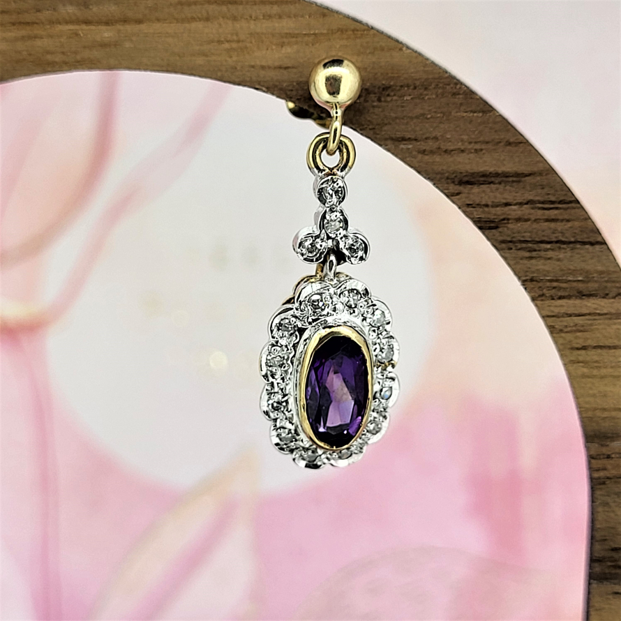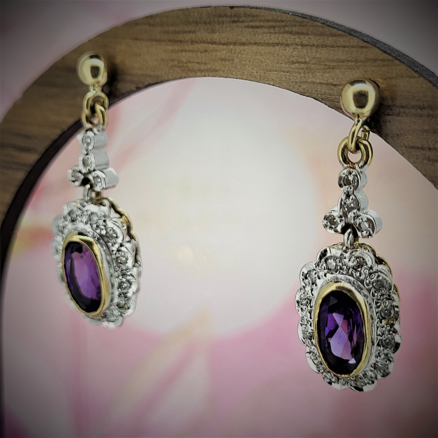 These are your traditional drop cluster earrings. Set with a central amethyst and surrounded by round brilliant cut diamonds illusion set in white gold. The main cluster is suspended on a small diamond set bail with typical butterfly fittings. They hang 2.5cm from the piercing.