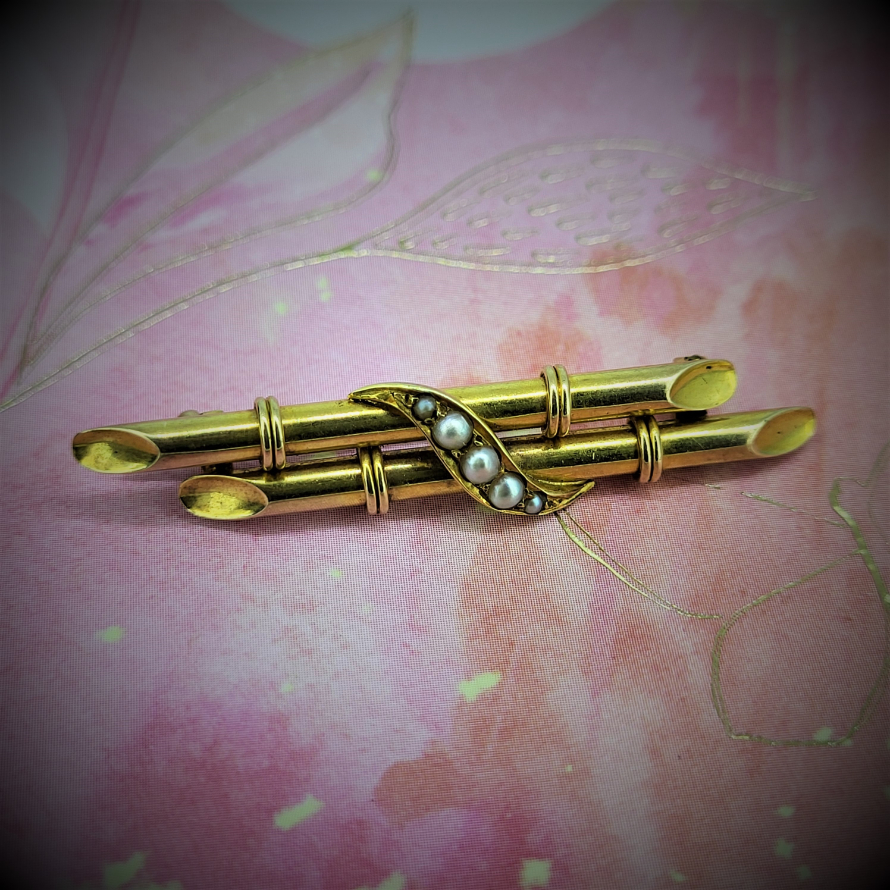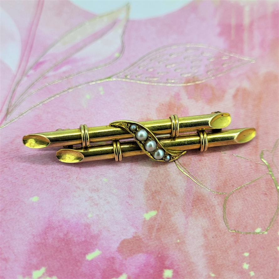Two identical 15ct gold bars, slightly offset, are connected by a 15ct gold piece set with graduated seed pearls. Measuring 45mm and weighing 2.8 grams.