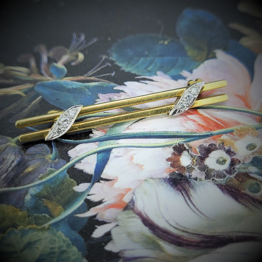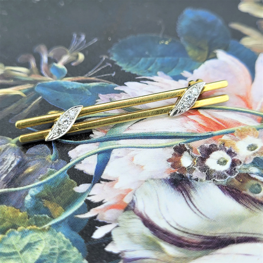 Manufactured by Payton Pepper and Co. Ltd this double 18ct bar brooch is connected by two symmetrical panels of diamonds set in 18ct white gold. A simple design measuring 46mm and fully hallmarked.