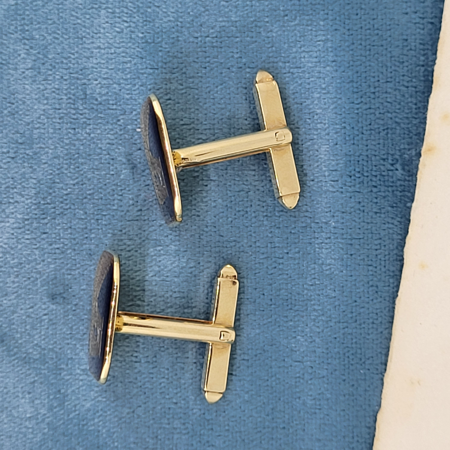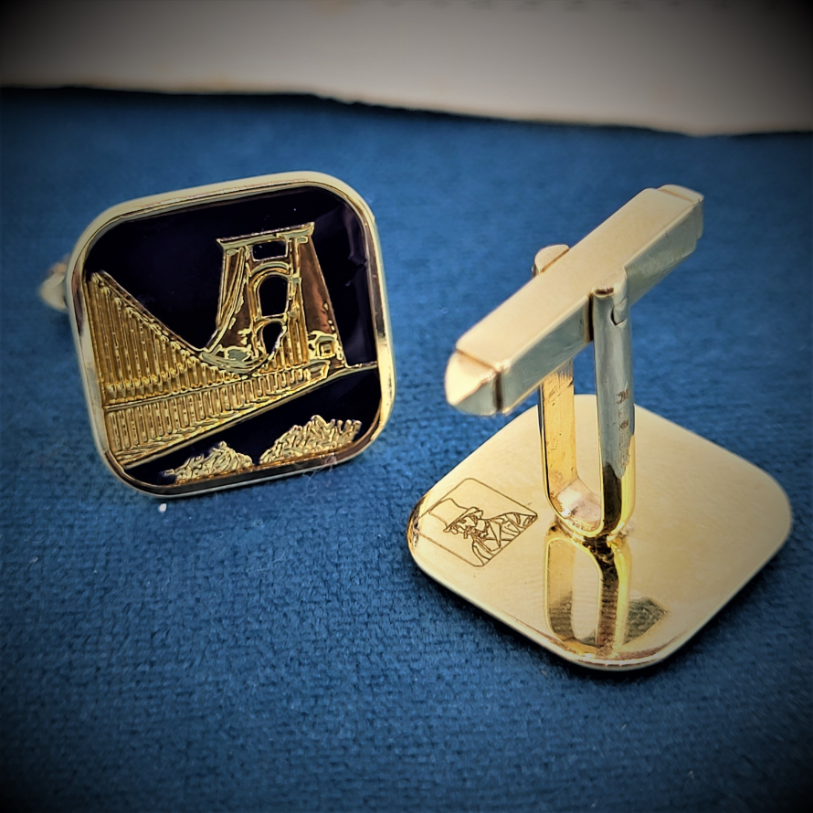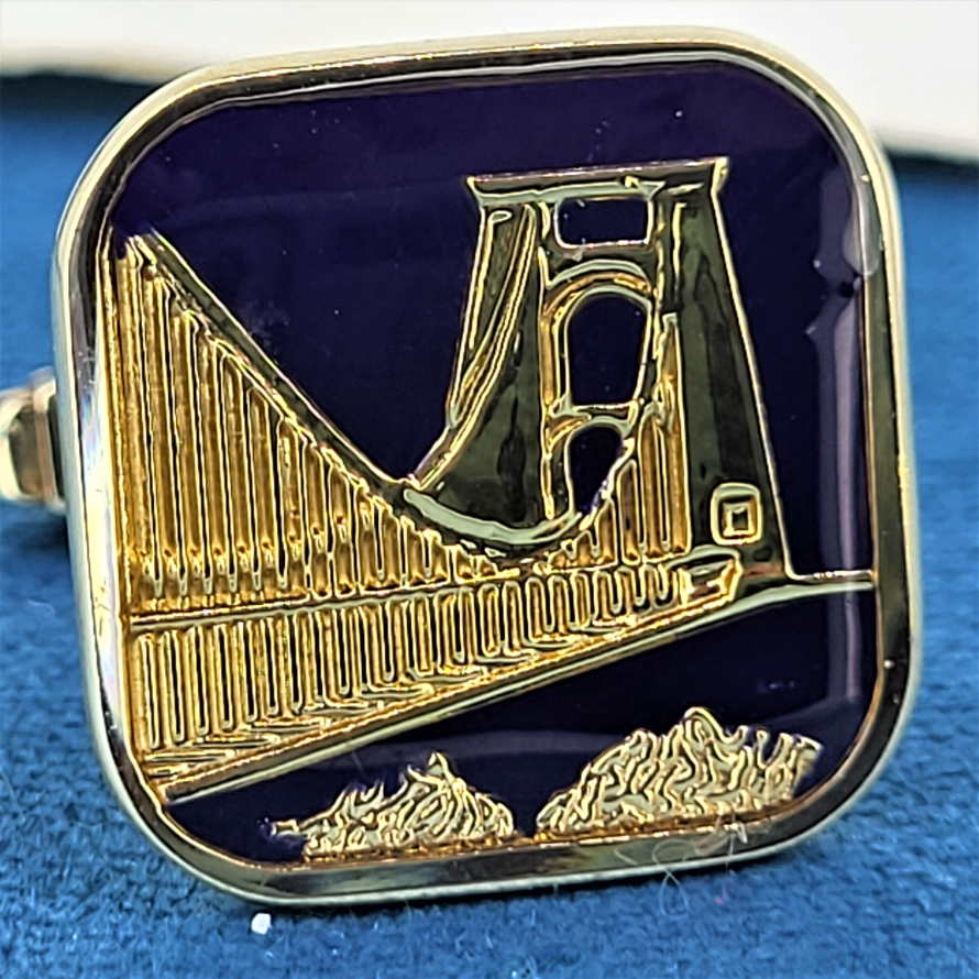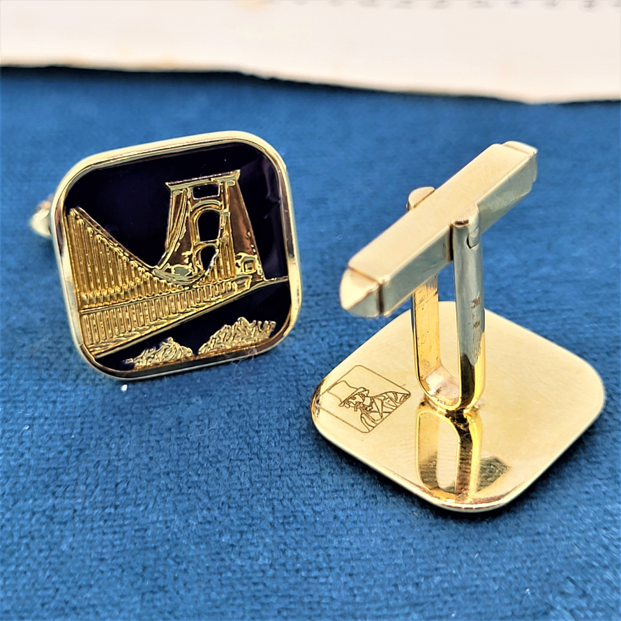 The square cufflinks feature the Golden Gate Bridge in 9ct gold surrounded by fabulous deep blue enamel. They measures 17mm by 17mm and have the classic U-arm fittings. Hallmarked 9ct gold and weighing just over 8 grams these are beauties.