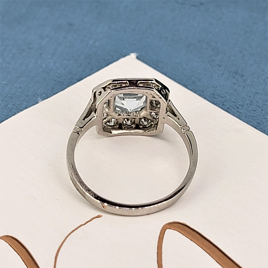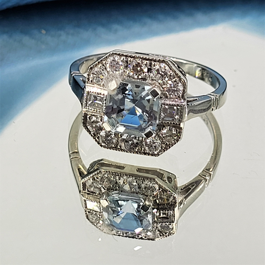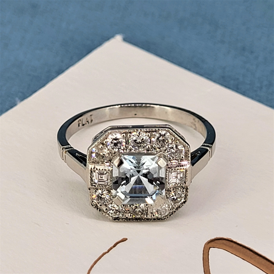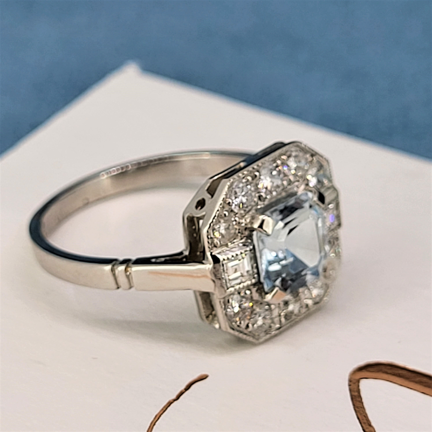 A truly striking ring that brings all the features of the deco period to life. Crafted in Platinum the ring features a central Ascher Cut Aquamarine weighing 0.80ct and measuring 6.5mm by 6.5mm