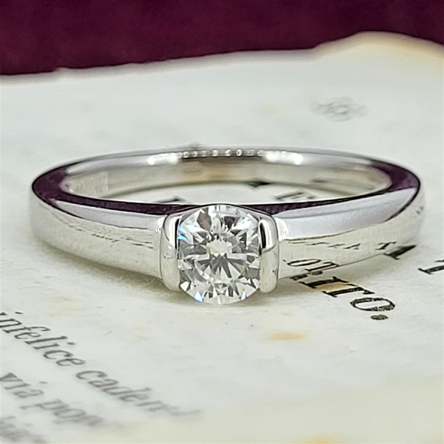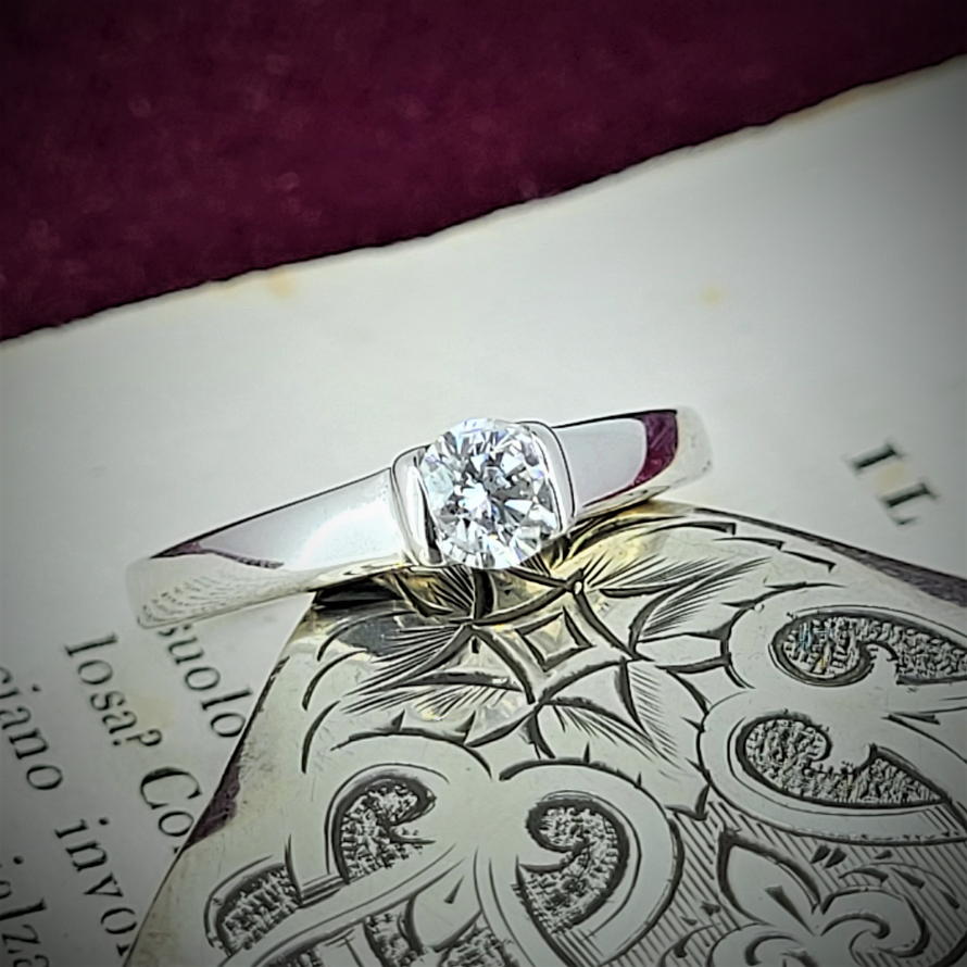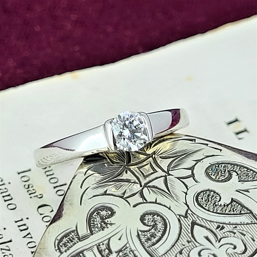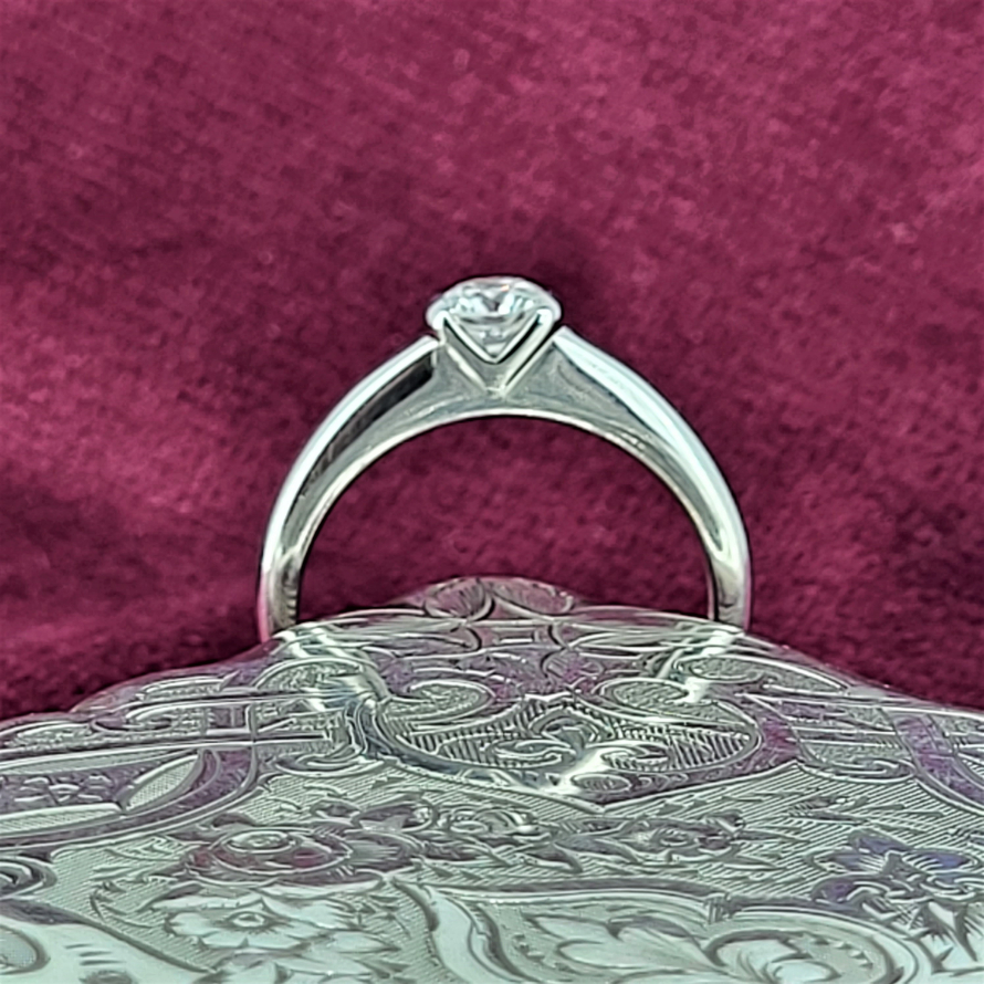 A beautifully sparkly 0.33ct diamond is tension set in a solid and weighty 18ct White Gold shank. The shank is slightly graduated measuring 3mm where it meets the diamond gradually reducing to the more traditional 2mm width. The diamond itself is tension set in a V style setting that sits 0.50cm above the finger. Unusually this ring is cast in a single piece adding weight and durability to a beautiful ring.