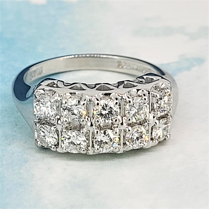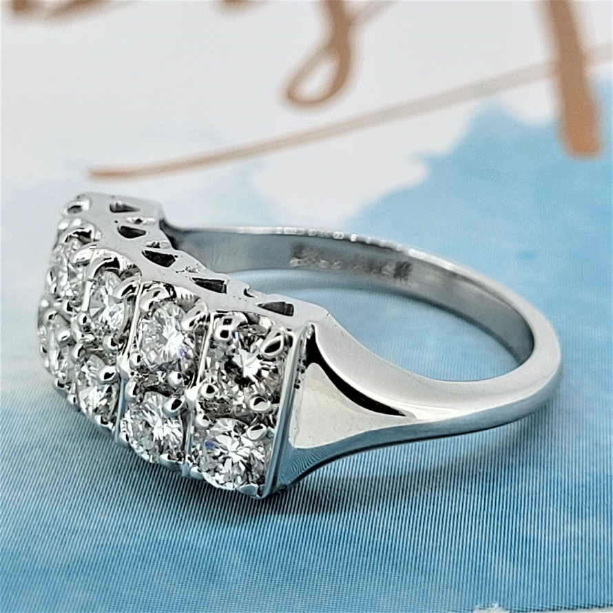 Originally designed by Exquisite this is a vibrant double half eternity with a total carat weight of 1.00ct. Set in 14ct white gold the diamonds measure 0.10ct each and the ring consists of two rows of five individually set diamonds. Its particularly impressive on the finger. The ring is currently size L and can be sized to fit.