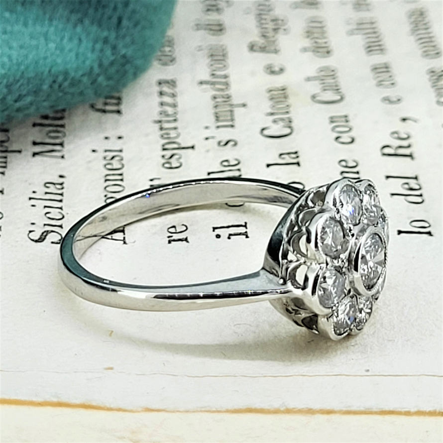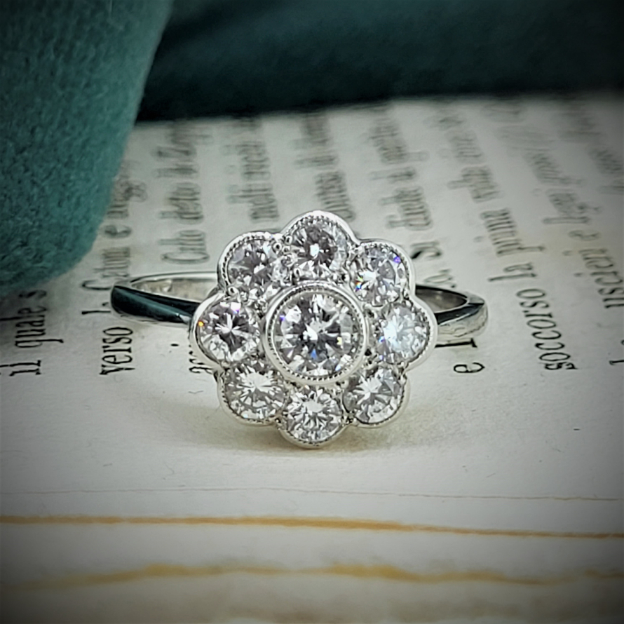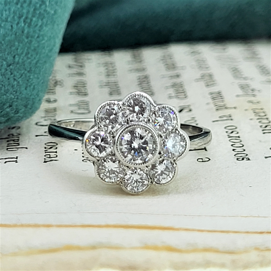 A Traditional Diamond Daisy Cluster crafted in Platinum. The central 0.50ct Round Brilliant Cut Diamond is surrounded by eight additional Diamonds with a total carat weight in excess of 1.50ct. Each Diamond is channel set with a milled edge design which adds wonderfully to its brilliance.