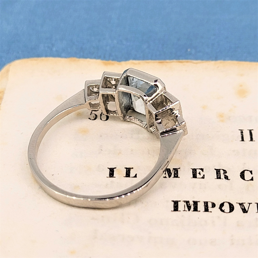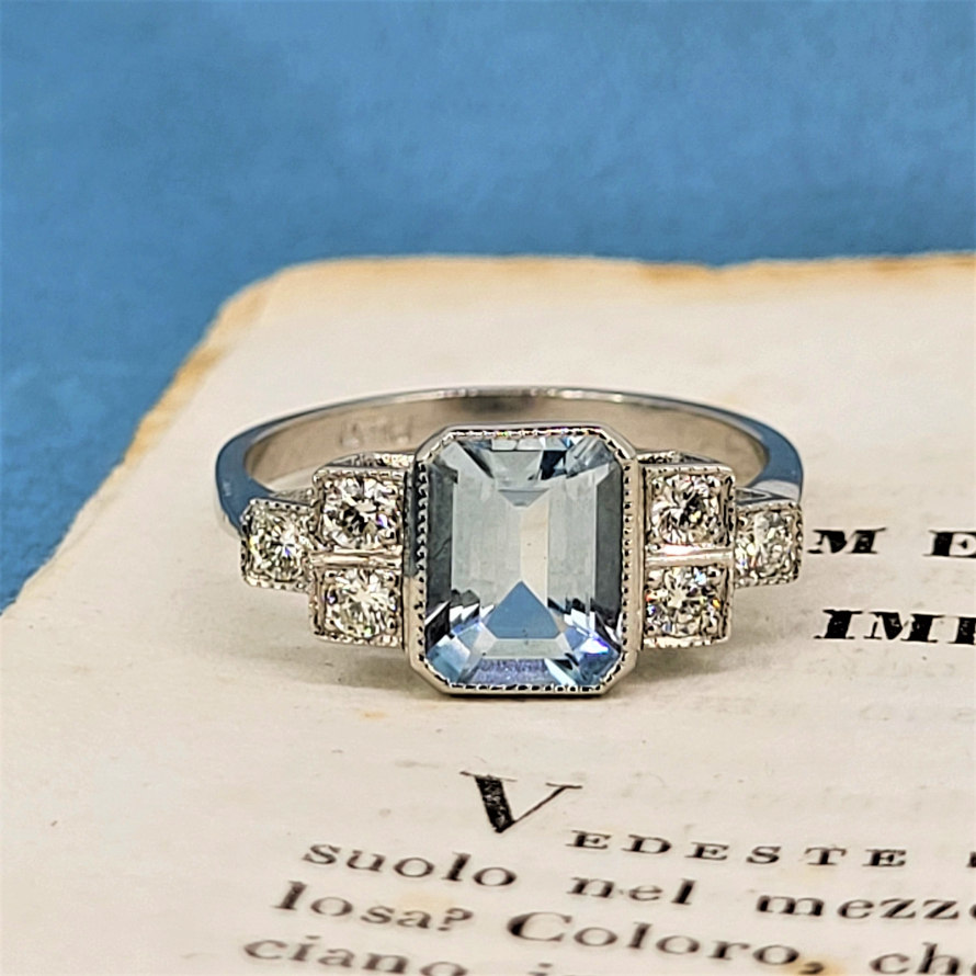 A beautifully made Art Deco Reproduction Ring. The ring features a striking Emerald Cut Aquamarine. On each shoulder there are three round brilliant cut Diamonds arranged in the traditional deco period step design with a total diamond weight of 0.20ct
