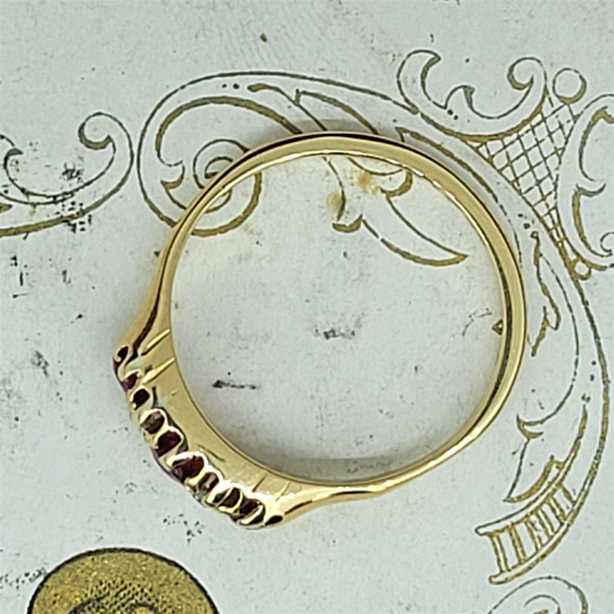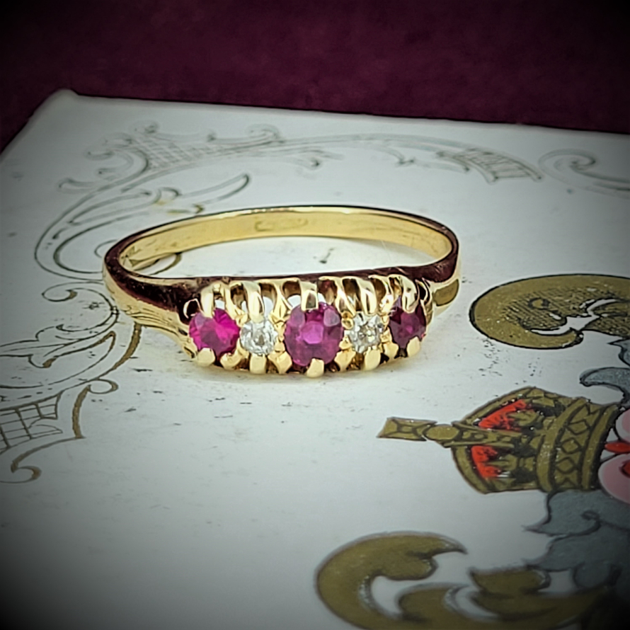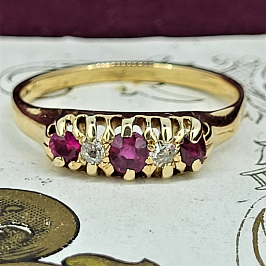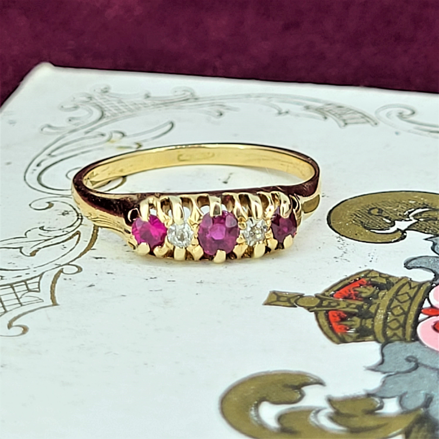 This is a lovely example of a traditional ruby and diamond five stone ring dating back to the early 20th century. You can see the detail of the hand cut stones and the rubies have a lovely, vibrant colour, free from heat treatment. The shank has been replaced over the years but there remains a very feint stamp indicating that the ring is 18ct. The good news about no full hallmark is that the ring can be sized! Currently a Size L.