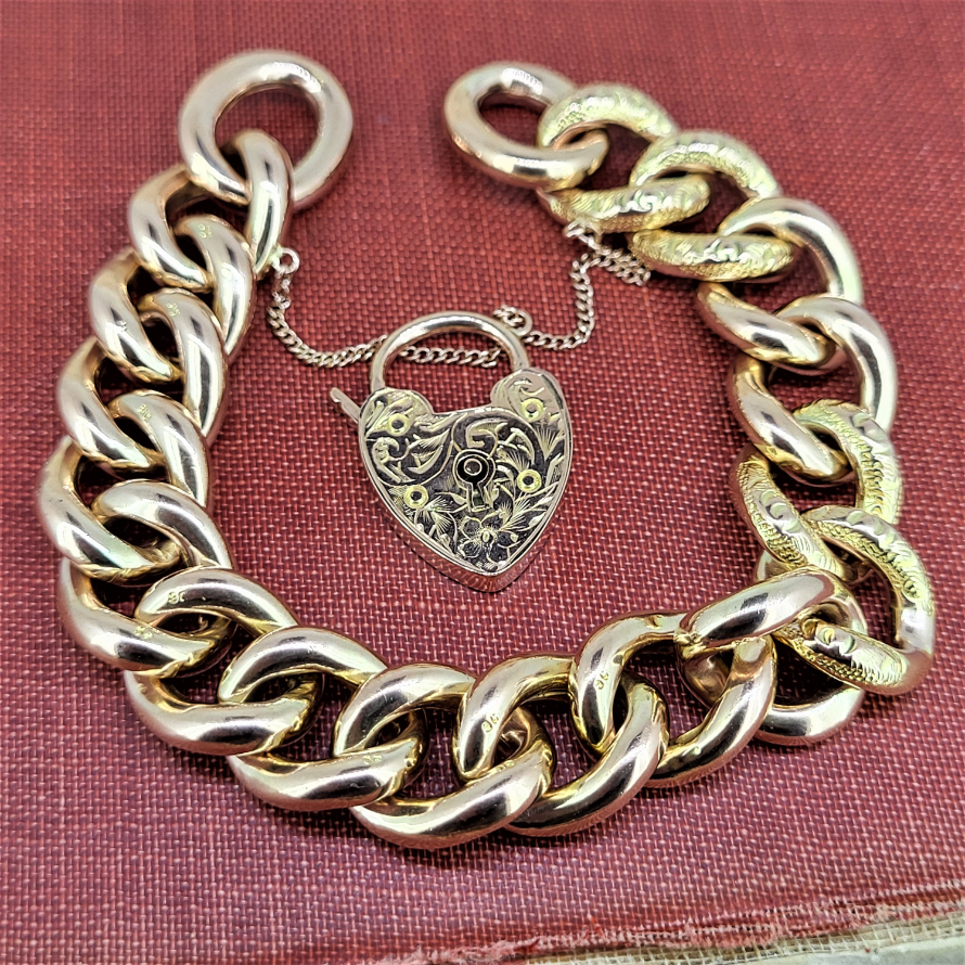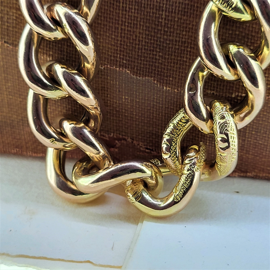 Each hollow link measures 14mm and is individually stamped as 9ct. Intricate engraving, popular at this time runs throughout the bracelet in a pattern of two links without engraving following two links with engraving. A nice change from the simple tradition of alternate links.