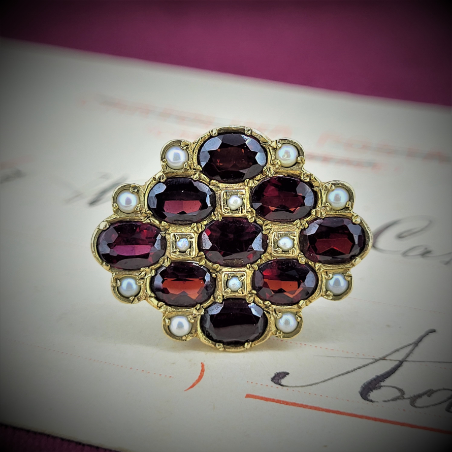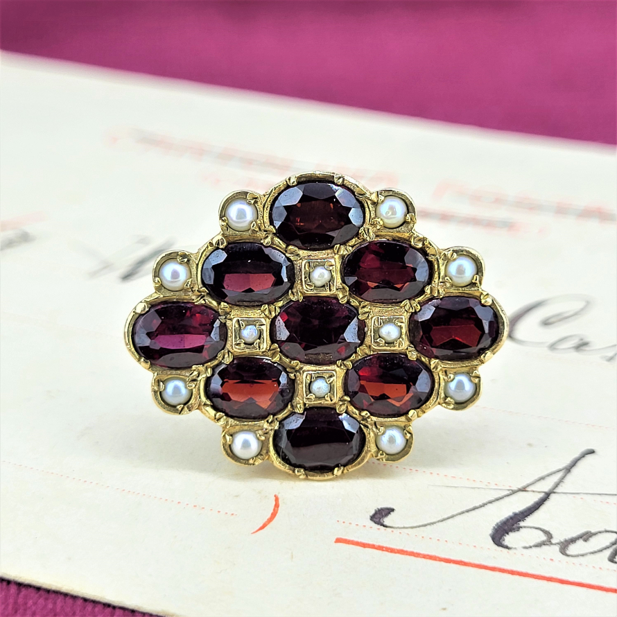 Each of the nine Garnets measure 7mm by 5mm and are accented by wonderfully articulated Seed Pearls.