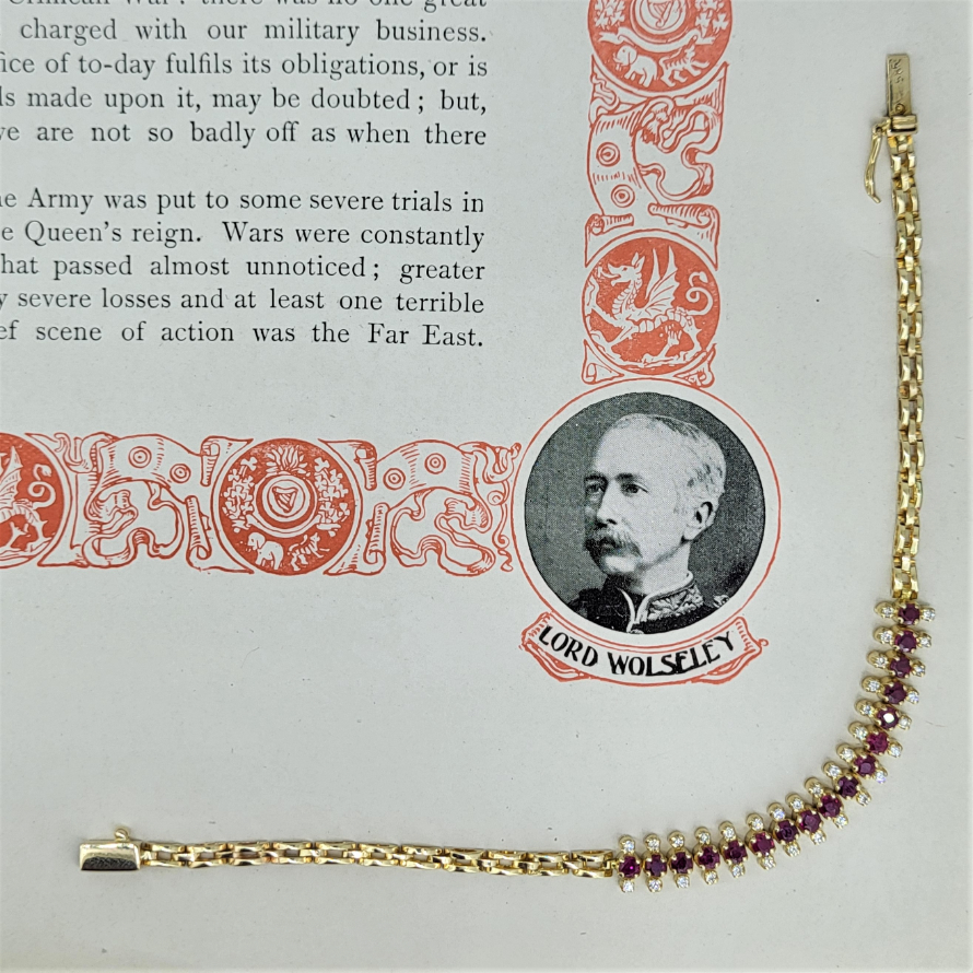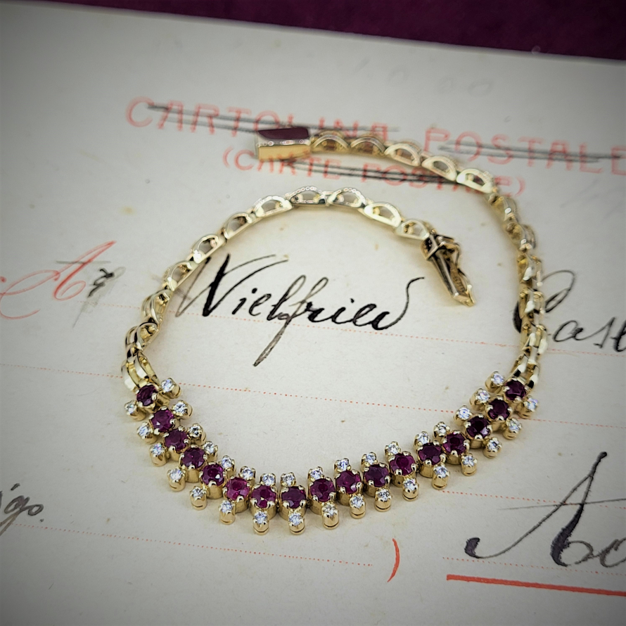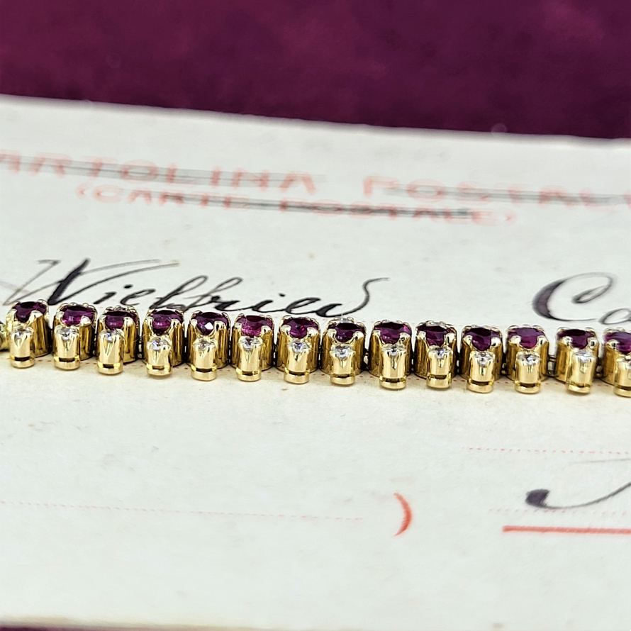 This is such a beautiful piece! The bracelet is stamped 14ct gold and measures 17cm in length making this a wonderfully different, elegant and striking piece. Round rubies are sandwiched between diamonds (34 in total), all claw set. The rubies are each 2.5mm and a deep, rich red. This really is a beautiful dainty piece. It weighs 8.40 grams.