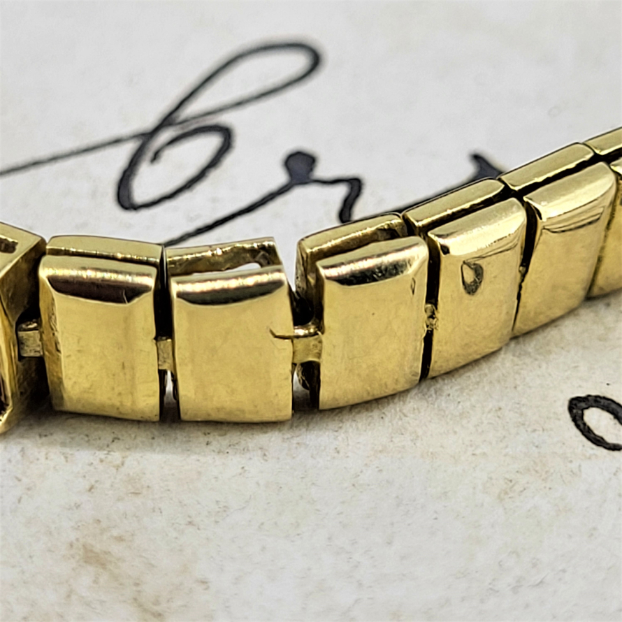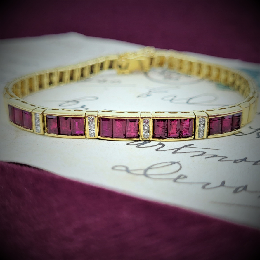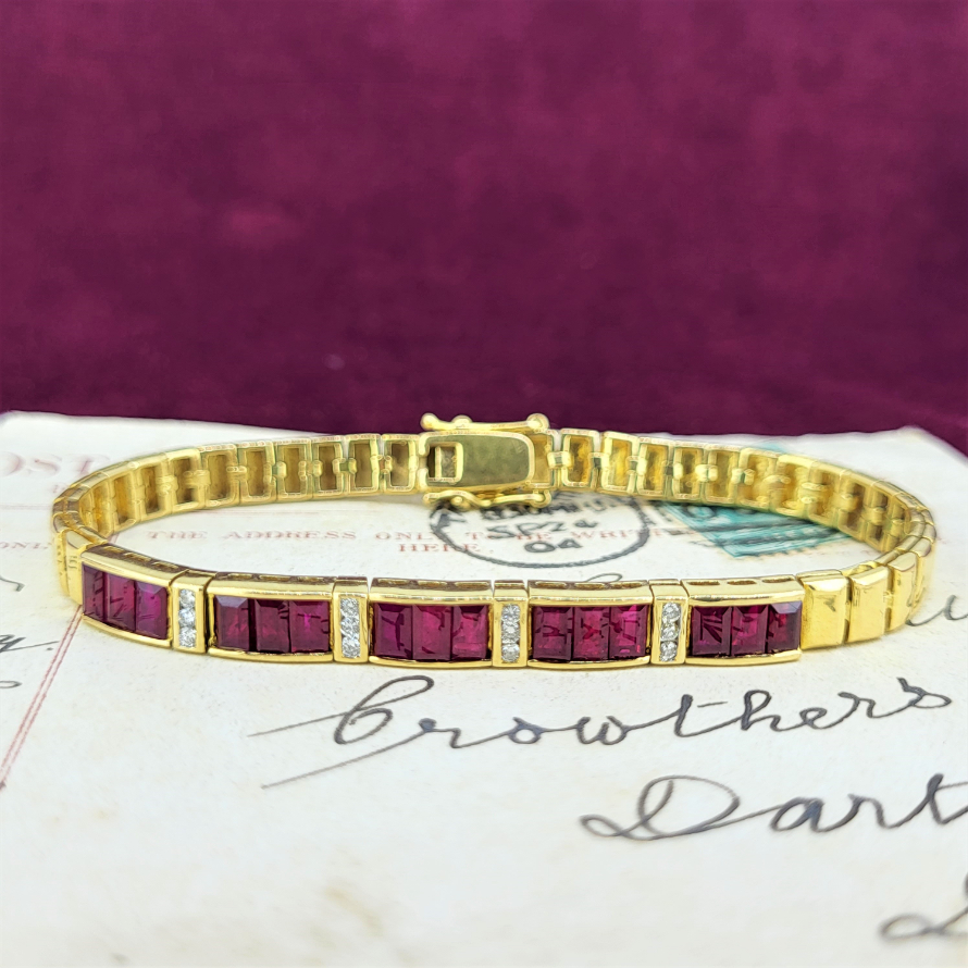 Damaged can still be lovely and there is no finer example than this delightful ruby and diamond bracelet. You can see in the pictures that one of the gold links has a slight kink that cannot be repaired (factored into the price) but we just could not bear to recycle this beauty. Your wrist and the environment will thank us. Stamped 18ct and measuring 17cm in length this really is a divine bracelet. The bracelet is set with panels of vibrant baguette rubies separated with discreet rows of round diamonds. All channelled into a 5mm setting. We love it! The bracelet weighs 18.3 grams. The rubies measure 4mm by 2mm each and the diamonds have a 1.5mm diameter.